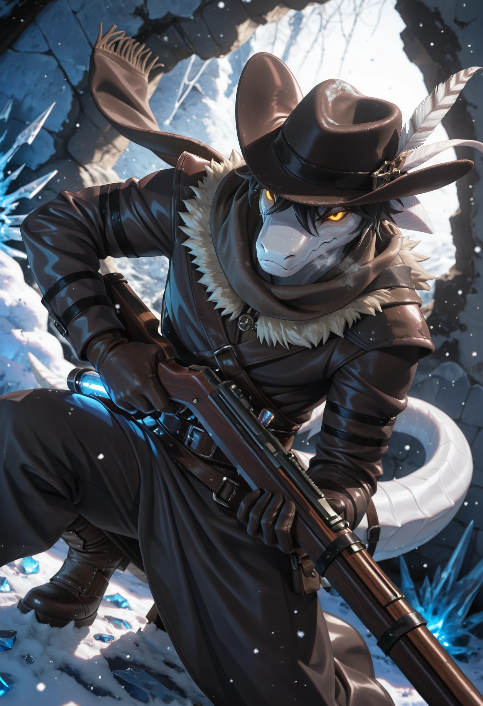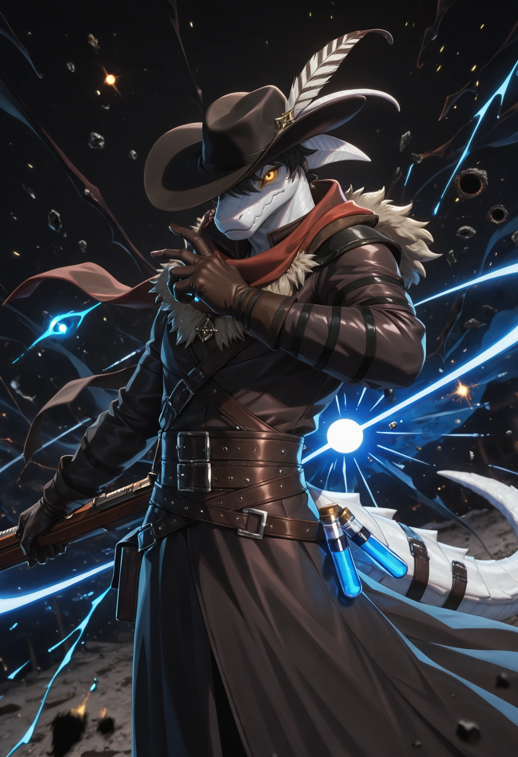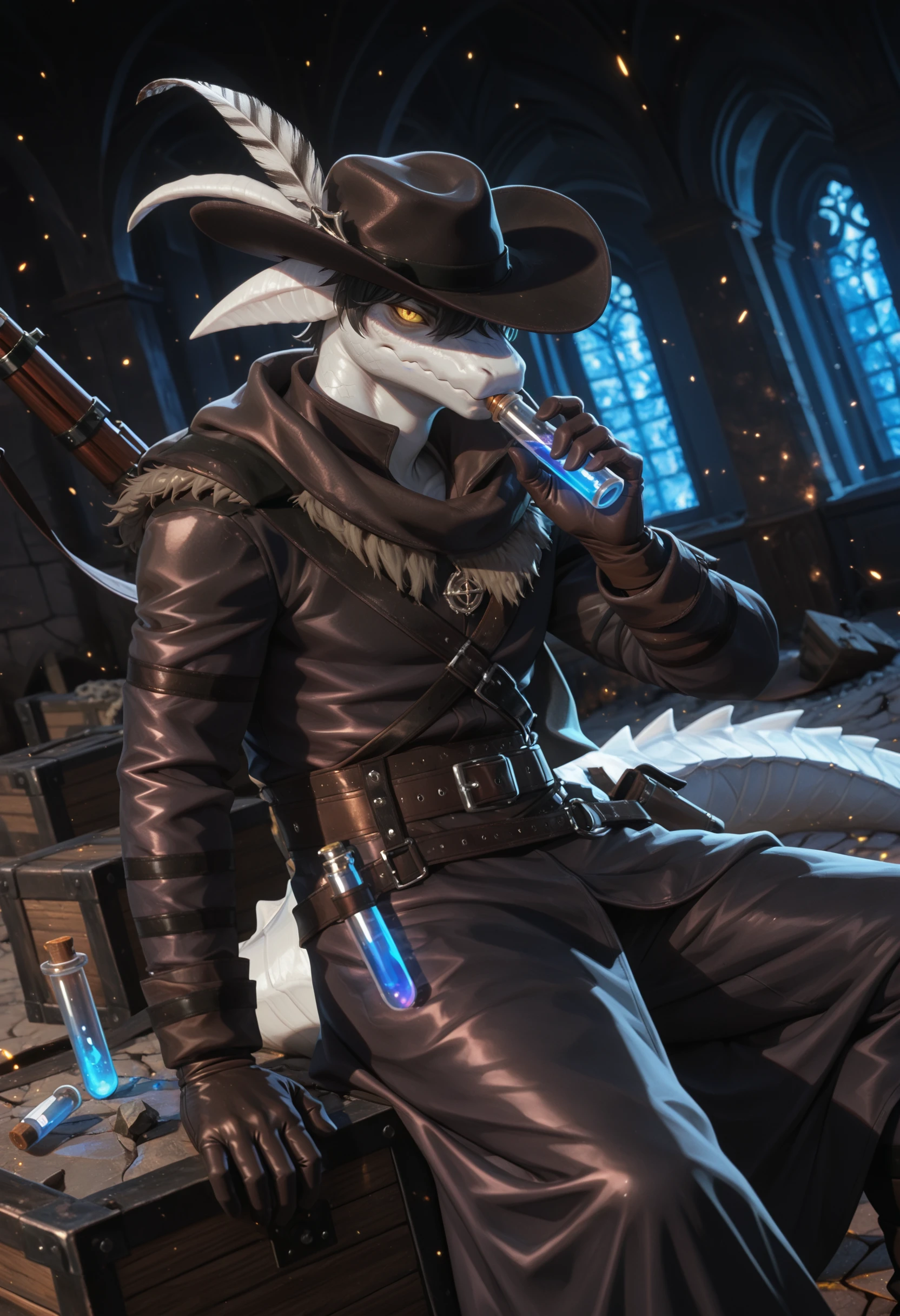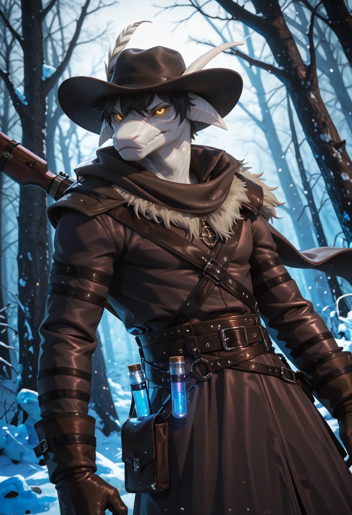 lac3rta_shap3_of_dr3ams, lizard, animal ears, horns, anthro, 1boy, solo, hi res, furry male, black hair, male, furry, yellow eyes, yellow sclera, tail, looking at viewer, scalie, clothing, hat with feather, gloves, belt, coat, scarf, blue glowing vial, looking at viewer, fur trim,