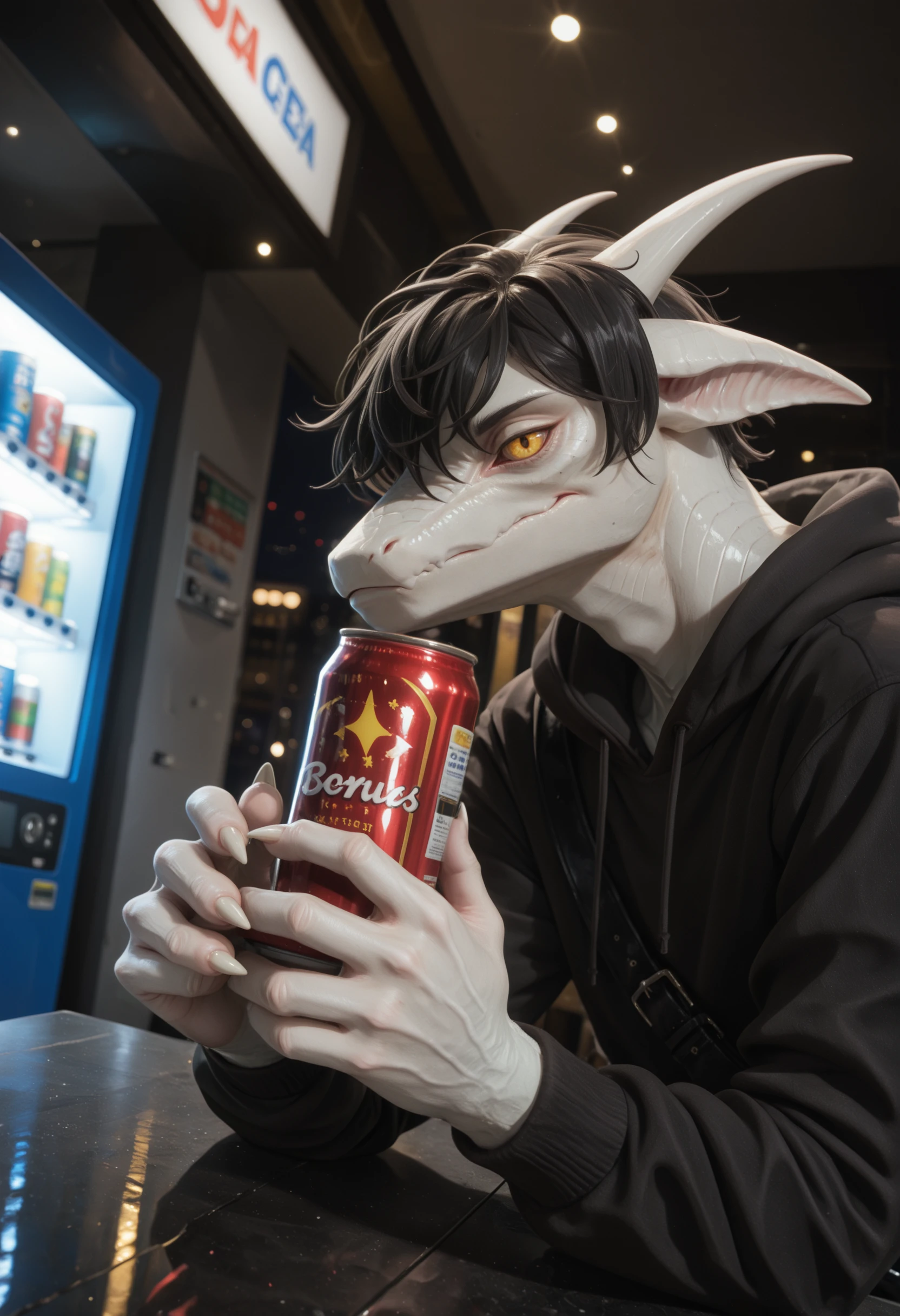 lac3rta_shap3_of_dr3ams, lizard, animal ears, horns, anthro, 1boy, solo, hi res, furry male, black hair, male, furry, yellow eyes, yellow sclera, tail, looking at viewer, scalie, clothing, hat with feather, gloves, belt, coat, scarf, blue glowing vial, looking at viewer, fur trim