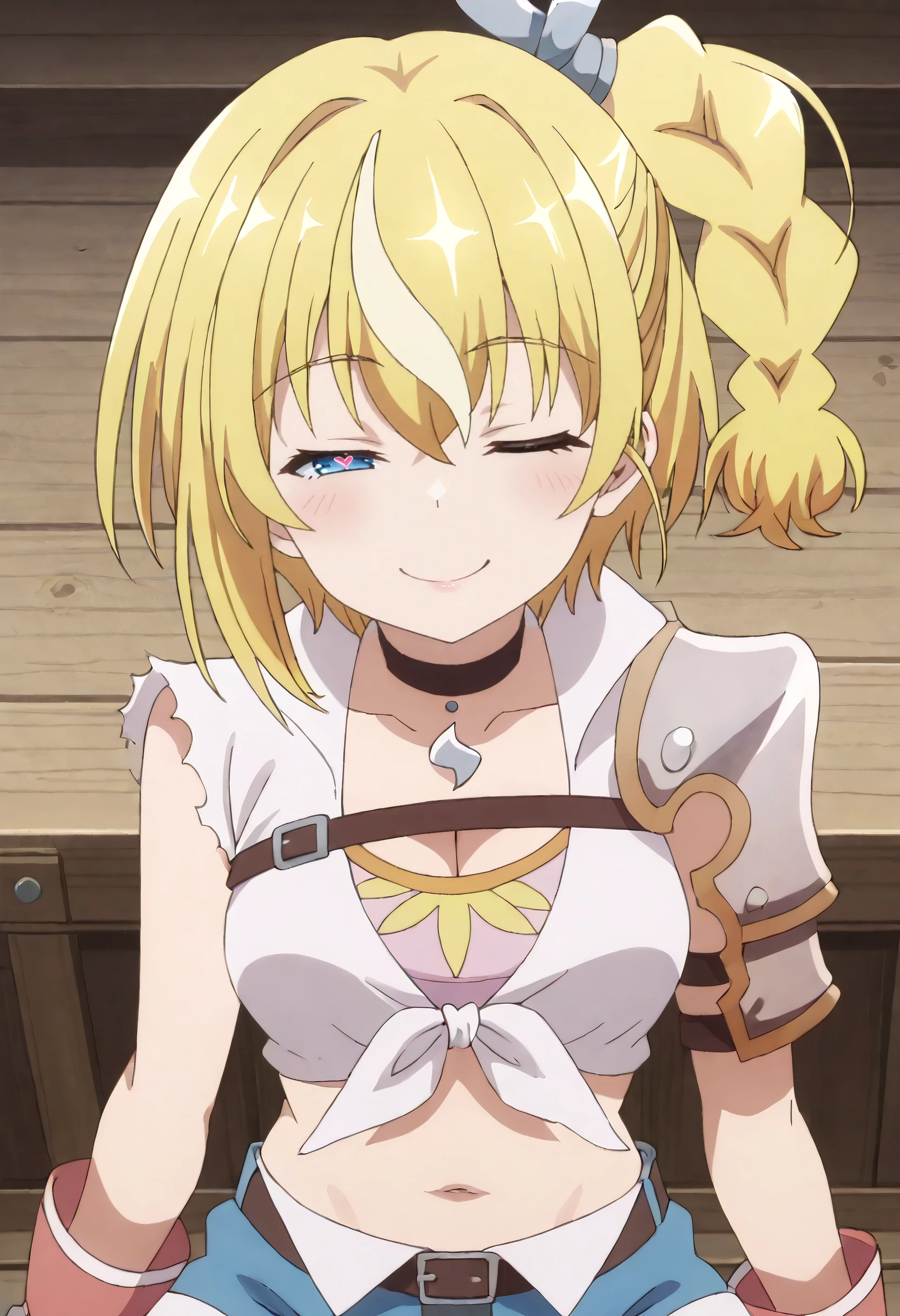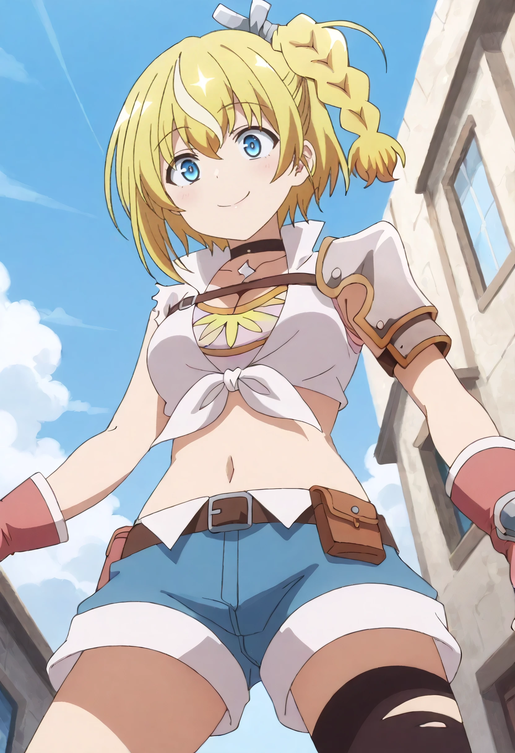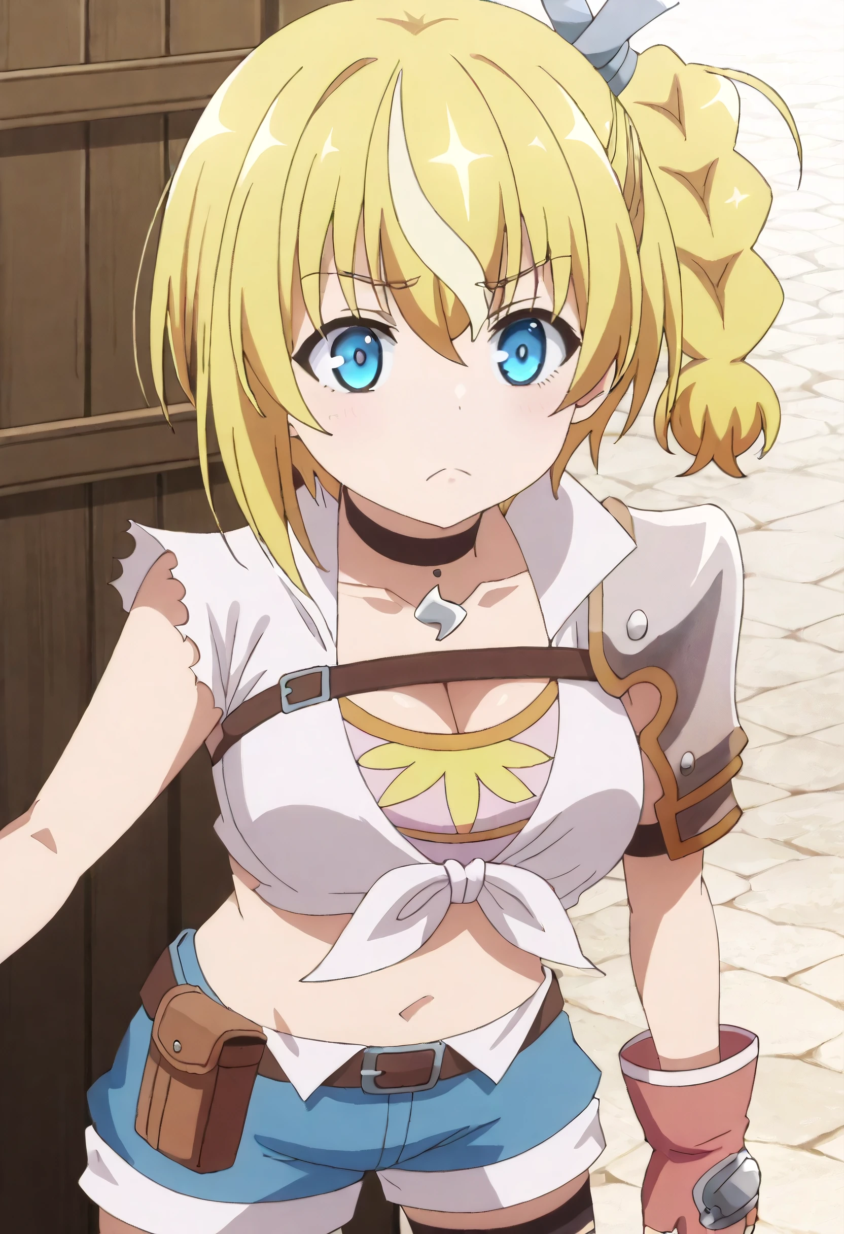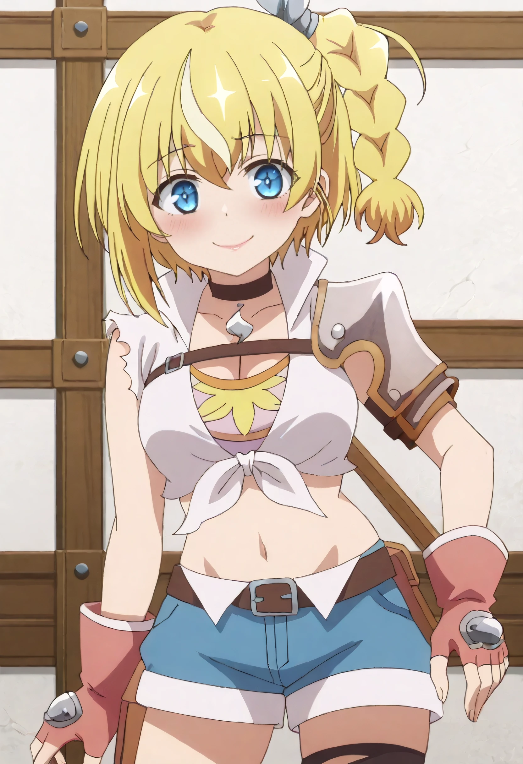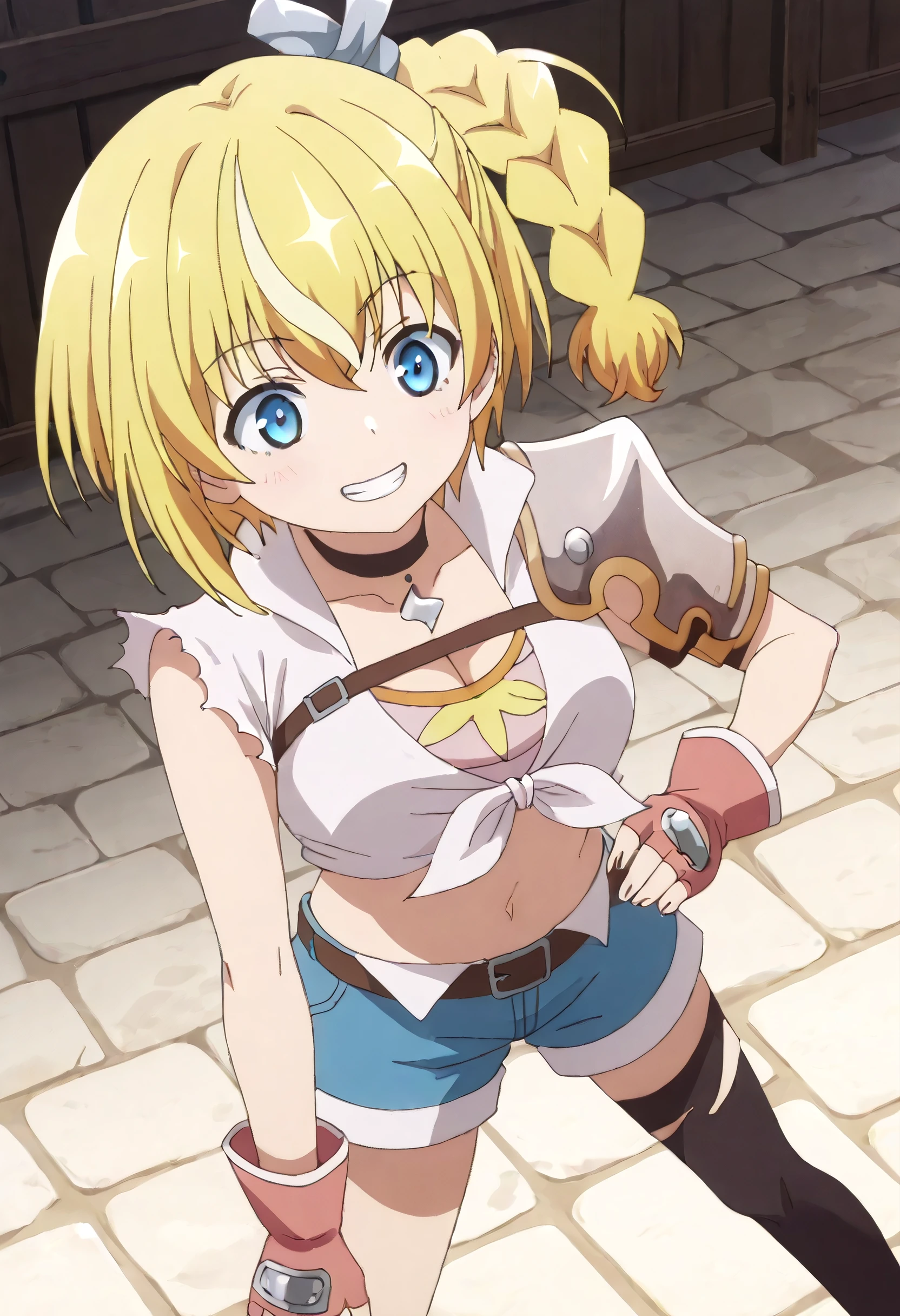 LammisOutfit, shirt, choker, torn clothes, gloves, black choker, armor, fingerless gloves, cleavage, midriff, shoulder armor, white shirt, crop top, tied shirt, belt, brown gloves, shorts, red gloves, pauldrons, short shorts, torn shirt, single pauldron, blue shorts, hair ornament, hair ribbon, denim shorts, single shoulder pad, thighhighs, denim, ribbon, torn sleeves, single thighhigh, black thighhighs, asymmetrical legwear, sleeveless, chest belt, brown belt, front-tie top, torn thighhighs,