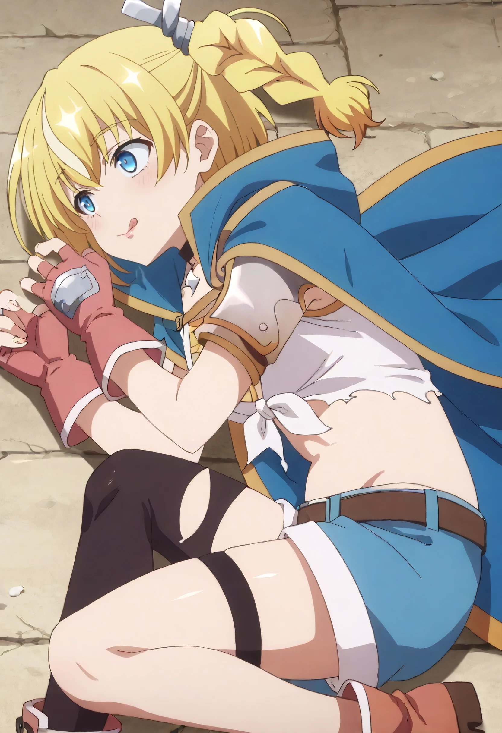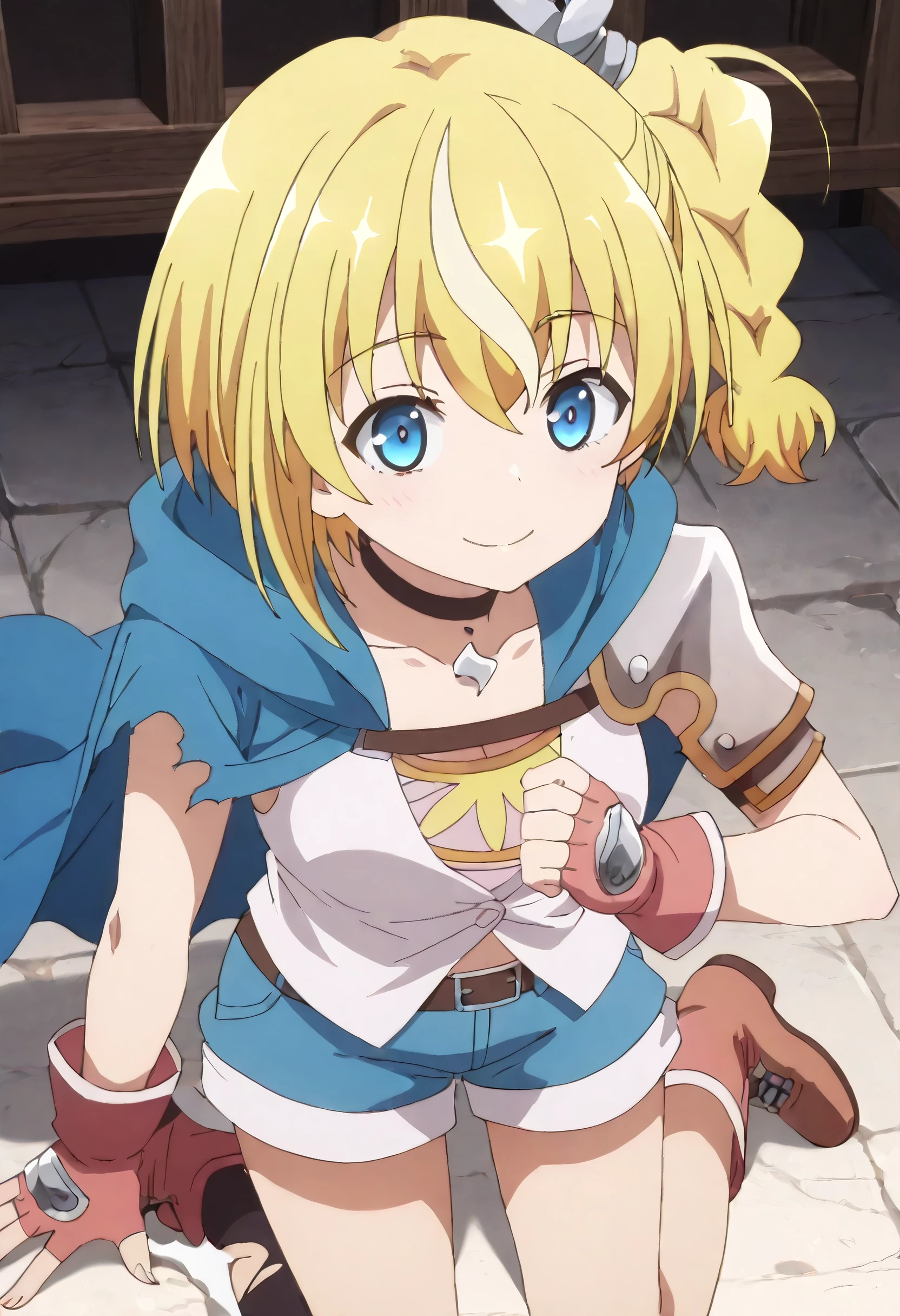 LammisCape, cloak, hood, gloves, hood up, shorts, red gloves, hooded cloak, fingerless gloves, choker, black choker, single thighhigh, thighhighs, belt, short sleeves, black thighhighs, short shorts, blue shorts, asymmetrical legwear, boots, brown footwear, blue cloak, torn clothes,