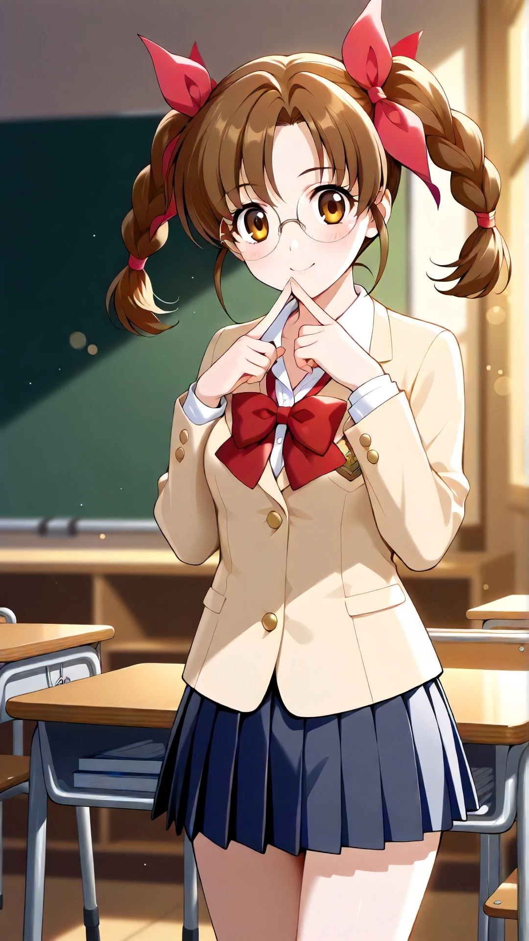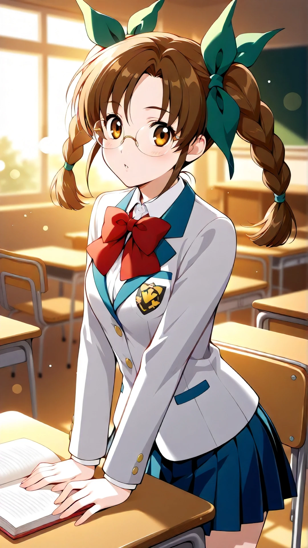 kyoko_tokiwa, an anime girl, 1girl, solo, skirt, brown hair, long sleeves, bow, ribbon, twintails, school uniform, hair ribbon, braid, pleated skirt, glasses, twin braids, desk