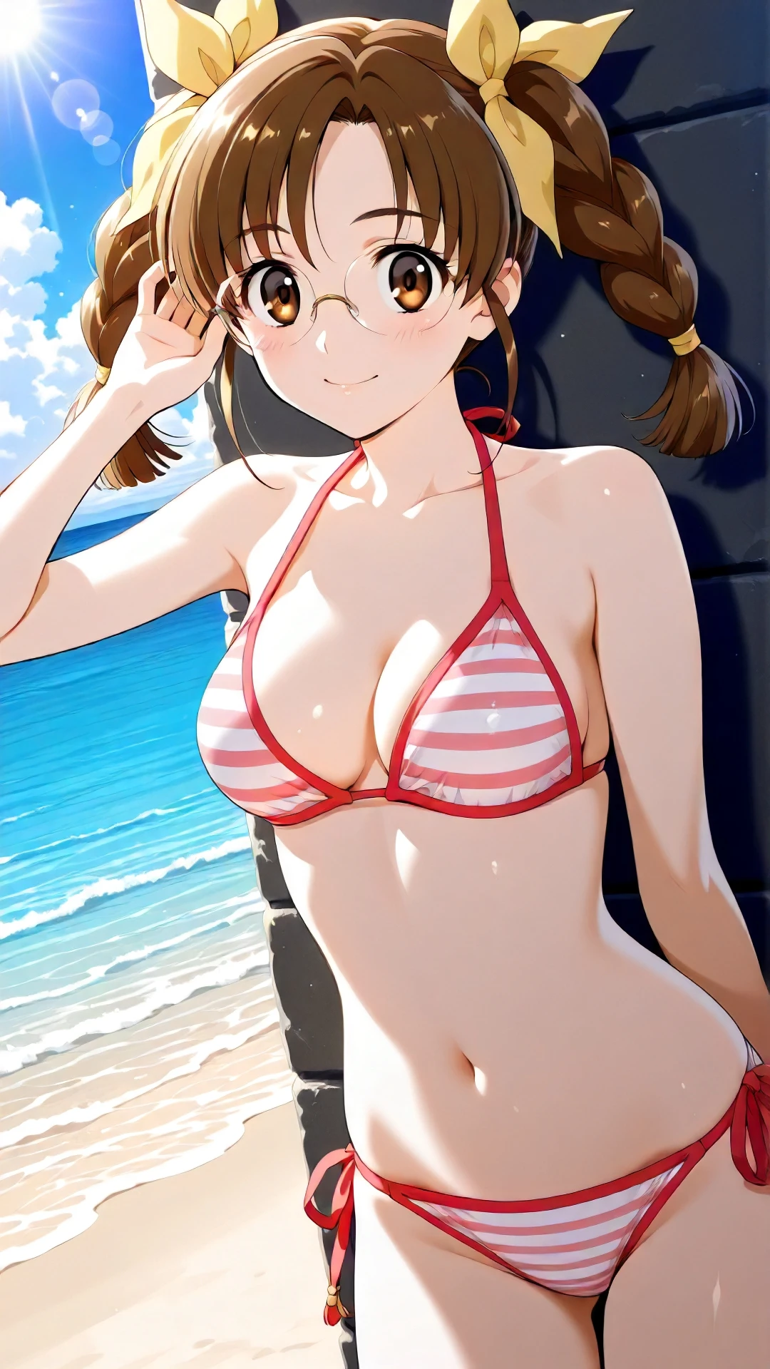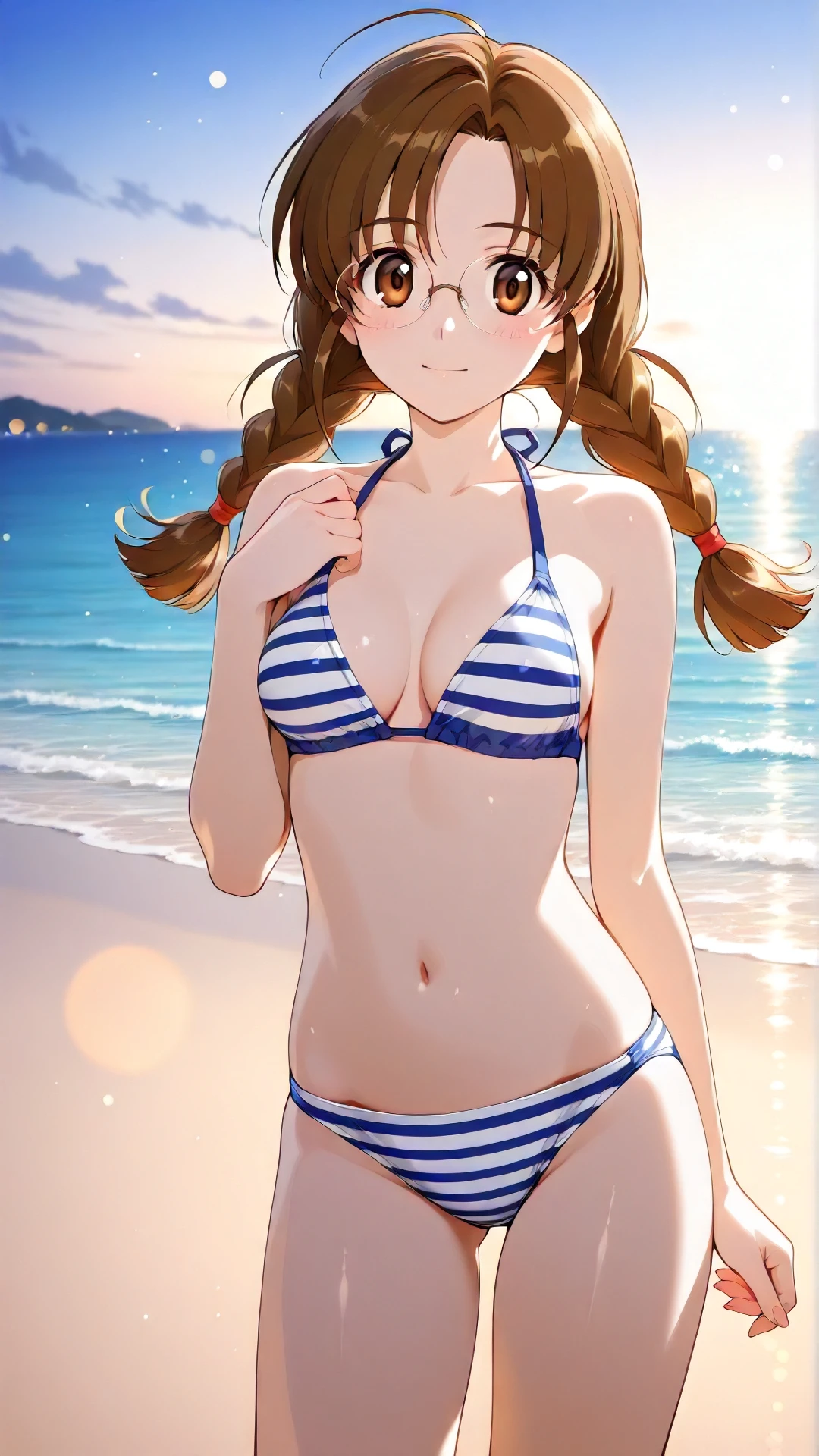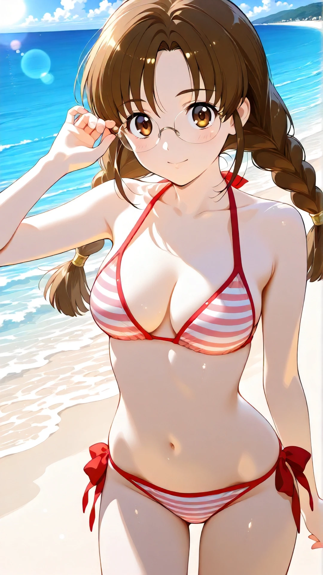 kyoko_tokiwa, an anime girl, 1girl, solo, brown hair, twintails, brown eyes, swimsuit, braid, bikini, outdoors, glasses, day, striped, twin braids, ocean, beach, striped bikini