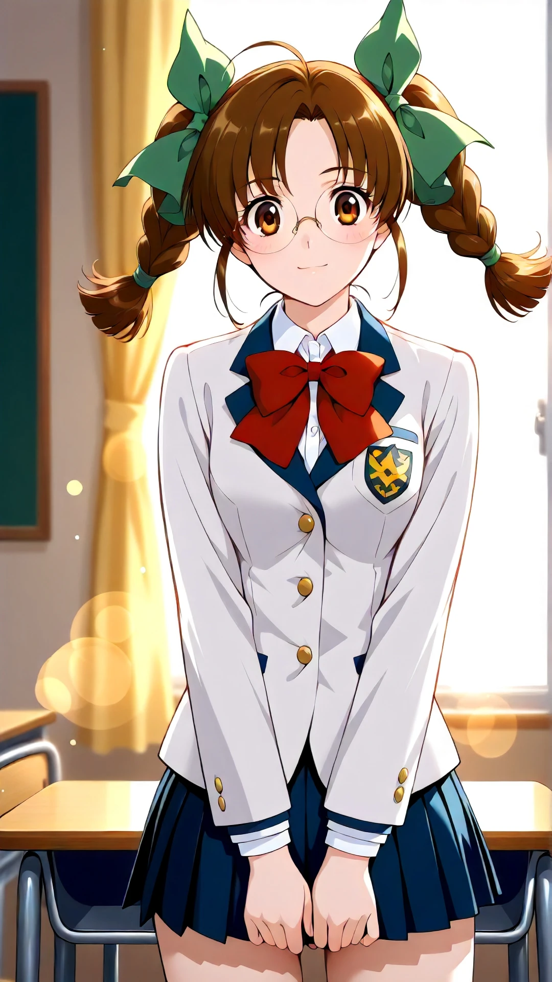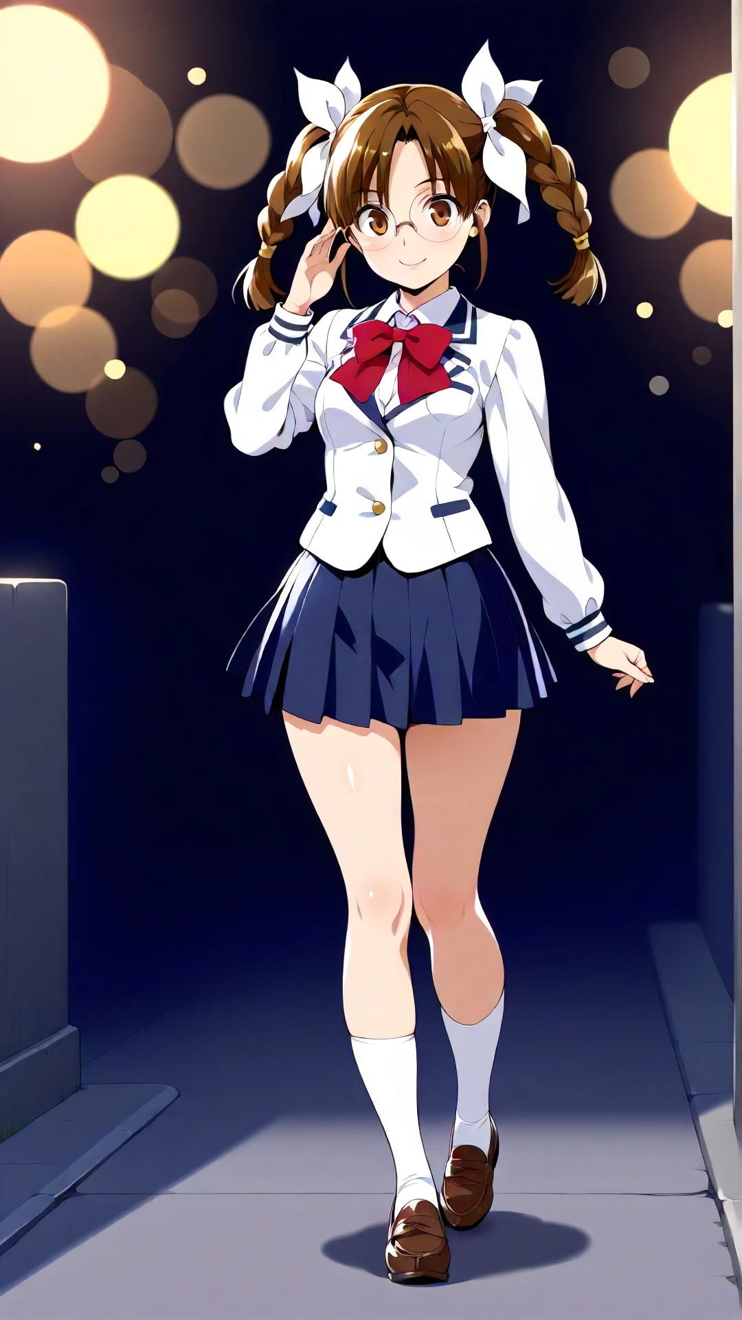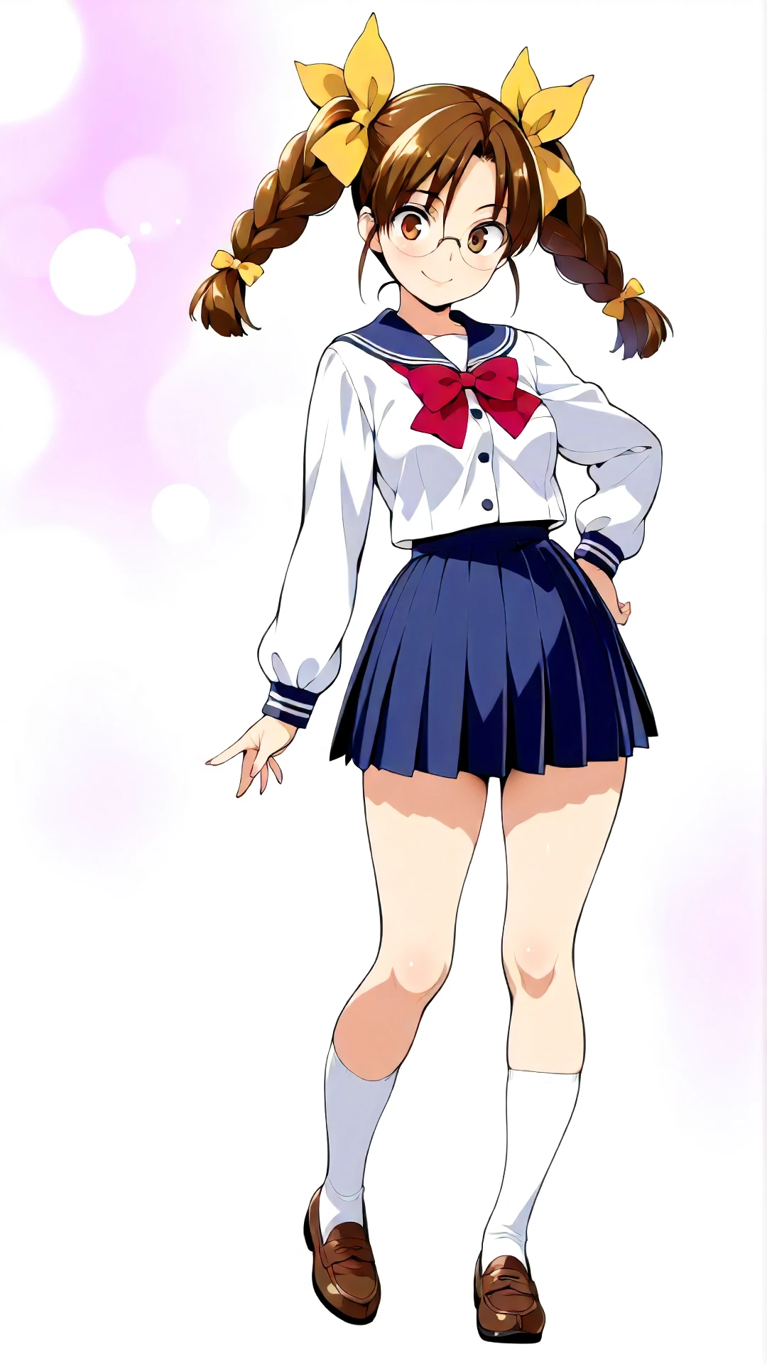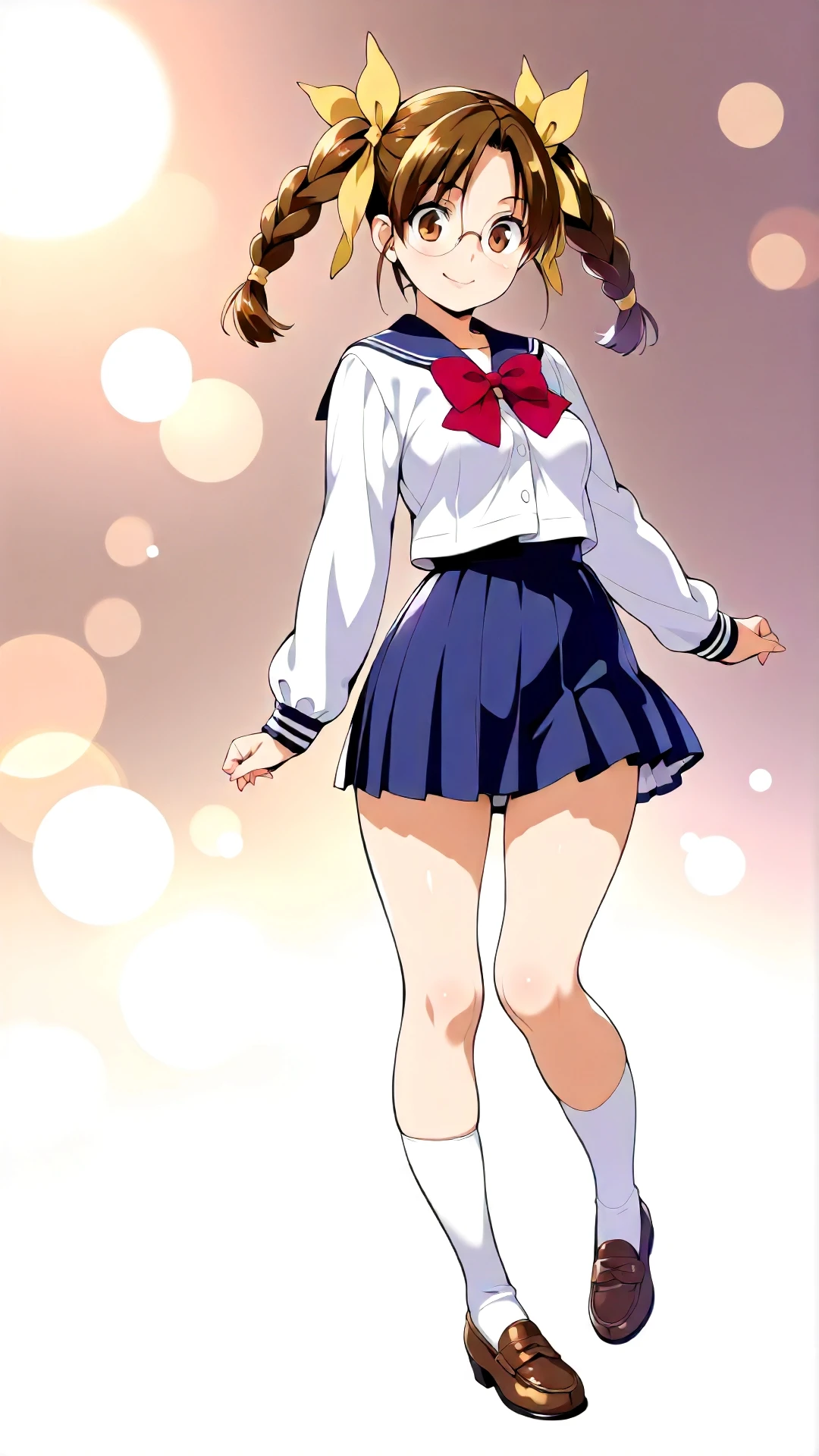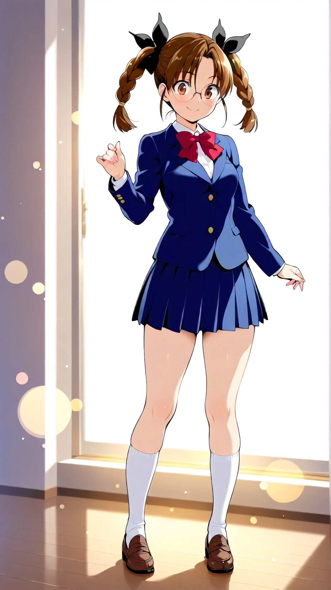 kyoko_tokiwa, an anime girl, 1girl, solo, smile, skirt, simple background, brown hair, long sleeves, white background, bow, ribbon, twintails, brown eyes, school uniform, full body, hair ribbon, braid, pleated skirt, shoes, glasses, socks, twin braids, blue skirt, brown footwear, white socks, loafers, round eyewear