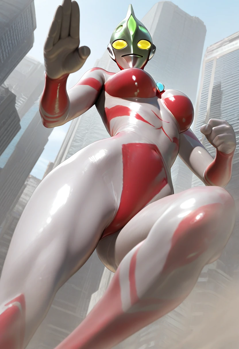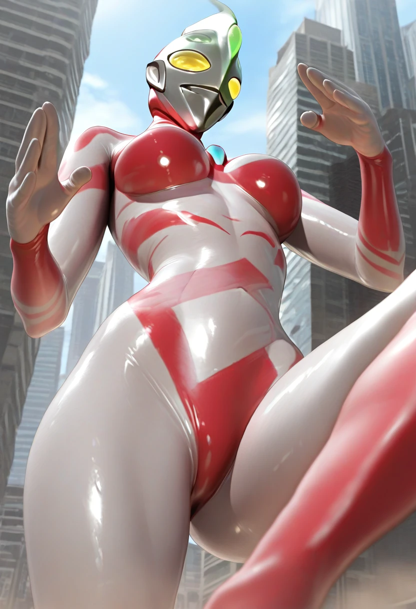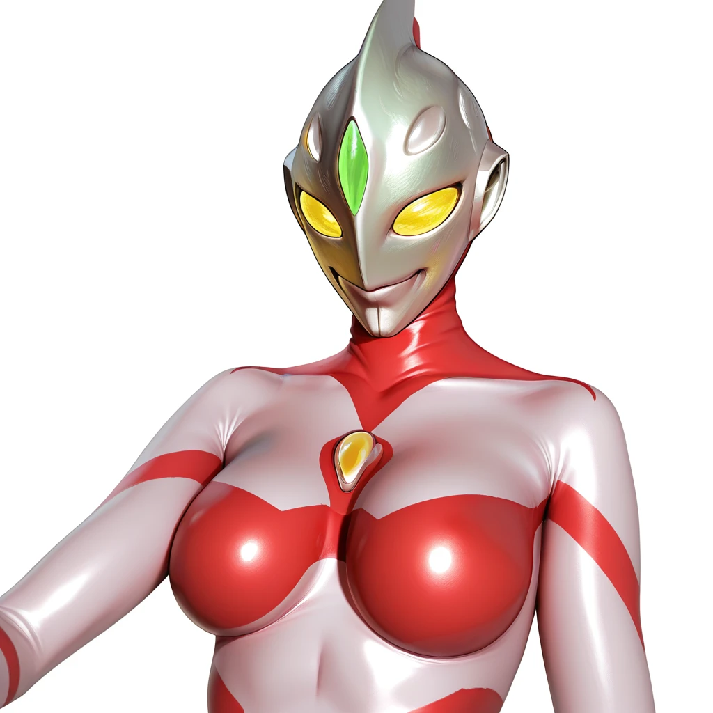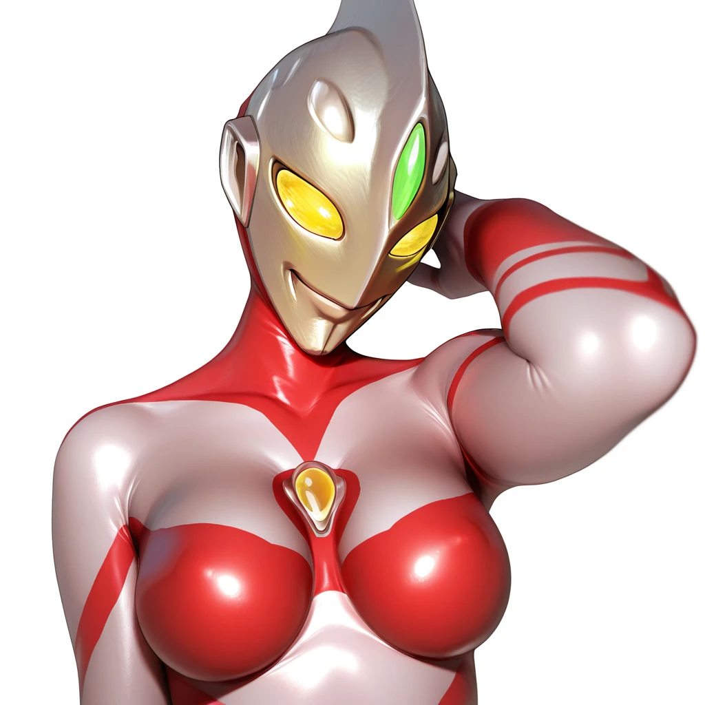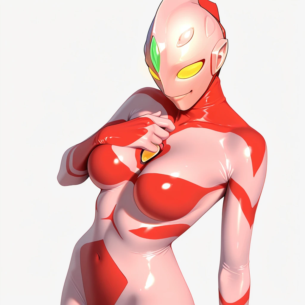 basic prompt:1girl, solo, tokusatsu, alien, medium breasts, yellow eyes, no pupils, green forehead jewel, mask, headgear, colored skin, red and silver skin, multicolored skin, chest jewel, blue chest jewel, glowing eyes, glowing