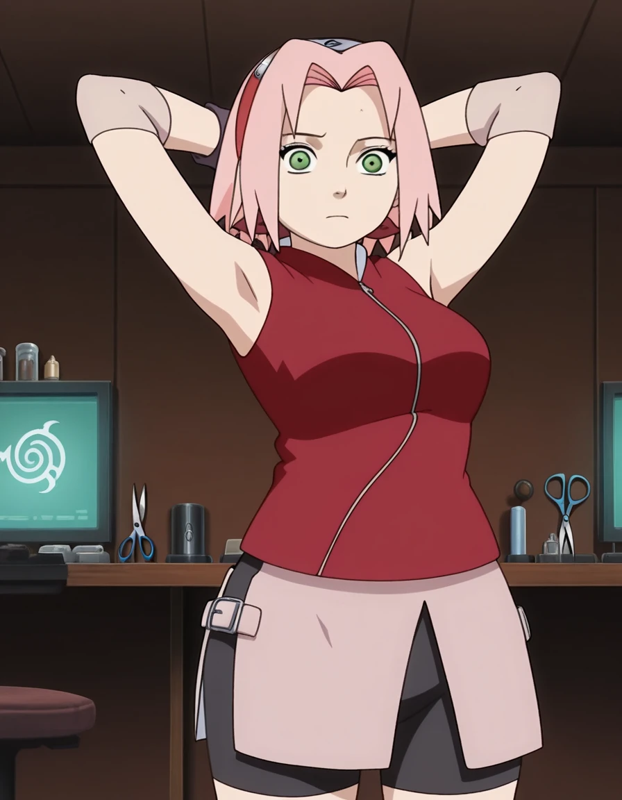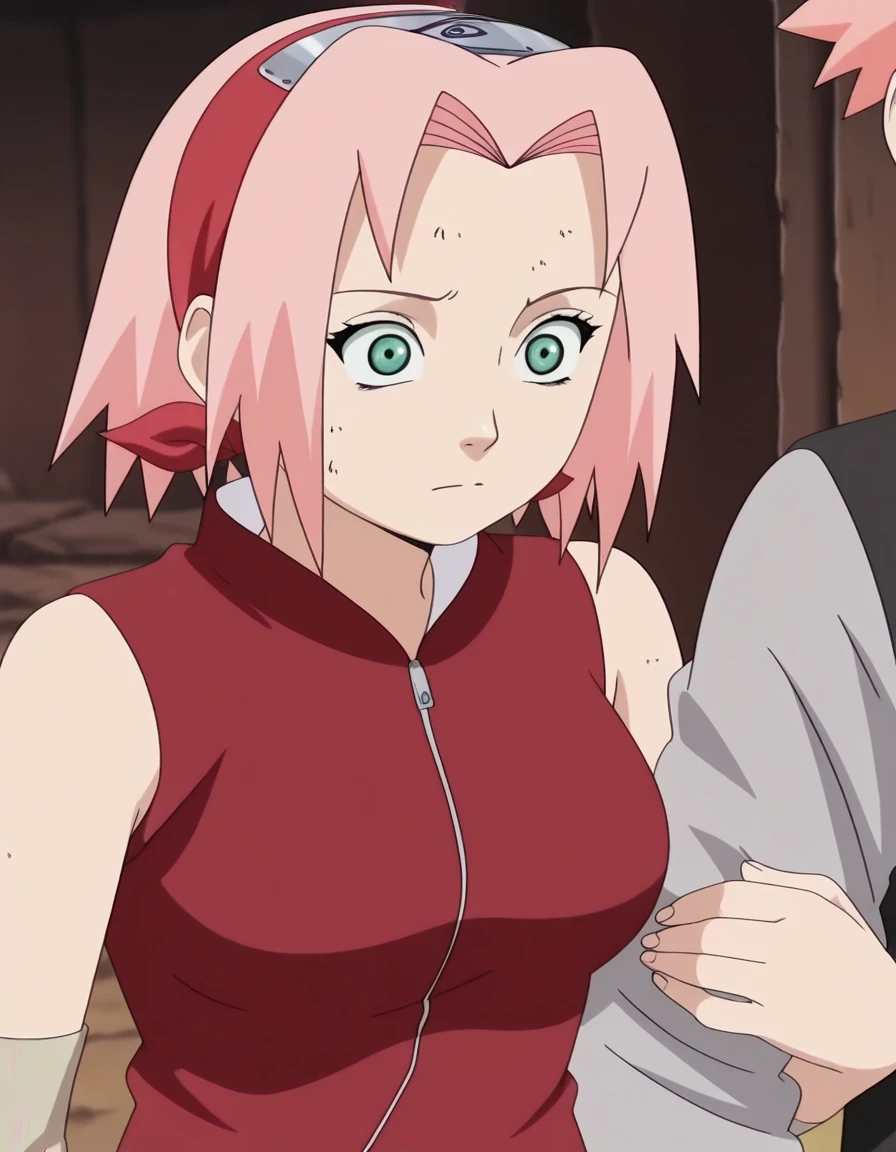 sakura haruno, haruno sakura, short hair, green eyes, pink hair, parted bangs, hairband, forehead protector, mature female, medium breasts, anime screencap