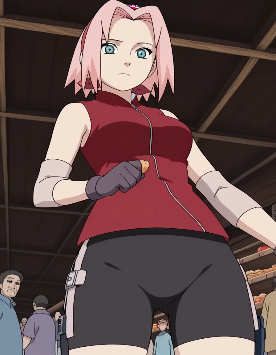 gloves, sleeveless, black gloves, red shirt, zipper, forehead protector, konohagakure symbol, bike shorts, zipper