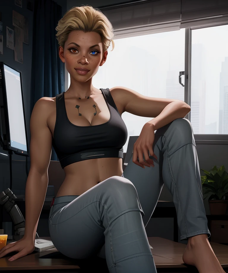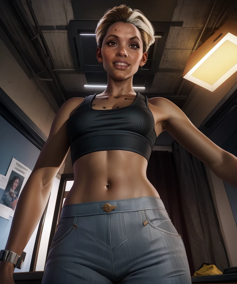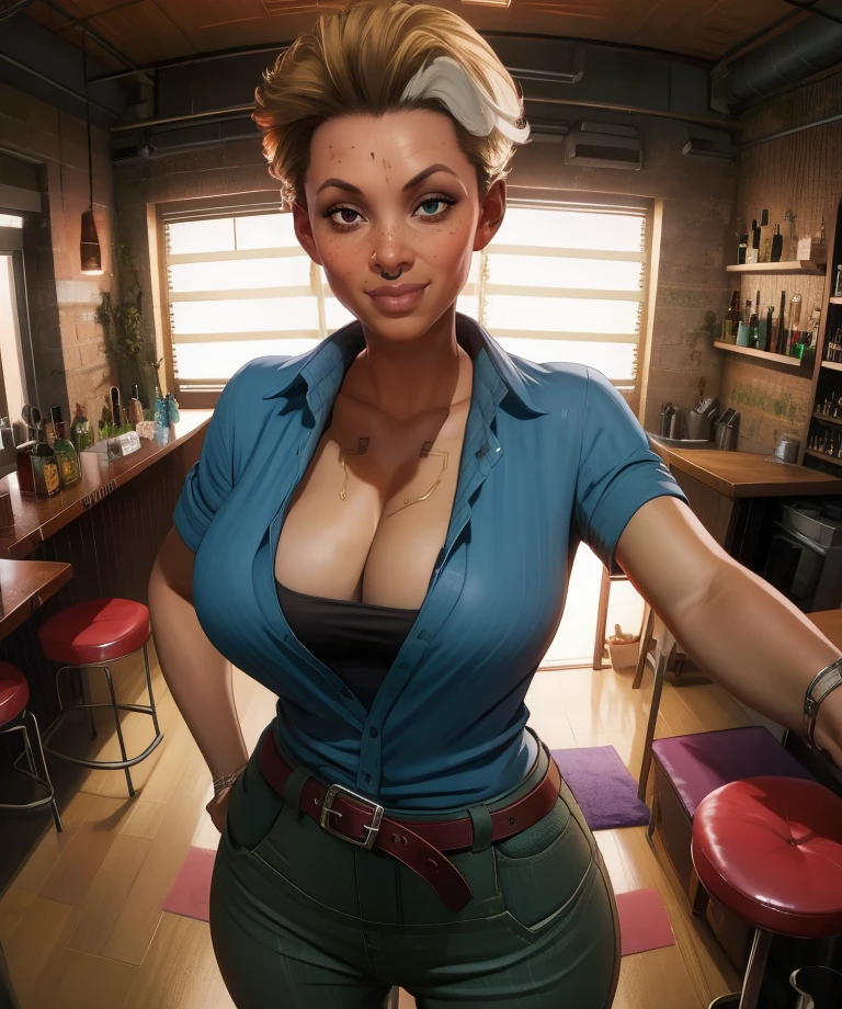 blue flannel, or black flannel, short sleeves, white undershirt, cleavage, belt,green pants boots, or black crop top, sleeveless, grey pants, --- braclets,