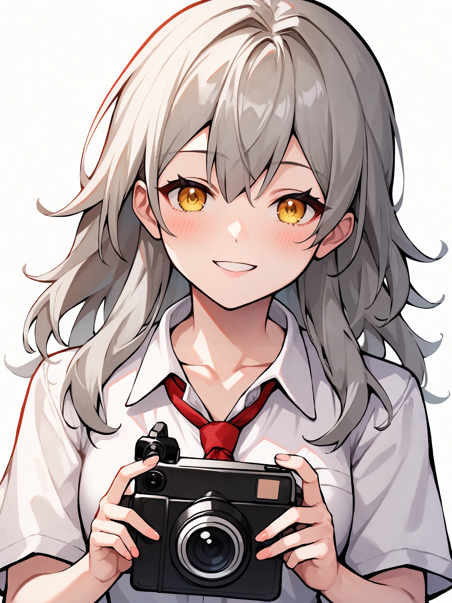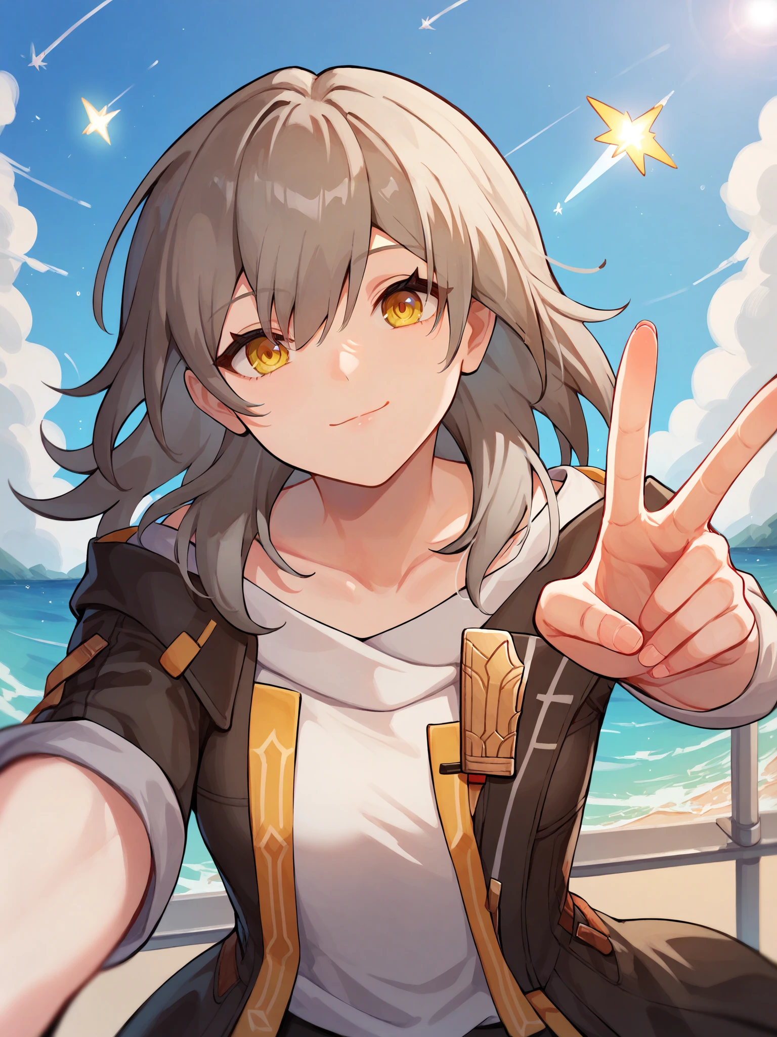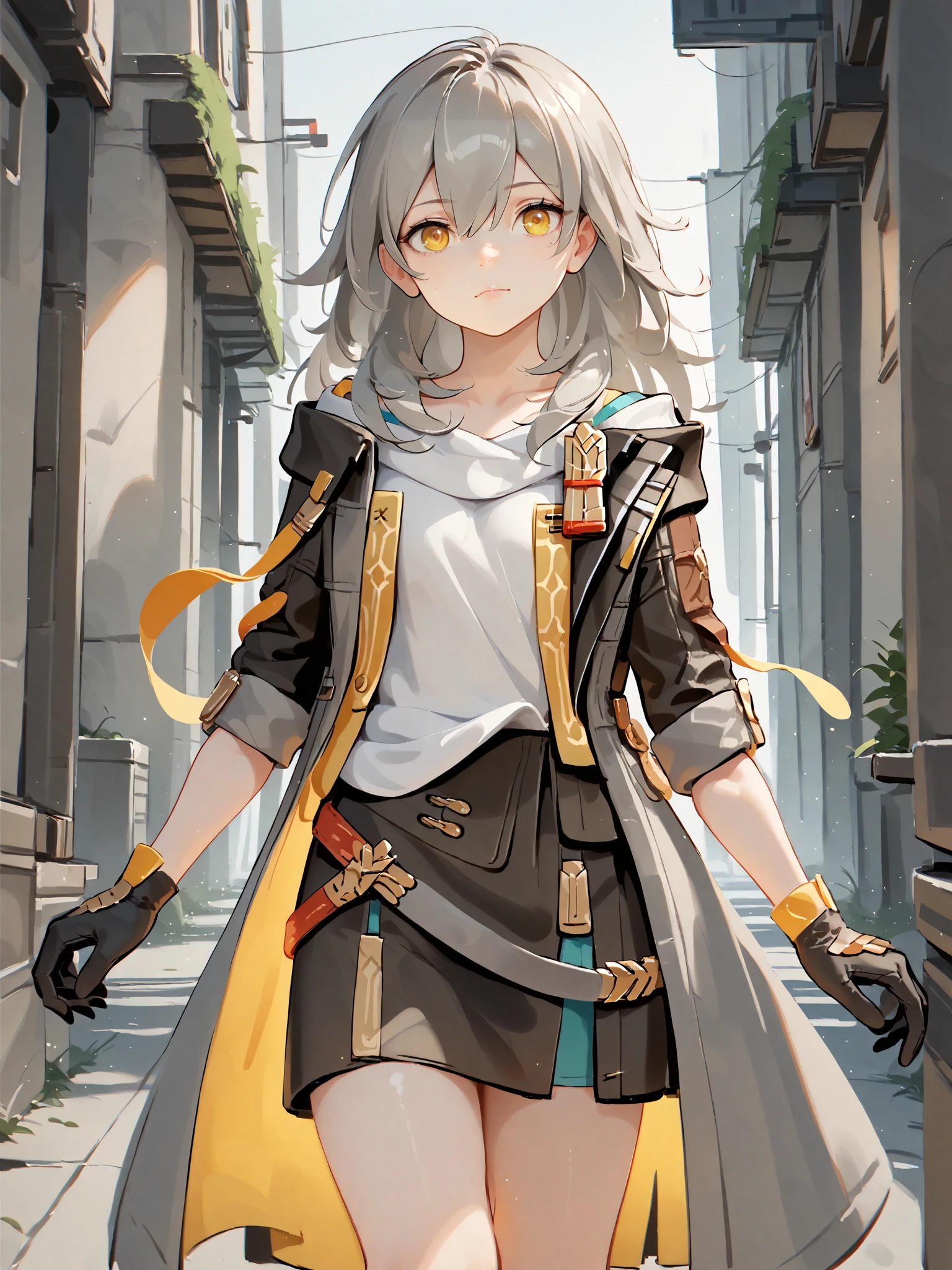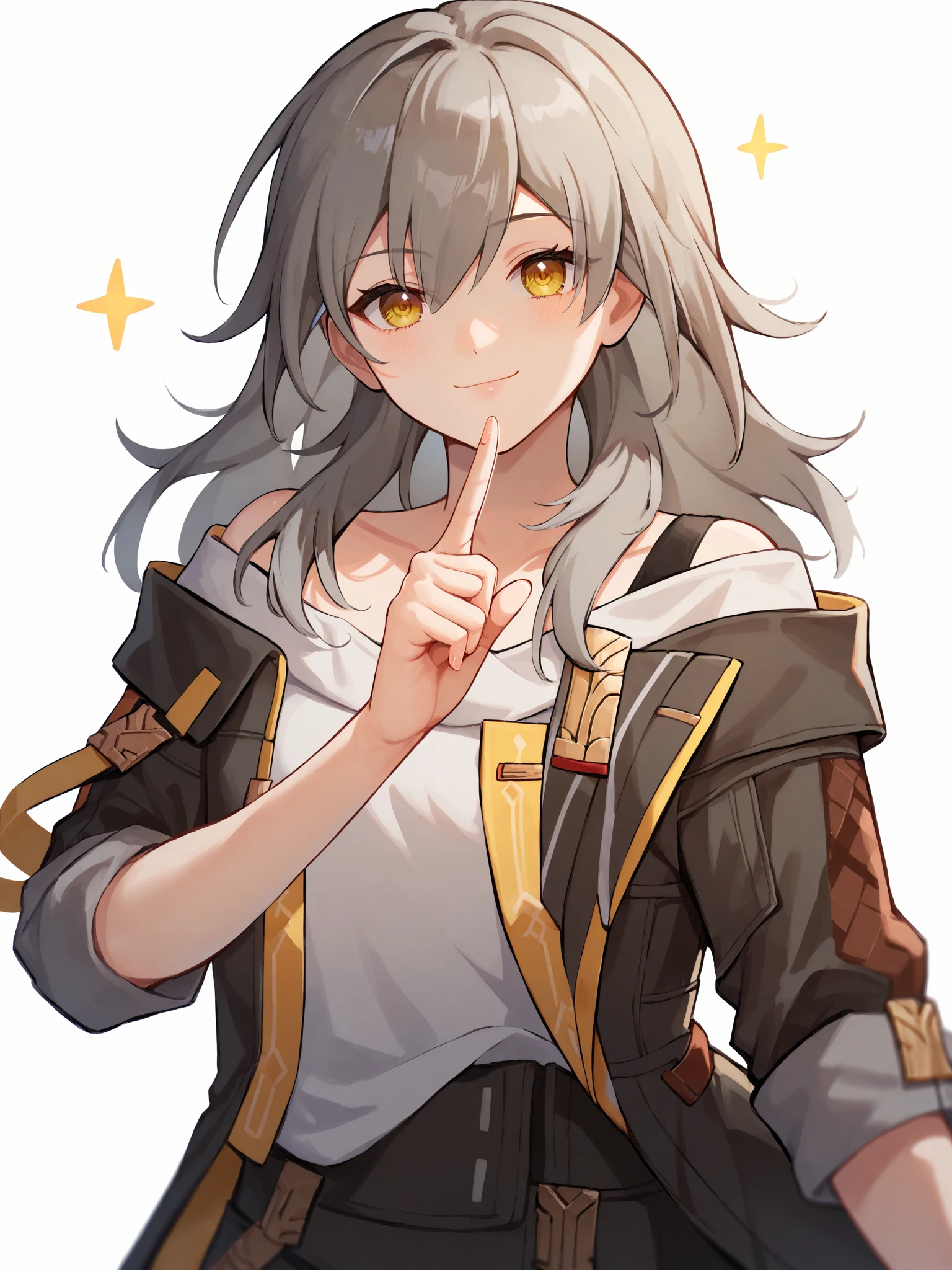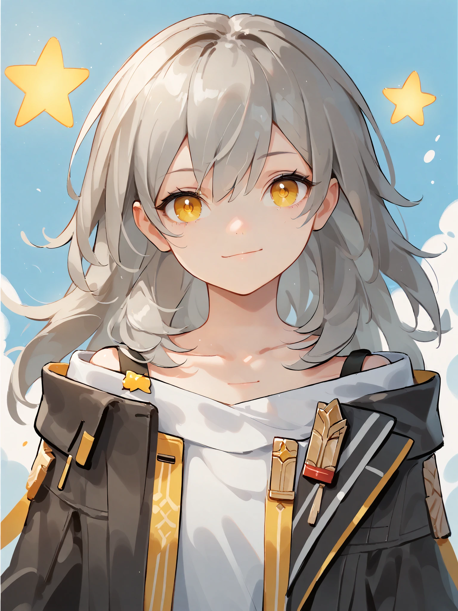 characteristic:stelle is a girl with long gray hair and yellow eyes