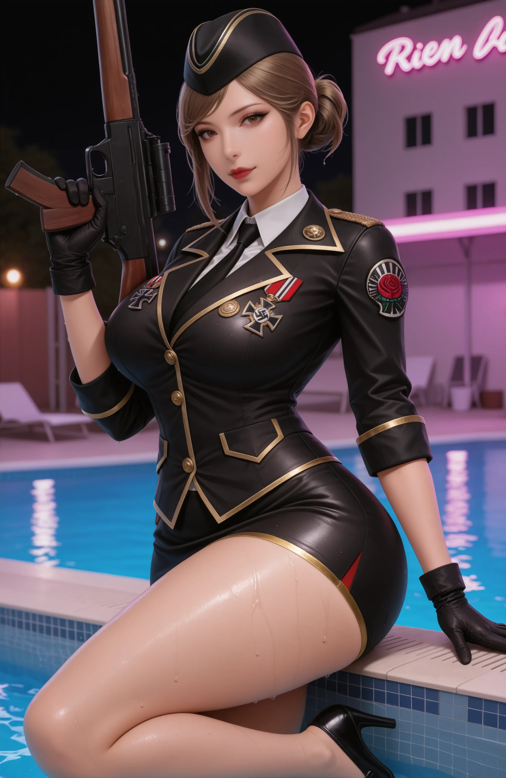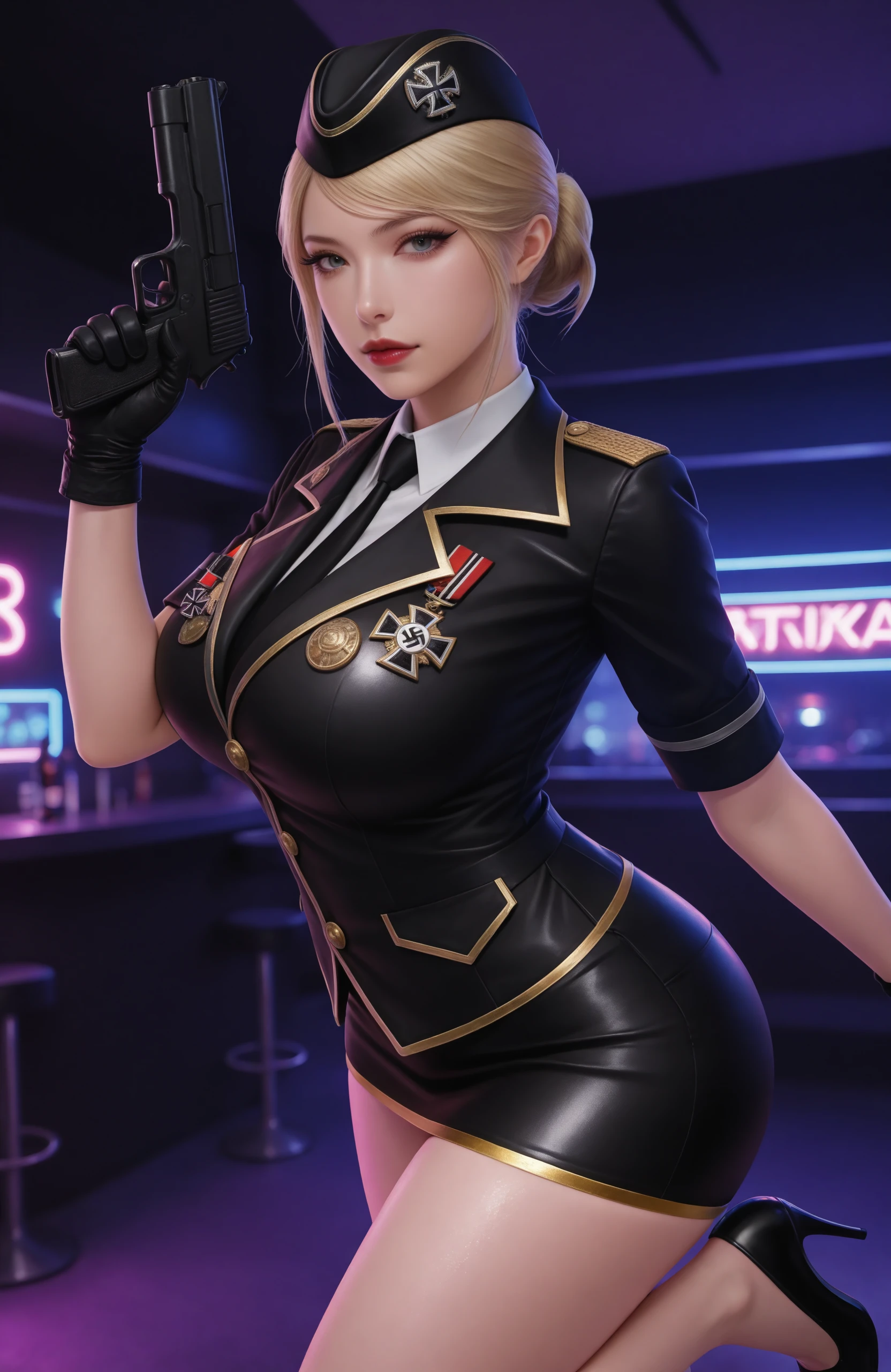 outfit1保卫者:nightrose1, neat bun hairstyle,black military uniform with gold trim, black beret, black mini skirt, black leather gloves, black high heels , military medal badge, iron cross medal, white shirt inner wear, black tie,