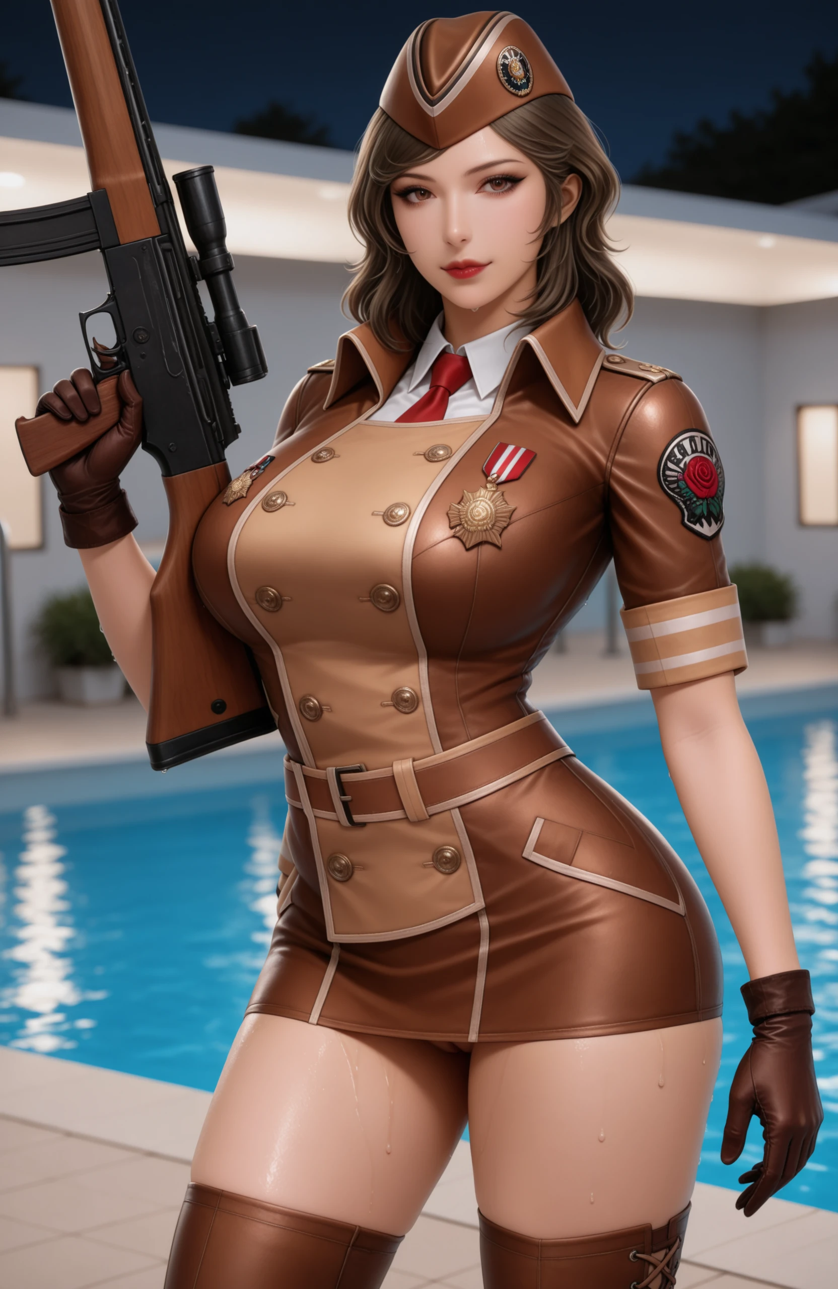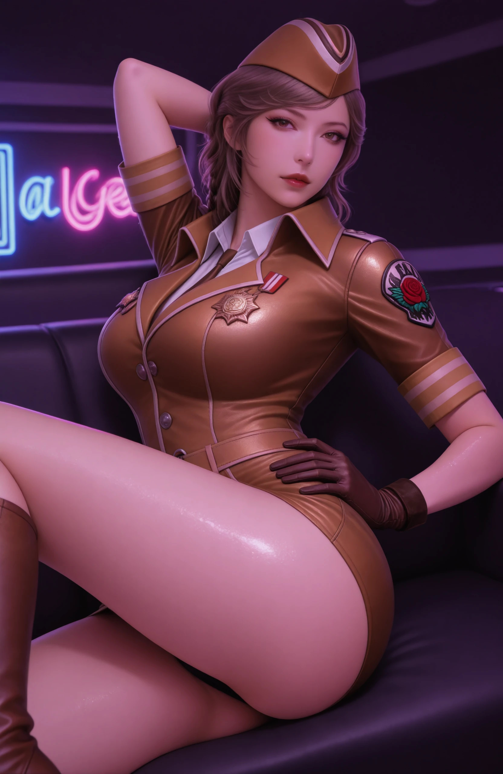outfit2潜伏者:nightrose2, brown military uniform, brown beret, high-heeled boots, lace-up thigh-high boots, brown short skirt, leather gloves slender figure, oriental female, fair skin, neat braid rose badge, military medal, police badge on arm, hair over ears, light brown wavy hair,wavy hair