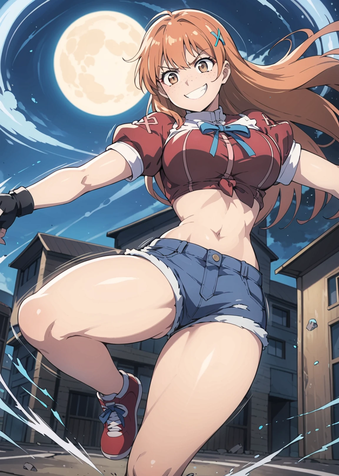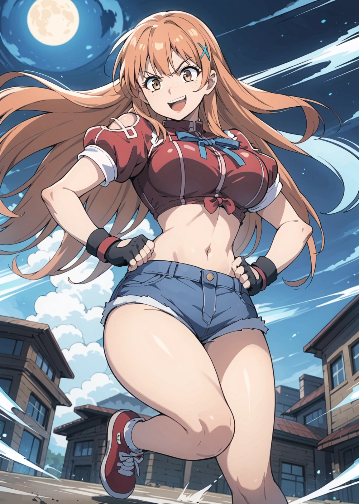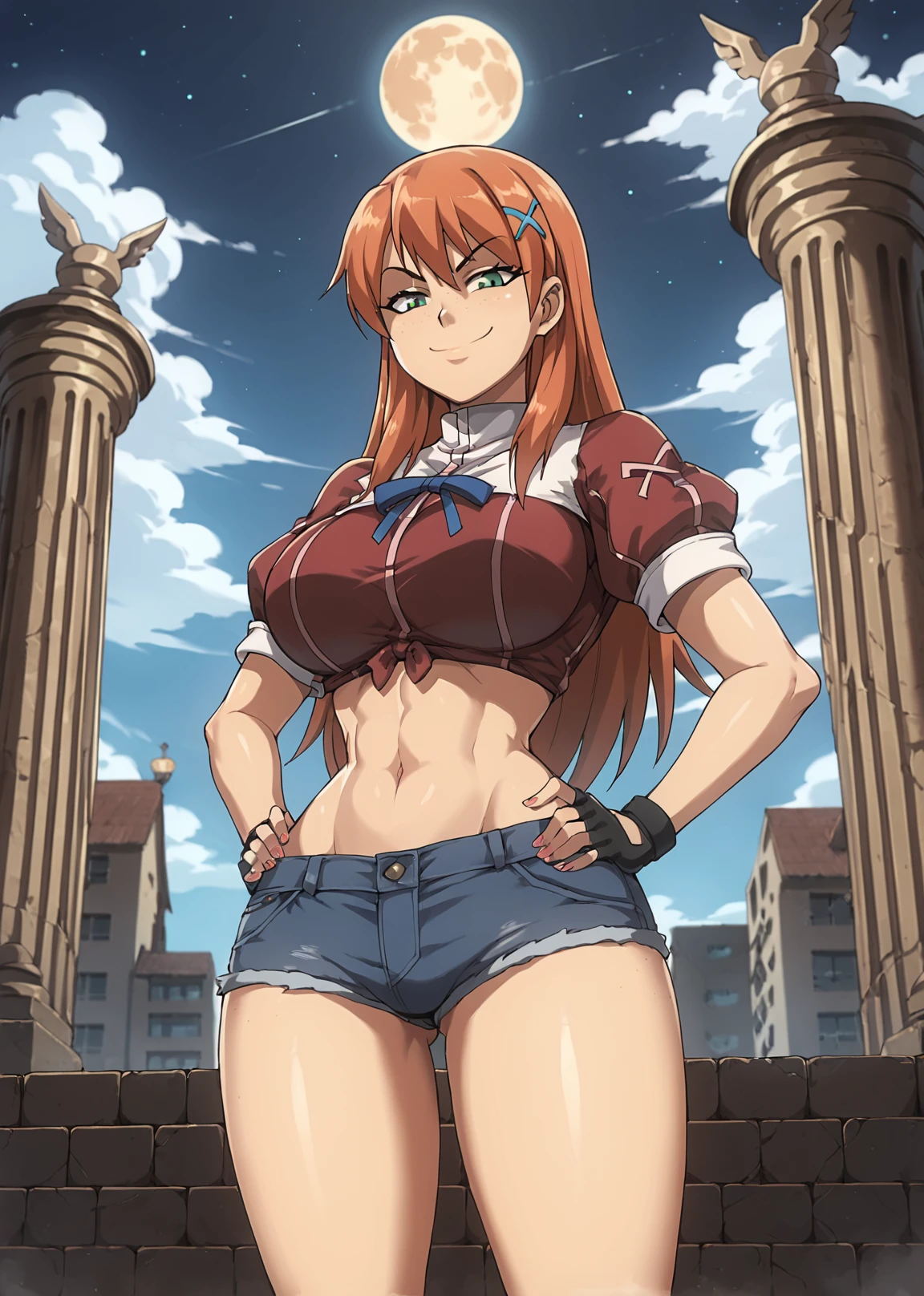 Trigger: 1girl, solo, orange hair, freckles, long hair, tan skin, dark purple shirt, midriff, denim, denim shorts, fingerless gloves, red sneakers