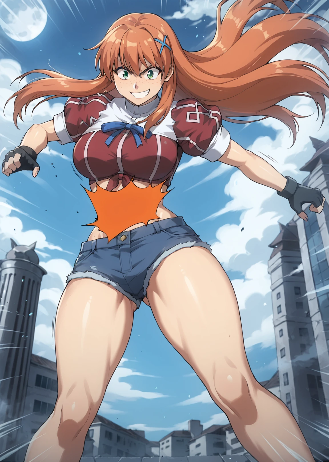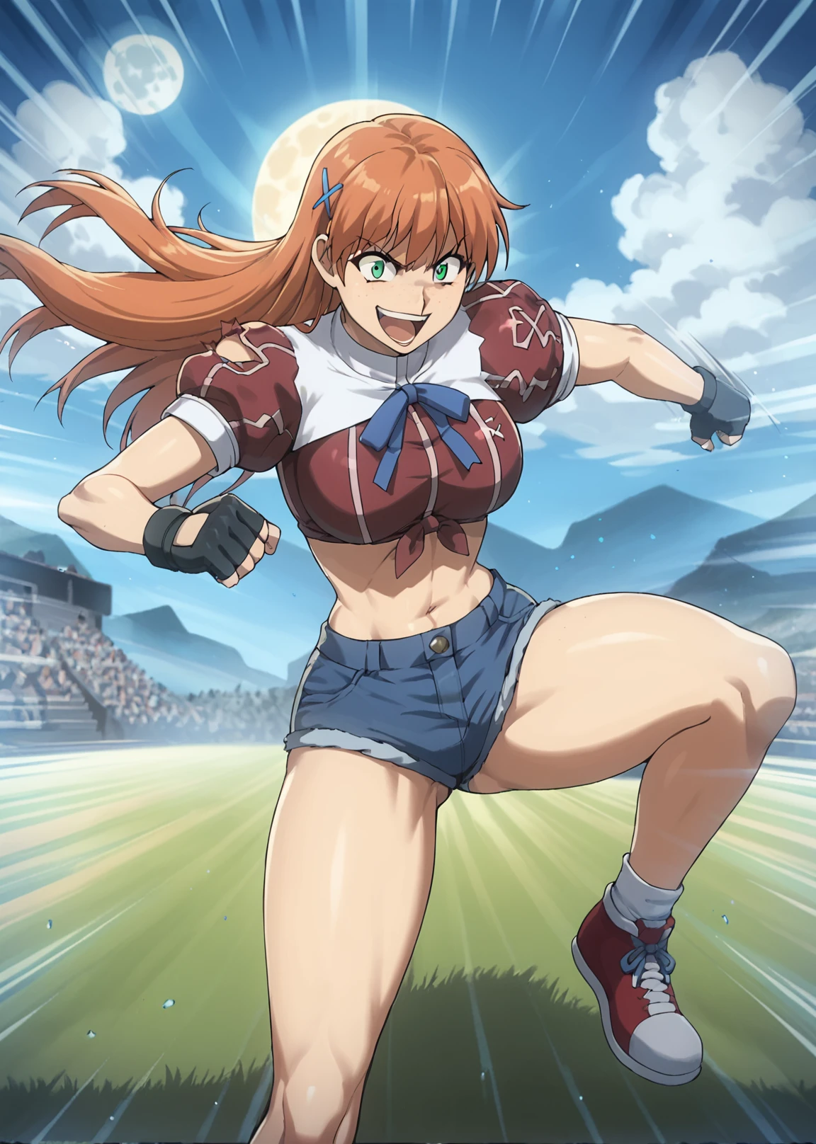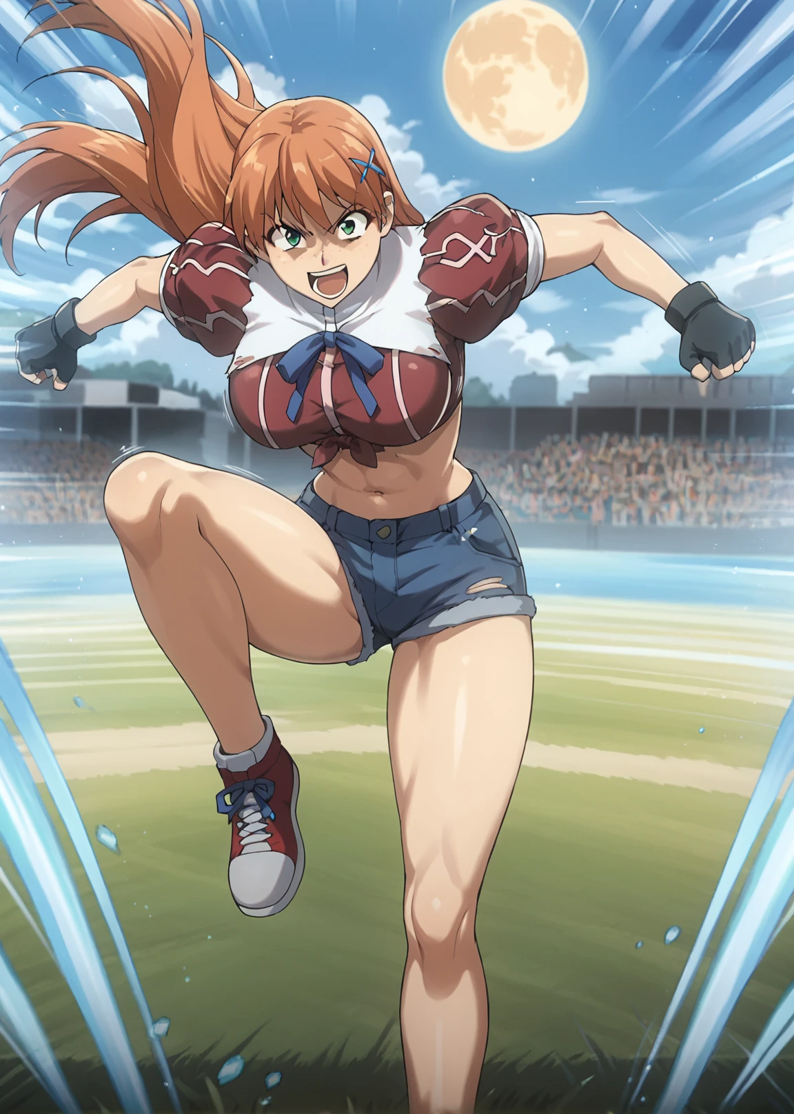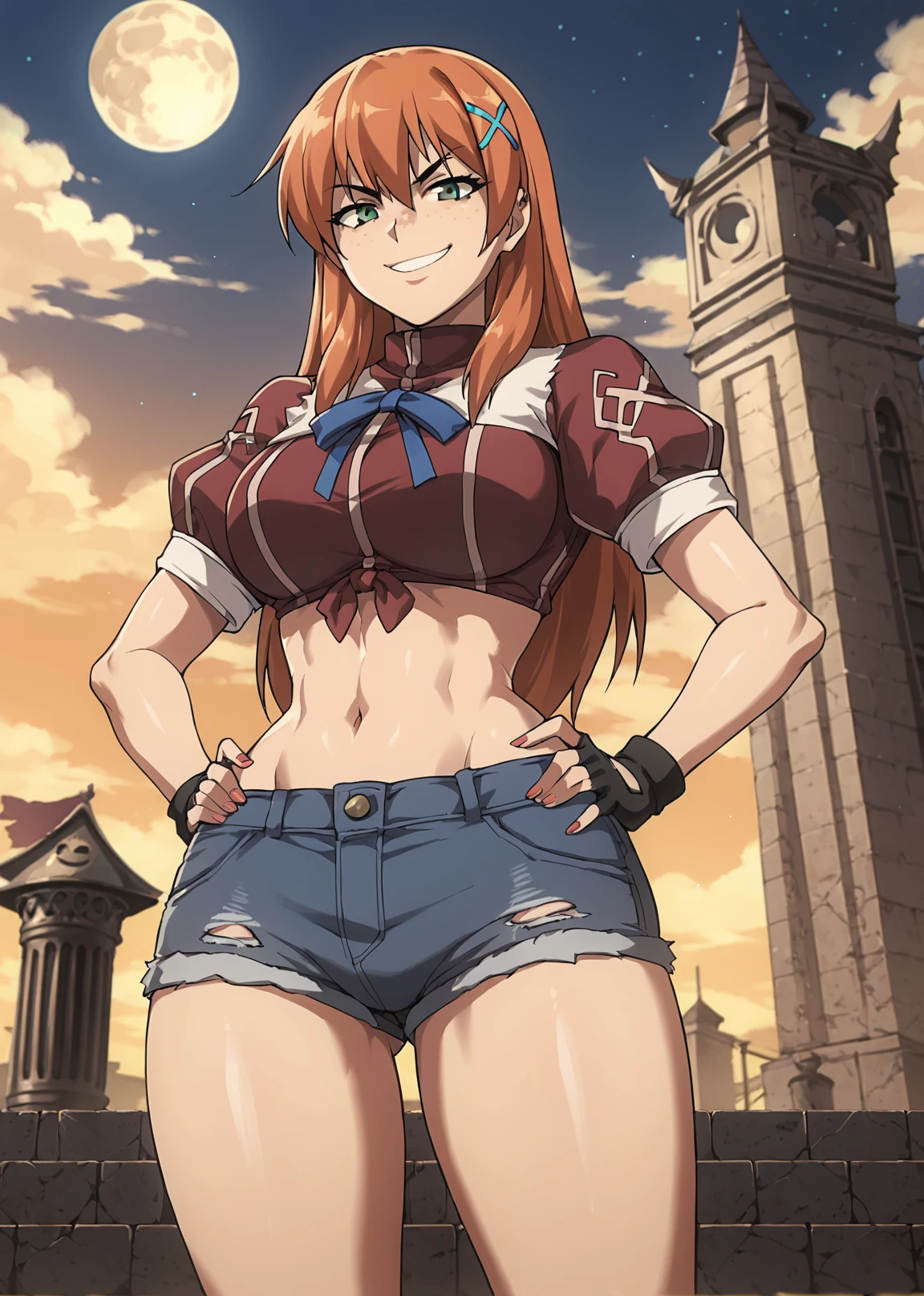 Trigger: 1girl, solo, orange hair, freckles, long hair, tan skin, dark purple shirt, midriff, denim, denim shorts, fingerless gloves, red sneakers