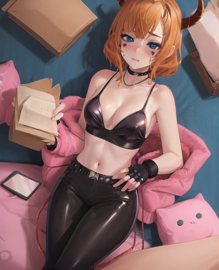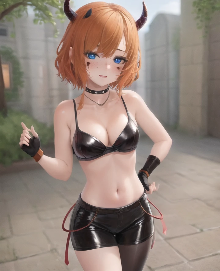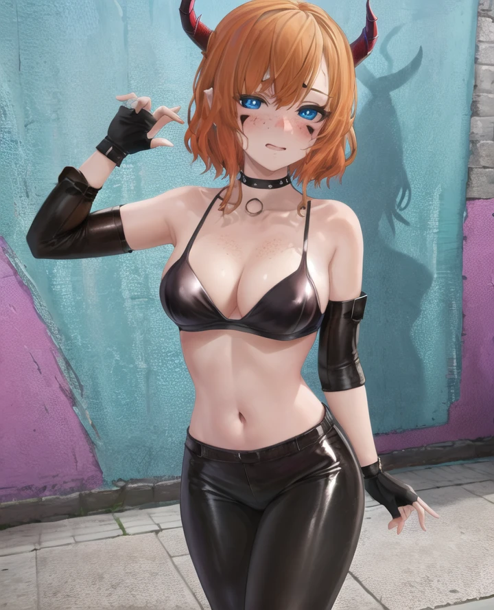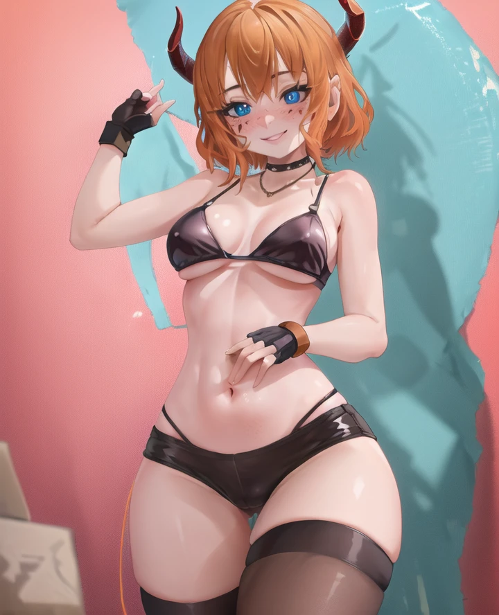2. "1girl, adult, patiiiiiii, horns, marks under eyes, orange hair, short hair, spots bra, black leggings, choker, necklace, fingerless gloves, gloves, blue eyes, freckles, blush,"