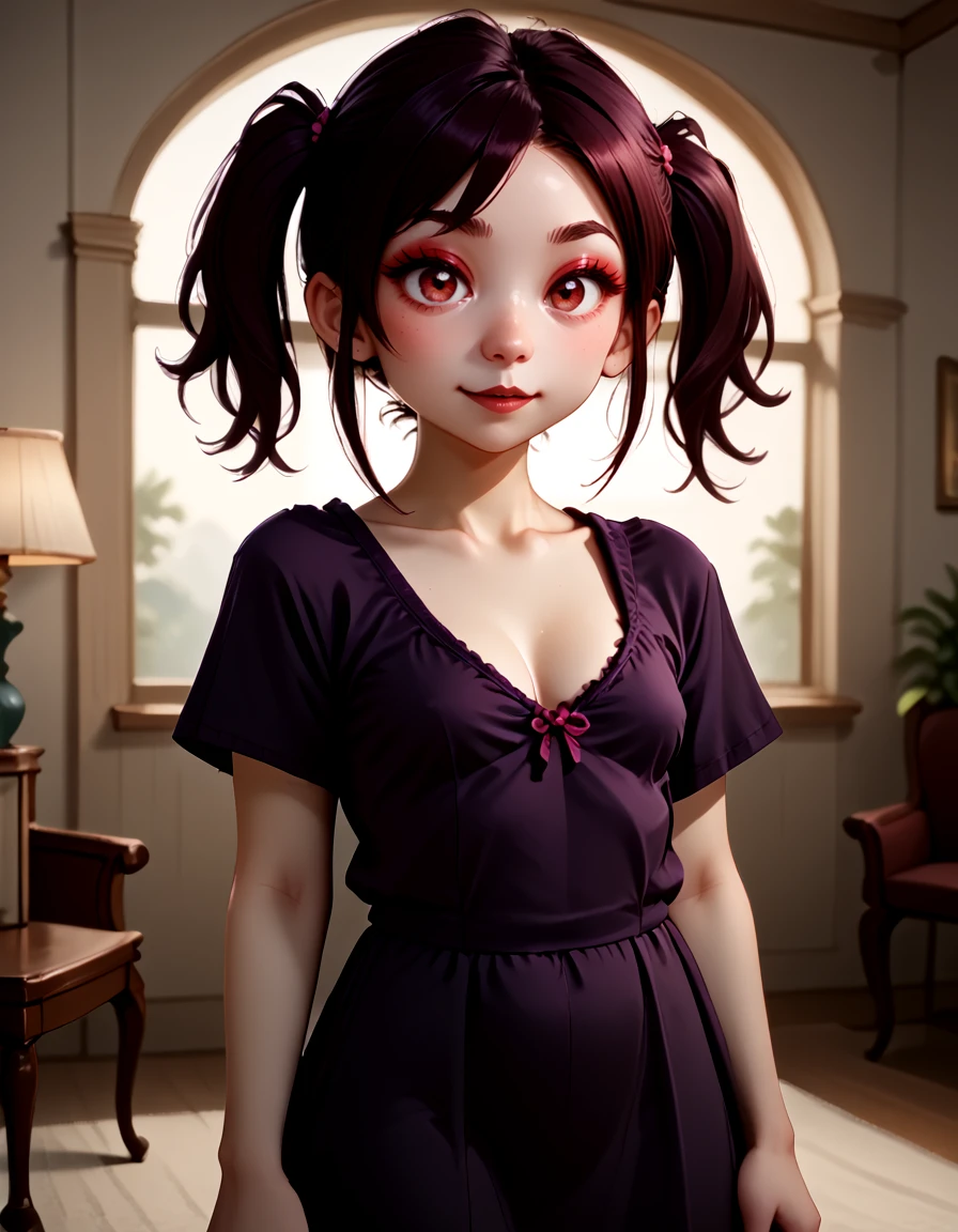 plum (mario golf 64), 3d, low poly, plum, 1girl, solo, brown hair, pigtails, green eyes, dark blue shirt, red collar, red cuffs, white gloves, black shorts, bare legs, socks, red and white sneakers, white sneakers, full body, smile, golf course,