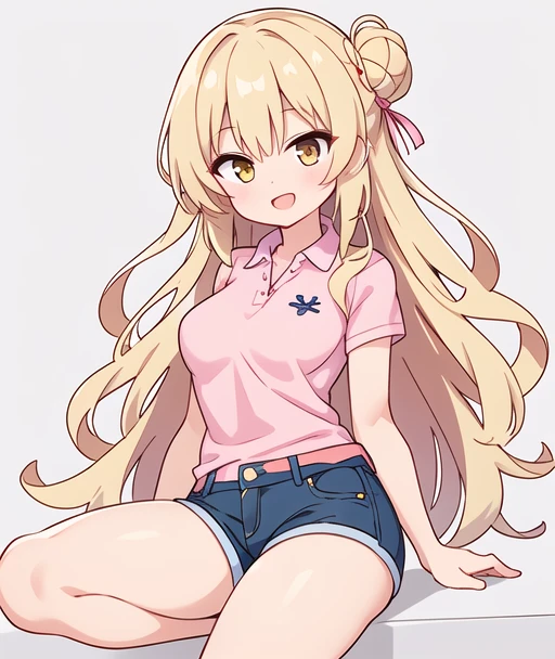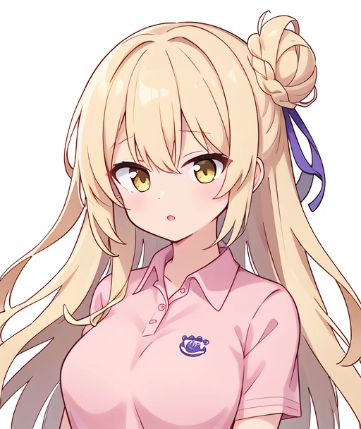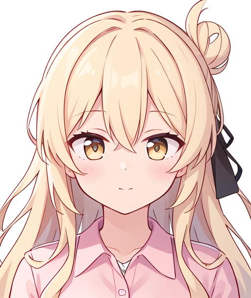 long blonde hair, wavy hair, bun, hazel eyes
