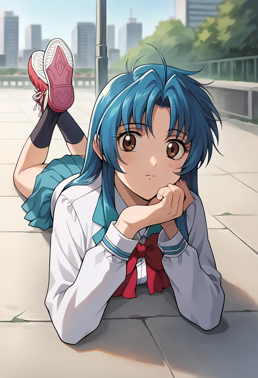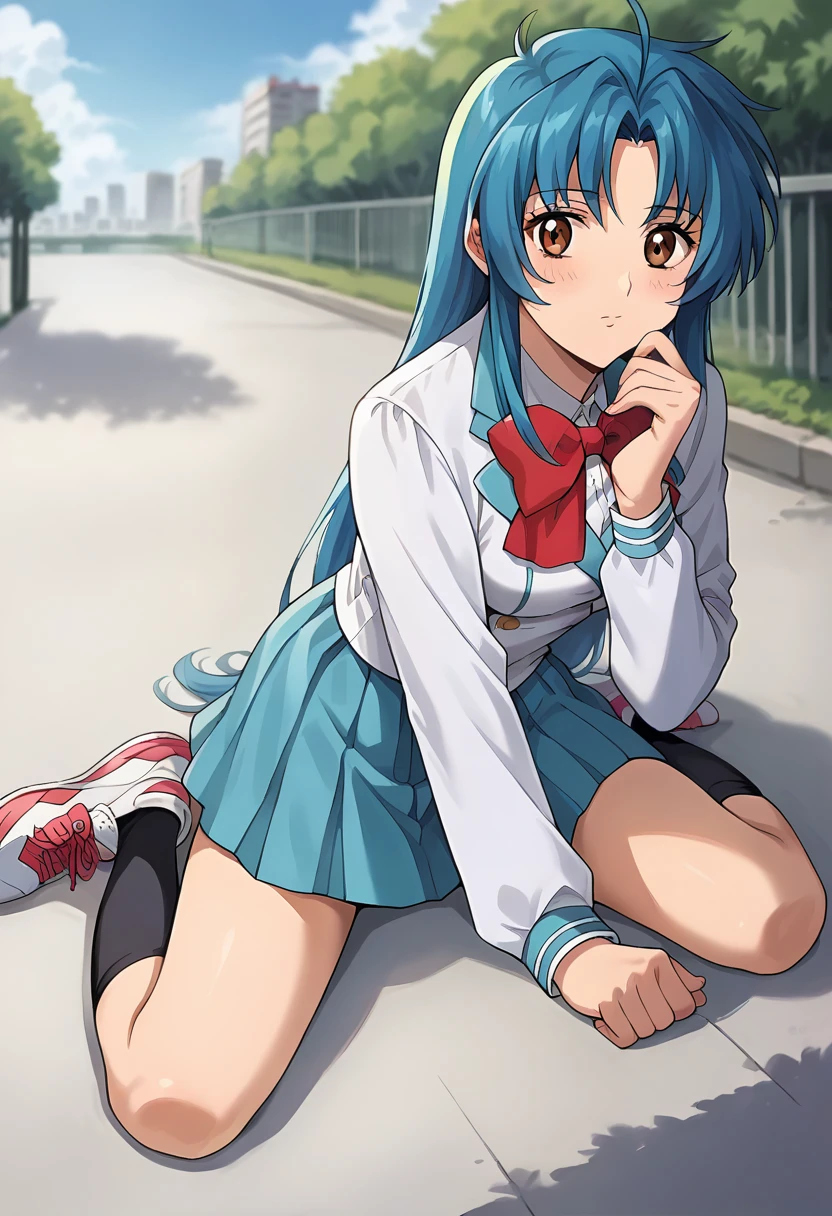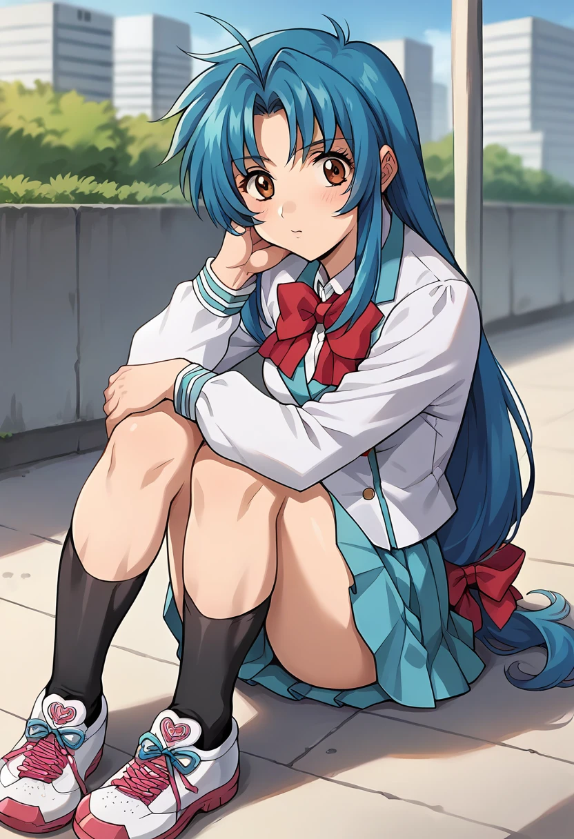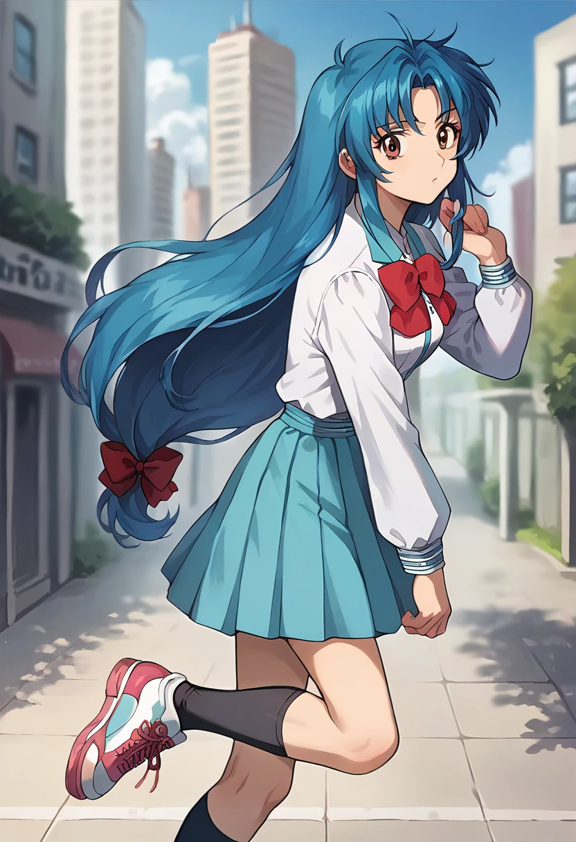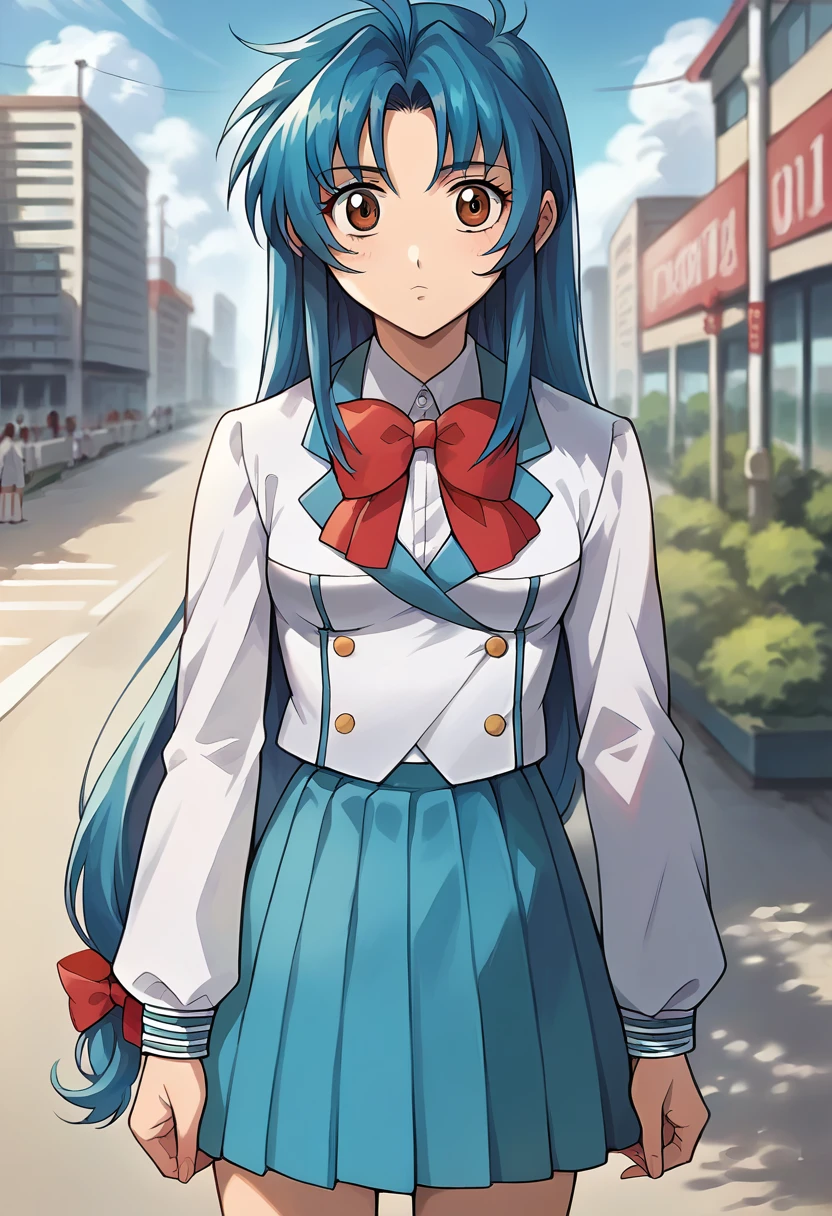 score_9, score_8_up, score_7_up, source_anime, masterpiece, 1girl, ctianchid0ri, blue hair, white blazer, red bowtie, ribbon, long sleeves, blue skirt, looking at viewer, outdoors, city, depth of field, sunny, black kneehighs,