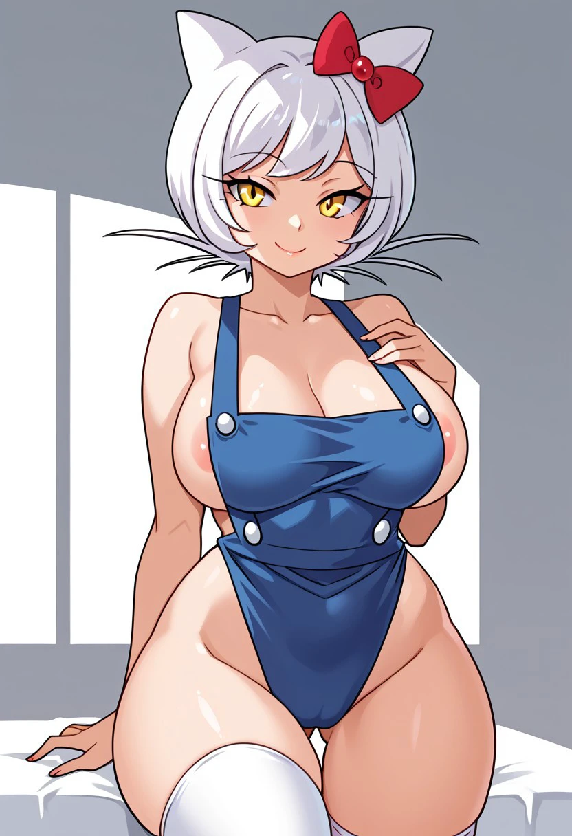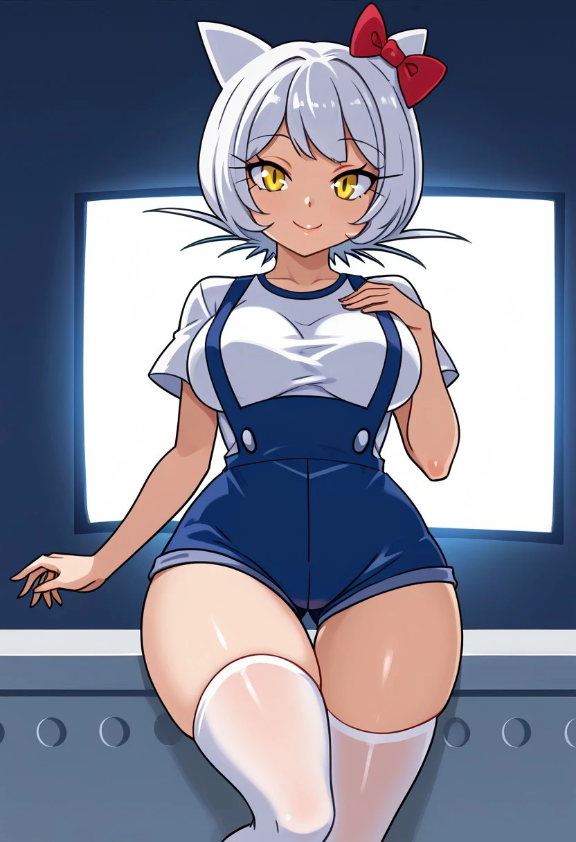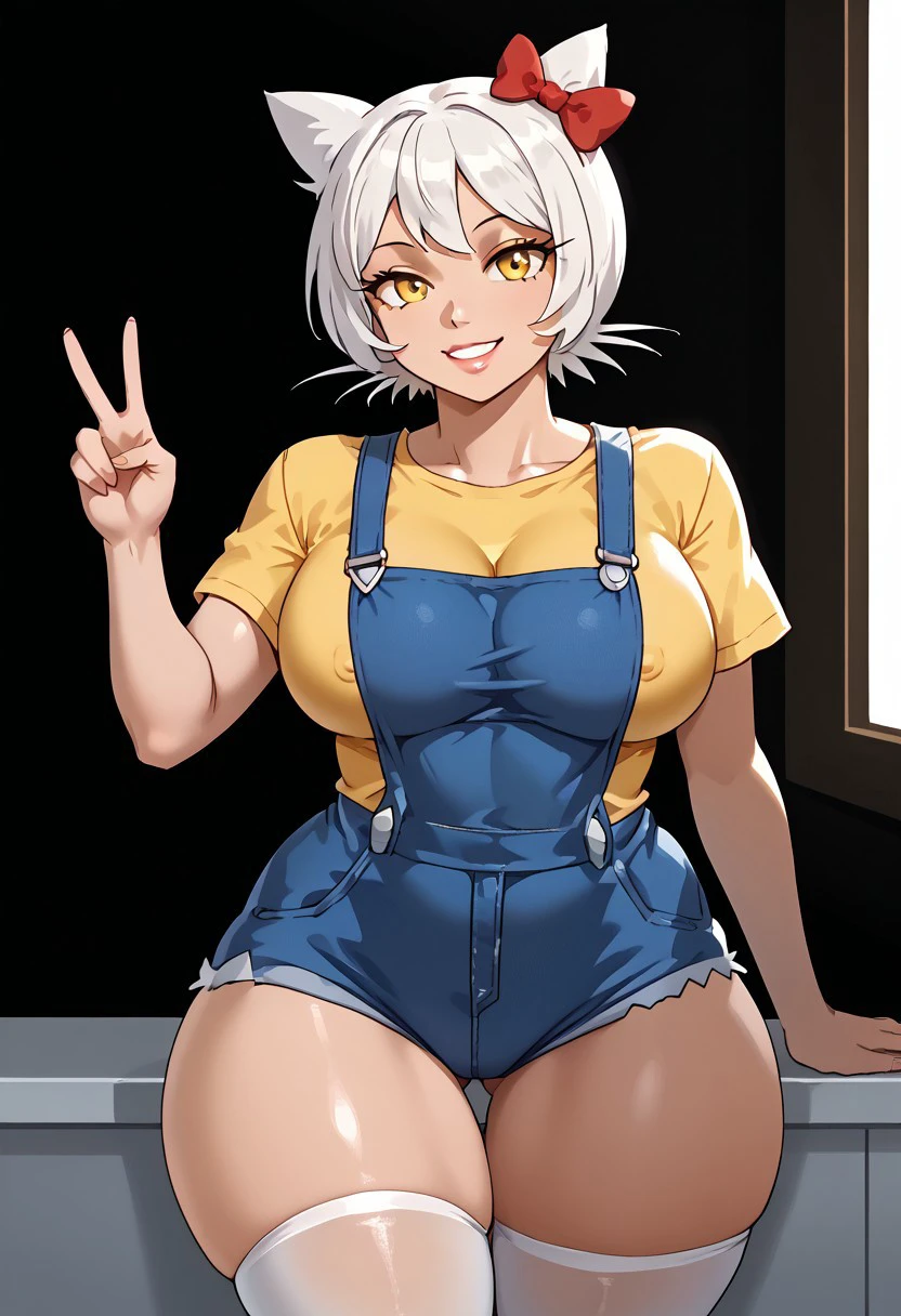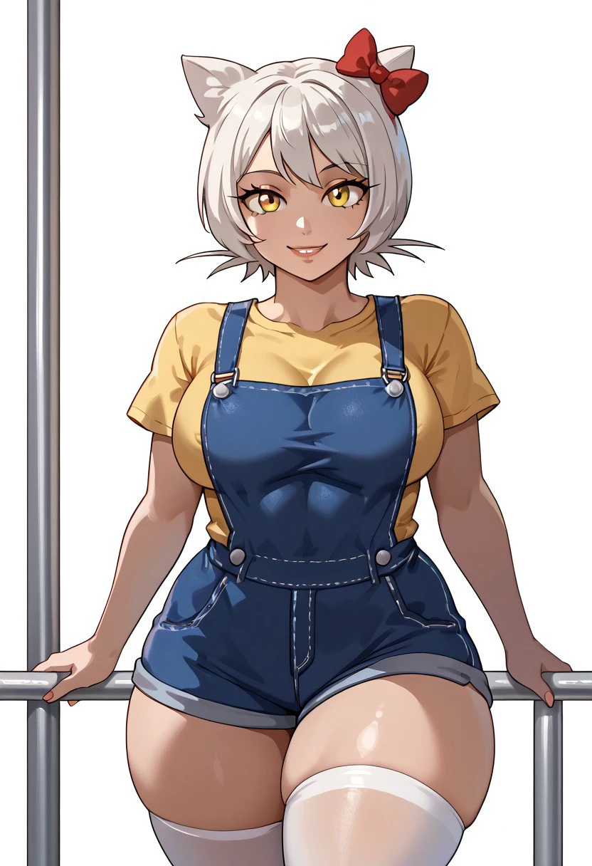 HK_M8, 1girl, yellow eyes, white hair, short hair, cat ears, big breasts, curvy, yellow shirt, short sleeves, denim overalls, bow ornament, red bow, short overalls, white stockings