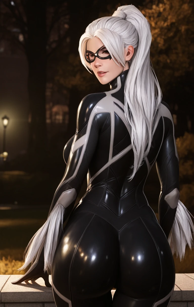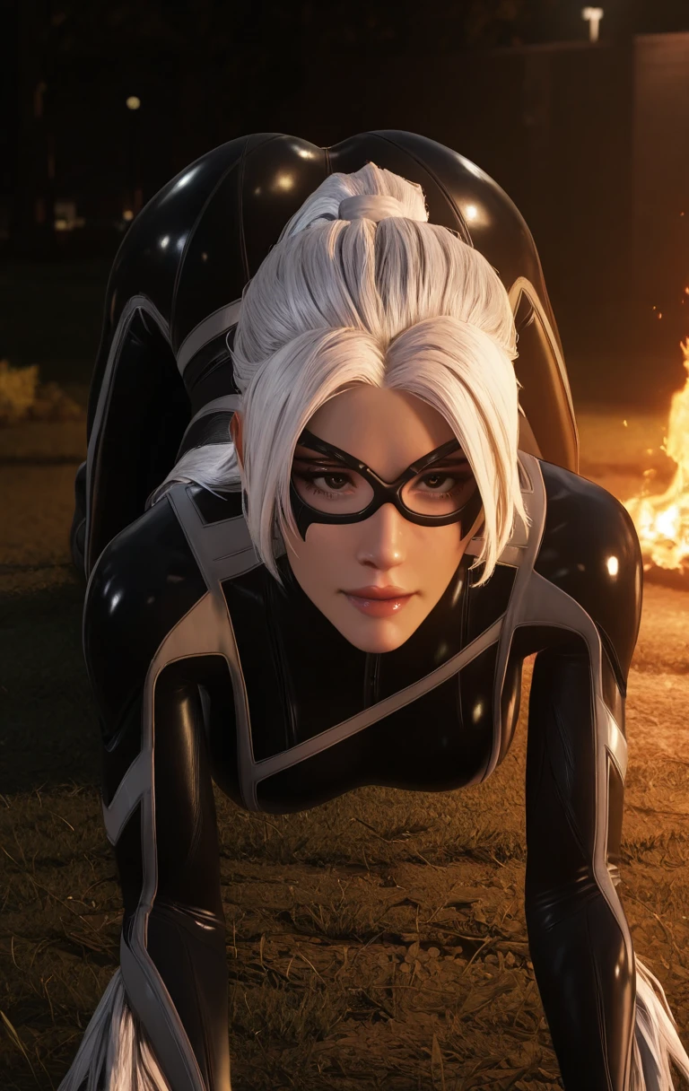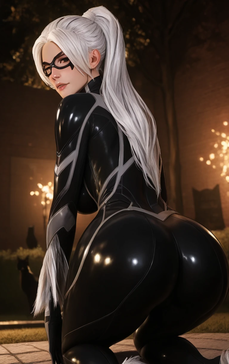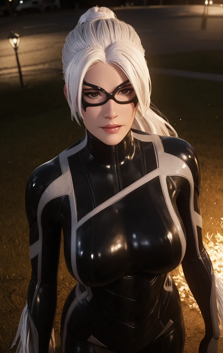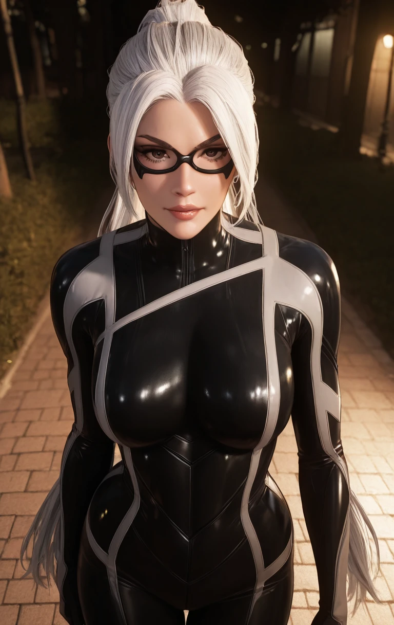 bl4ck3c4tx, 1girl, solo, long hair, looking at viewer,, brown eyes, white hair, glasses, , lips, black cat, night, mask