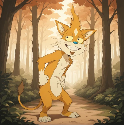 anthro, cat-like furry, furry, Squanchy, whiskers, multi-colored fur, messy fur, blue nose, tail, brown goatee, claws, yellow sclera black eyes