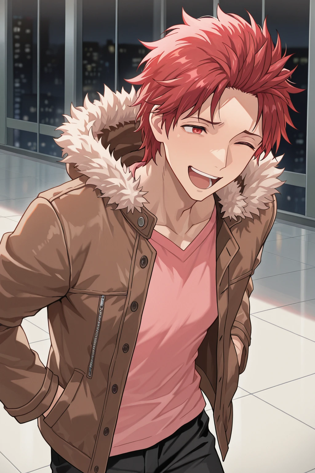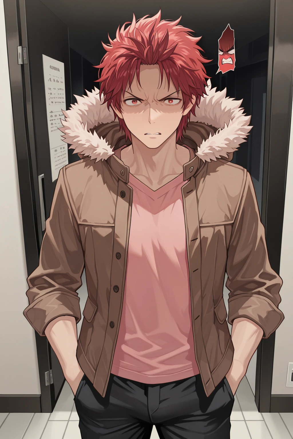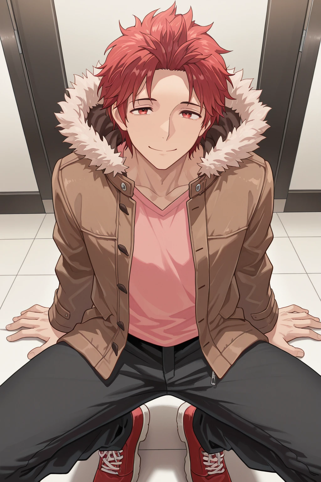 fur trim hood, brown jacket, pink shirt, black pants, red shoes,