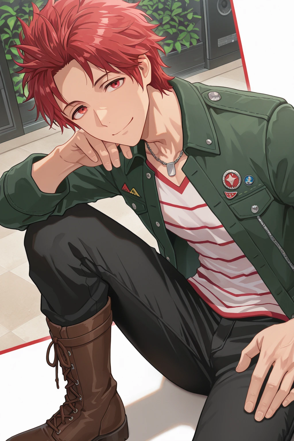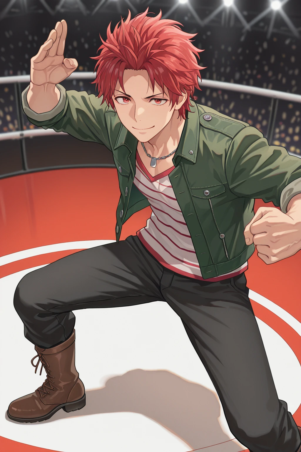 necklace, green jacket, striped shirt, red and white stripes, black pants, brown boots,