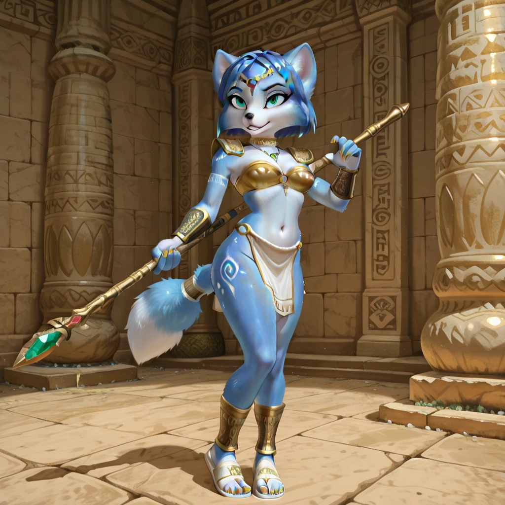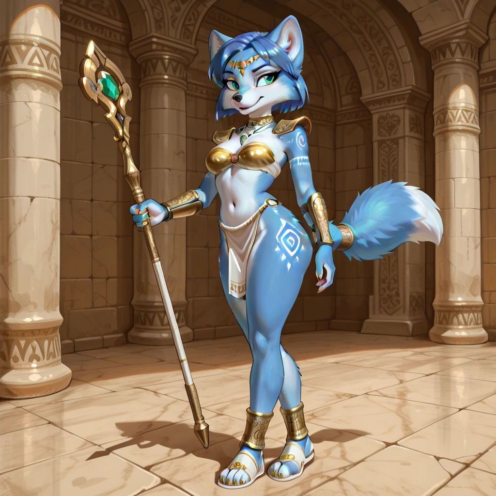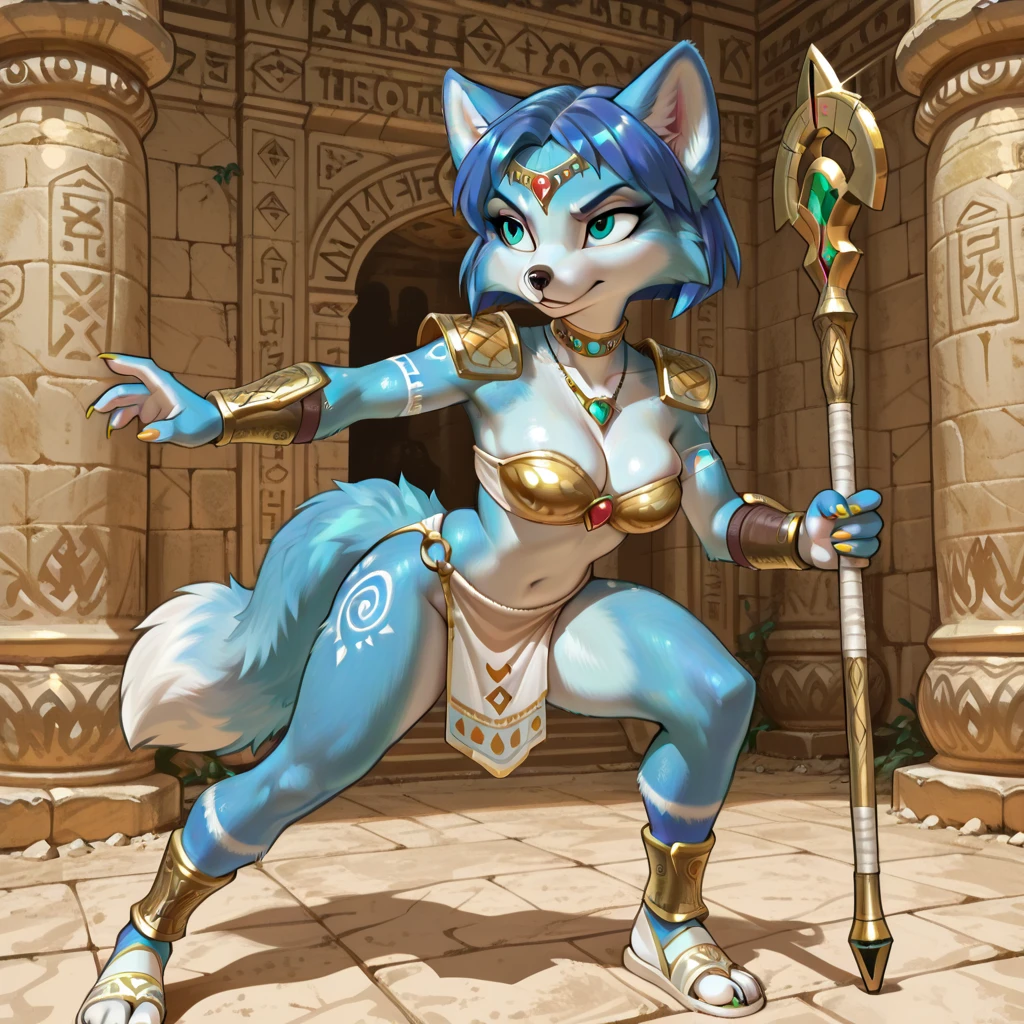 fox female, solo, curvy, light blue fur with white accents, turquoise eyes, blue short hair, blue bob hair, blue fur ears with white accents, gold nails, blue fur tail with white wrappings, ornate gold pauldrons, ornate gold bracers, ornate gold ankle guards, white open toed sandals, white loincloth with gold trim, showing thighs, ornate choker, gold cloth top with white accent, emerald necklace, gold ornate circlet with red gem, white tribal arm tattoo, white spiral thigh tattoos,