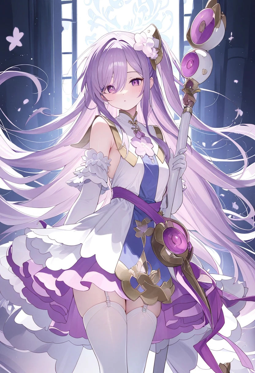 Use these tags to trigger: 1girl, shirt, skirt, gloves, sleeveless, miimu \(chunithm\), elbow gloves, floating hair, hair between eyes, purple eyes, sleeveless shirt, very long hair, white gloves, white shirt, very_long_hair, purple_hair, hair_ornament, flower_ornament, indoors, hair_ornament, flower_ornament, holding staff,garter straps,