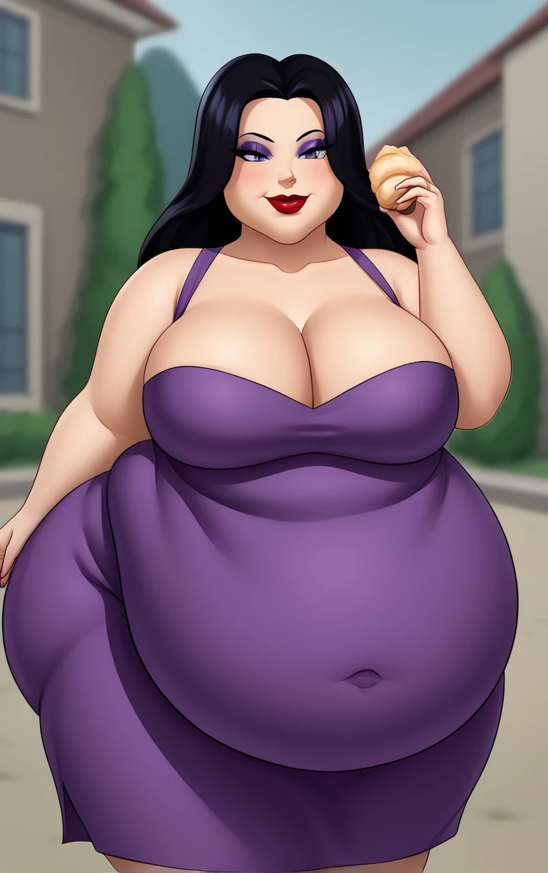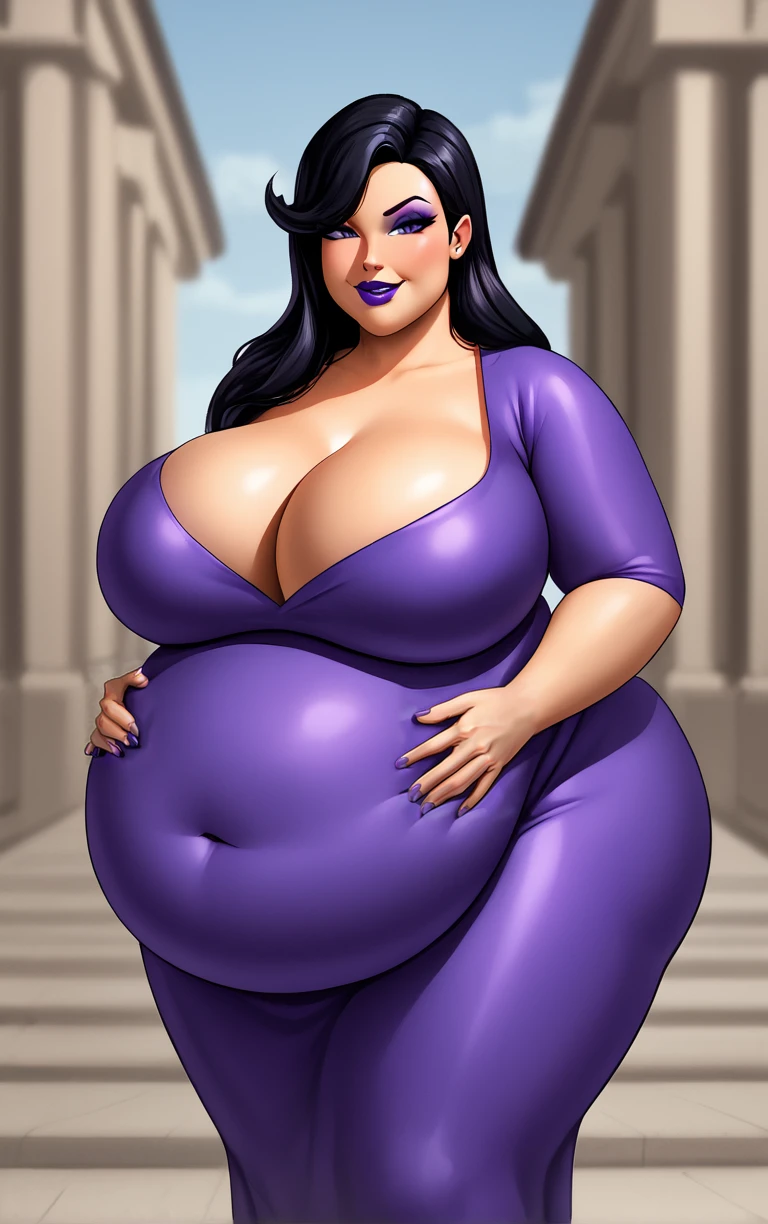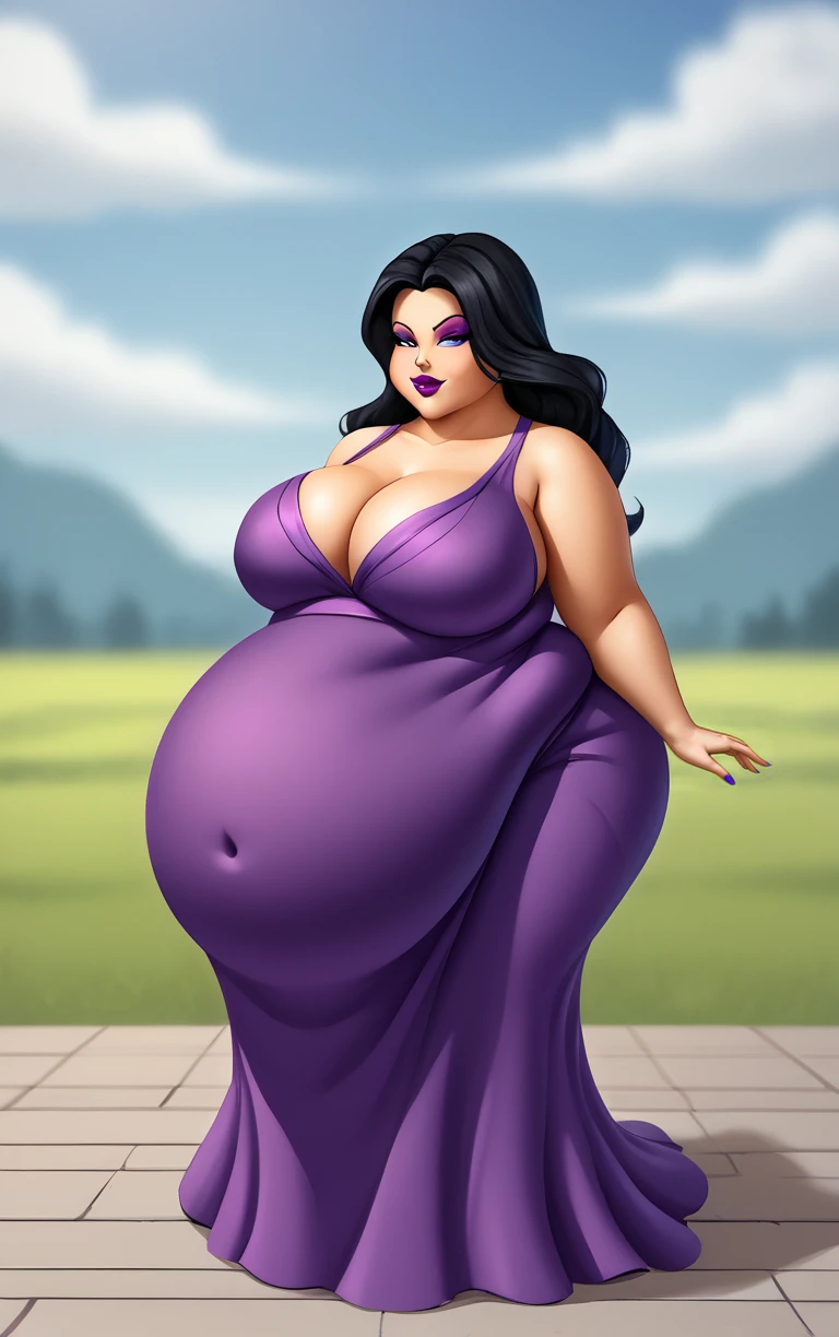 1girl, large breasts, fat, purple dress, black hair, cleavage, lipstick, makeup, long hair, big belly