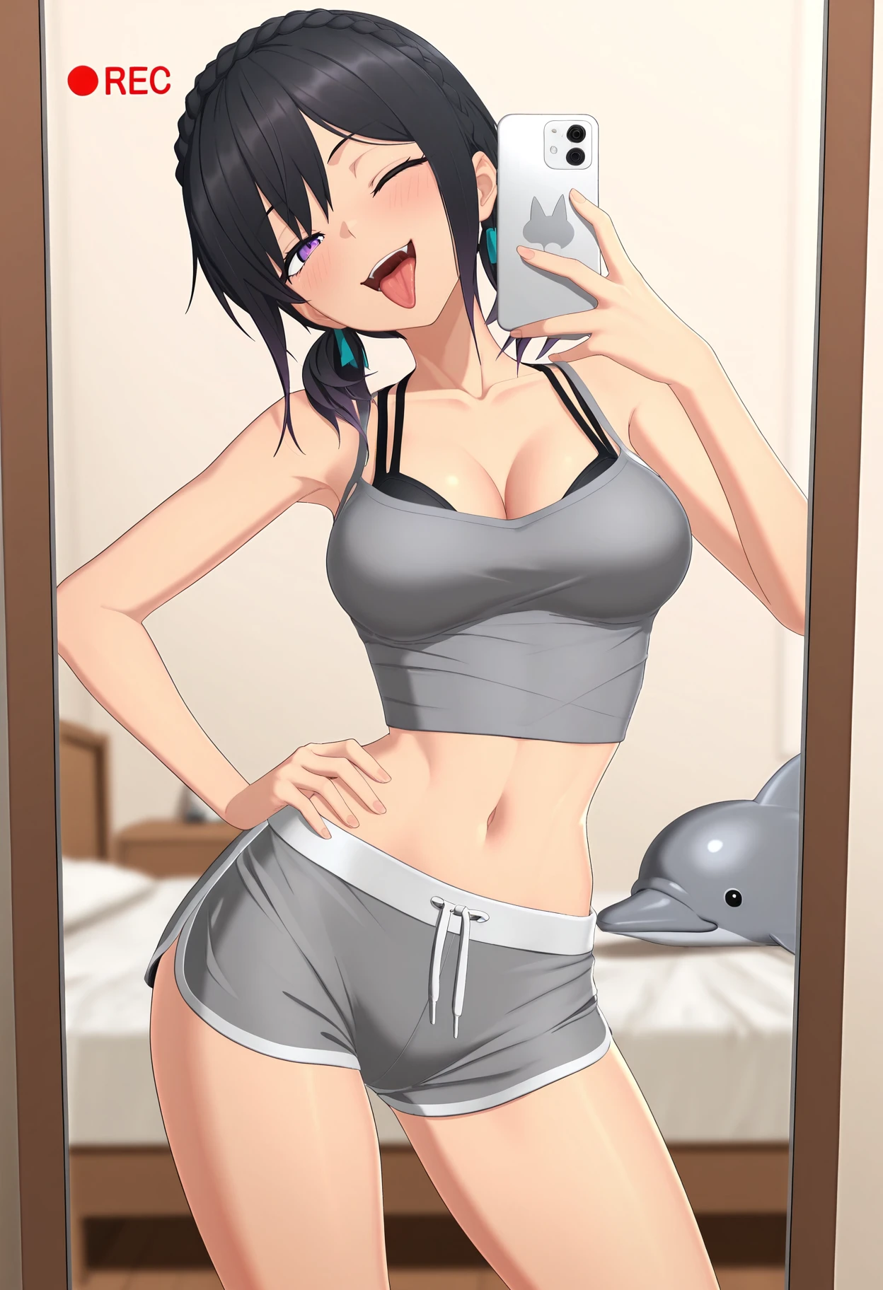 grey crop top, black bra, grey dolphin shorts,
