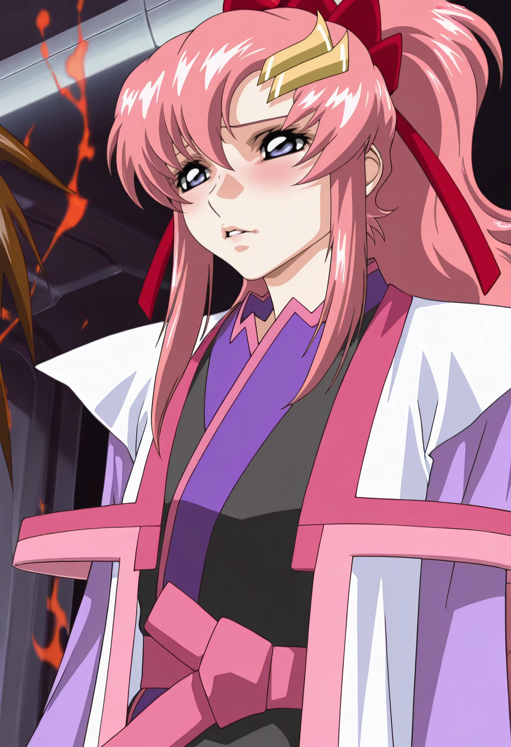 LacusOutfit, ponytail, ribbon, japanese clothes, hair ribbon, sidelocks, kimono, red ribbon, hairclip, long sleeves, high ponytail, purple kimono, black kimono, wide ponytail, bow, hair bow, sash, open clothes, red bow,