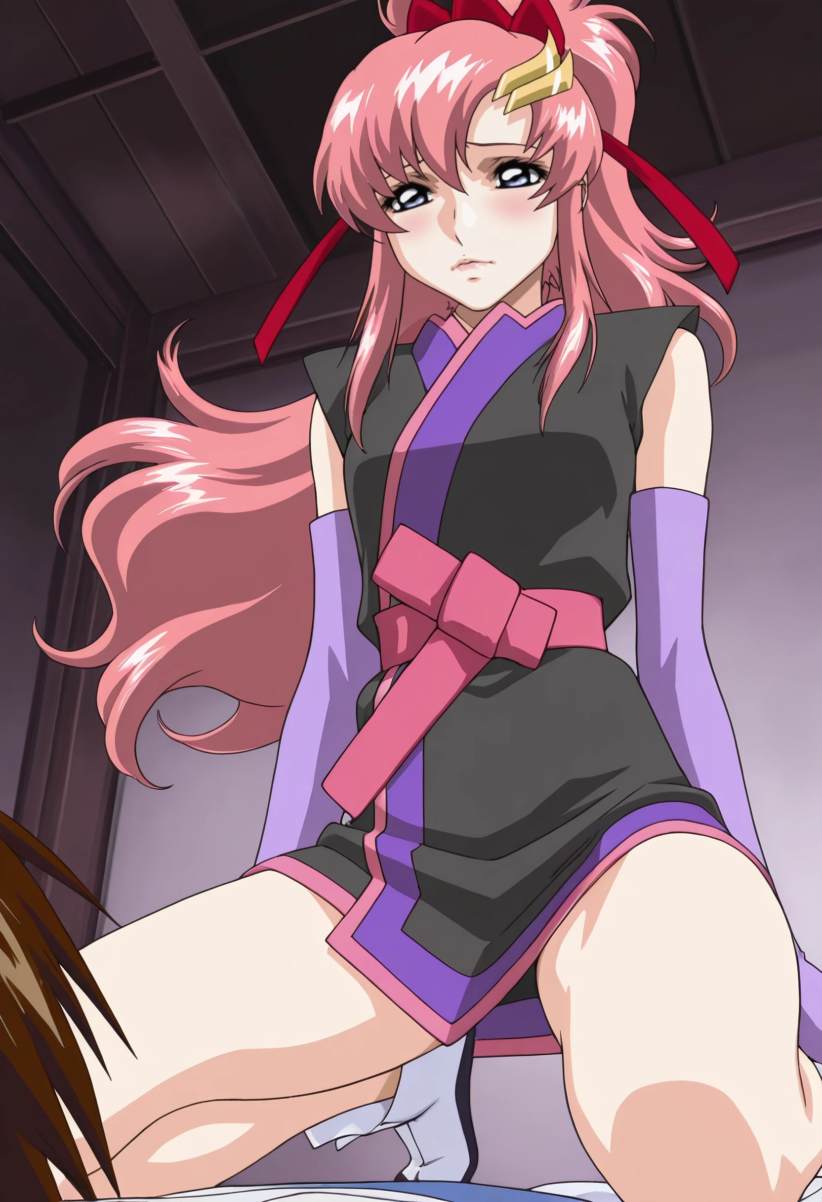 LacusKimono, ponytail, japanese clothes, kimono, gloves, elbow gloves, sash, ribbon, sleeveless kimono, short kimono, sleeveless, hair ribbon, bare legs, red ribbon, sidelocks, high ponytail, hairclip, black kimono, bow, hair bow, wide ponytail, red bow, purple gloves, fingerless gloves,