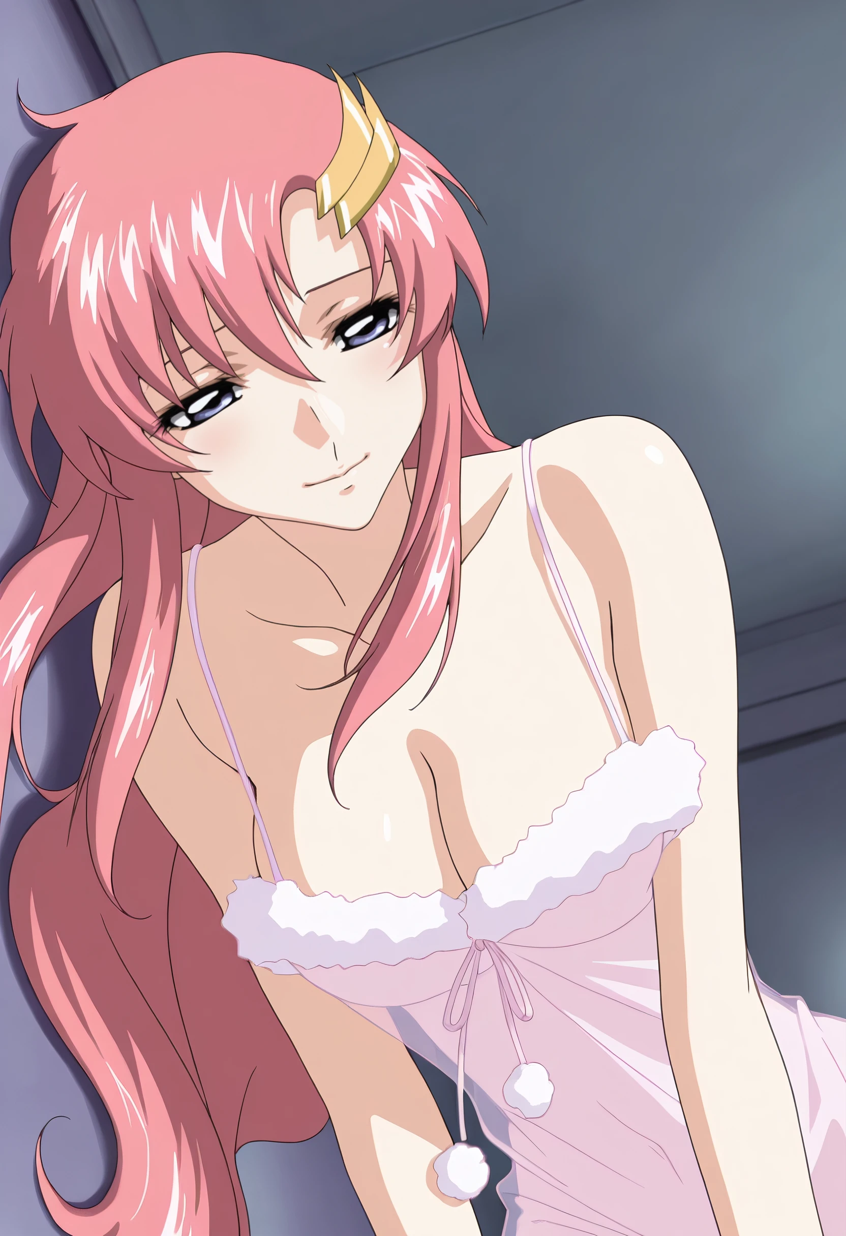 LacusSleepwear, nightgown, see-through clothes, lingerie, camisole, chemise, spaghetti strap, negligee, cleavage, white nightgown, sidelocks, pink camisole, bare shoulders, underwear, sleepwear, fur trim,