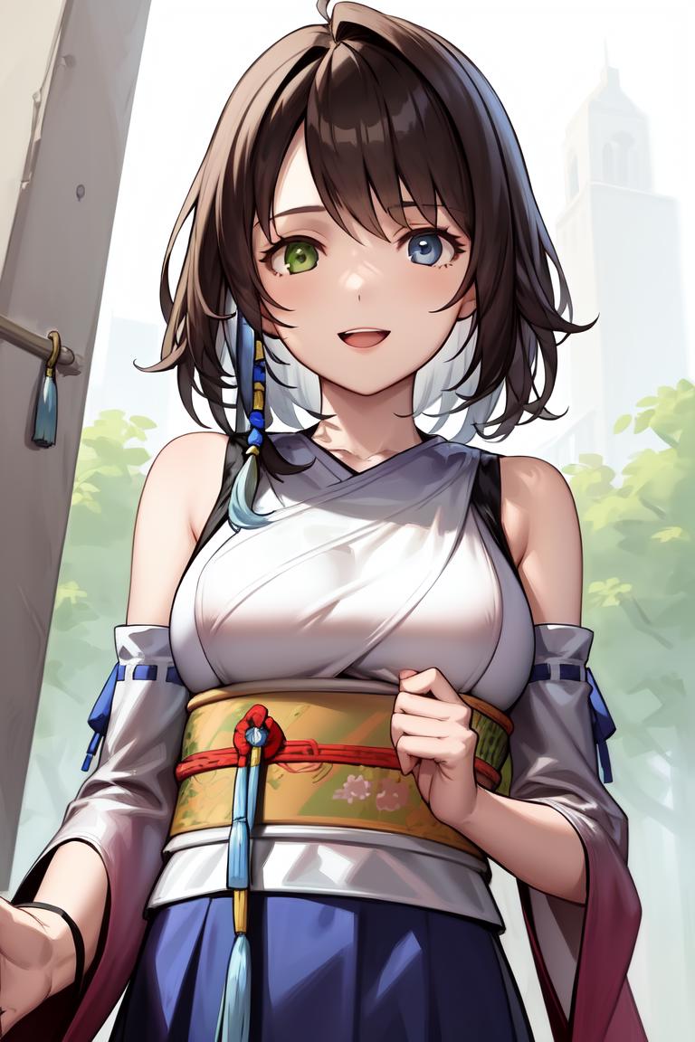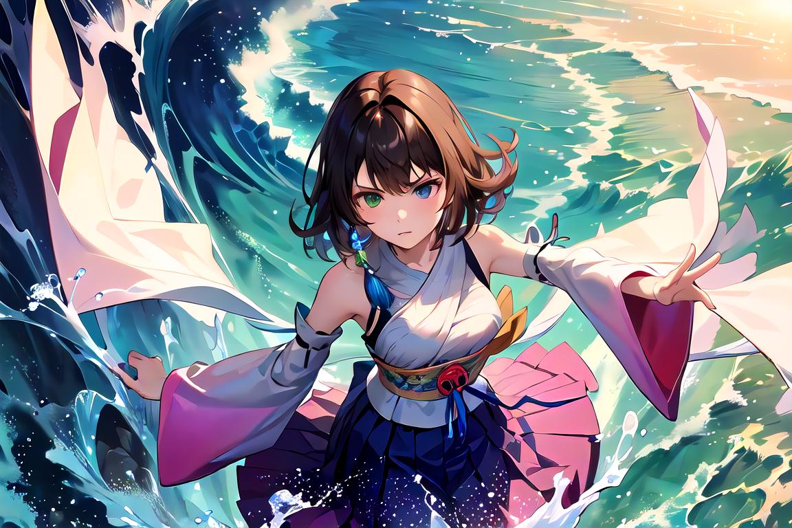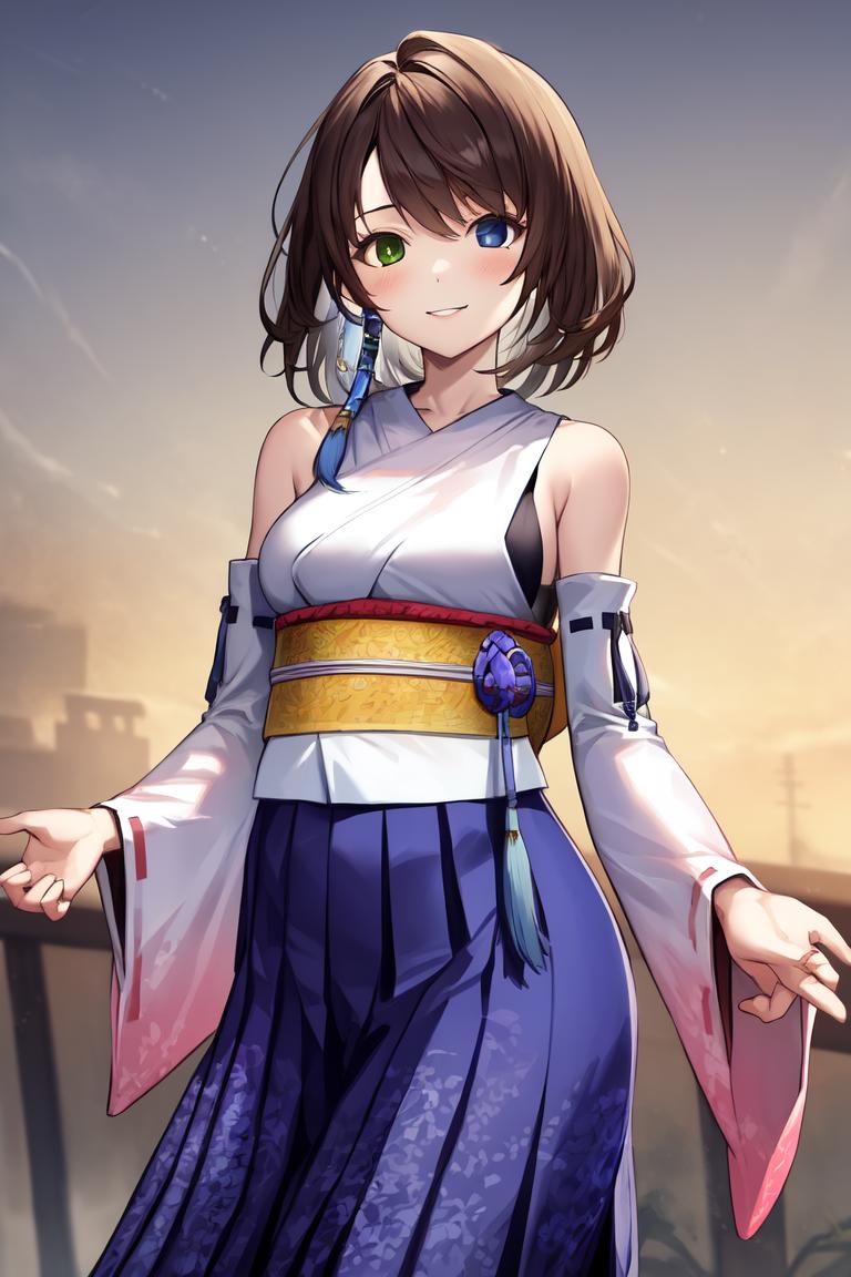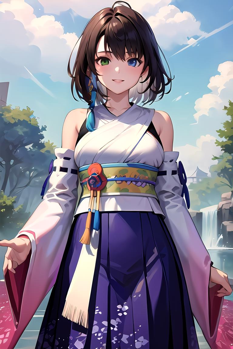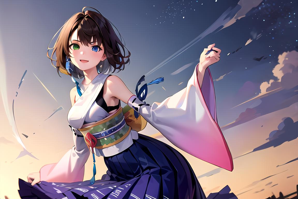 "YunaFFX, heterochromia, short hair, YunaOutfit, hair ornament, detached sleeves, hakama, sash, hakama skirt, long skirt"