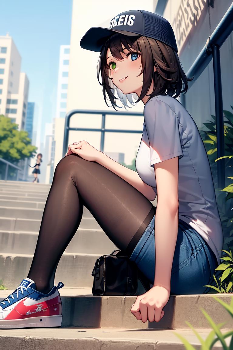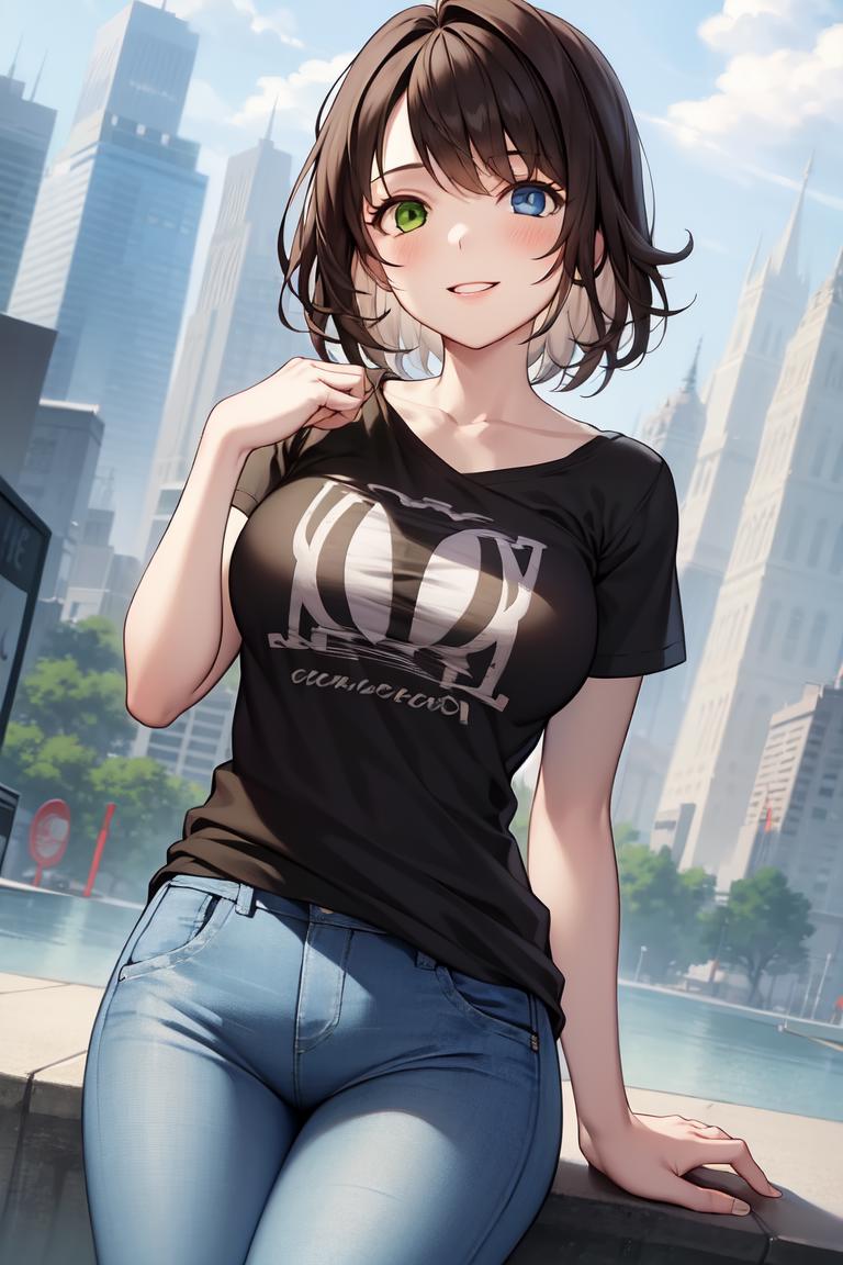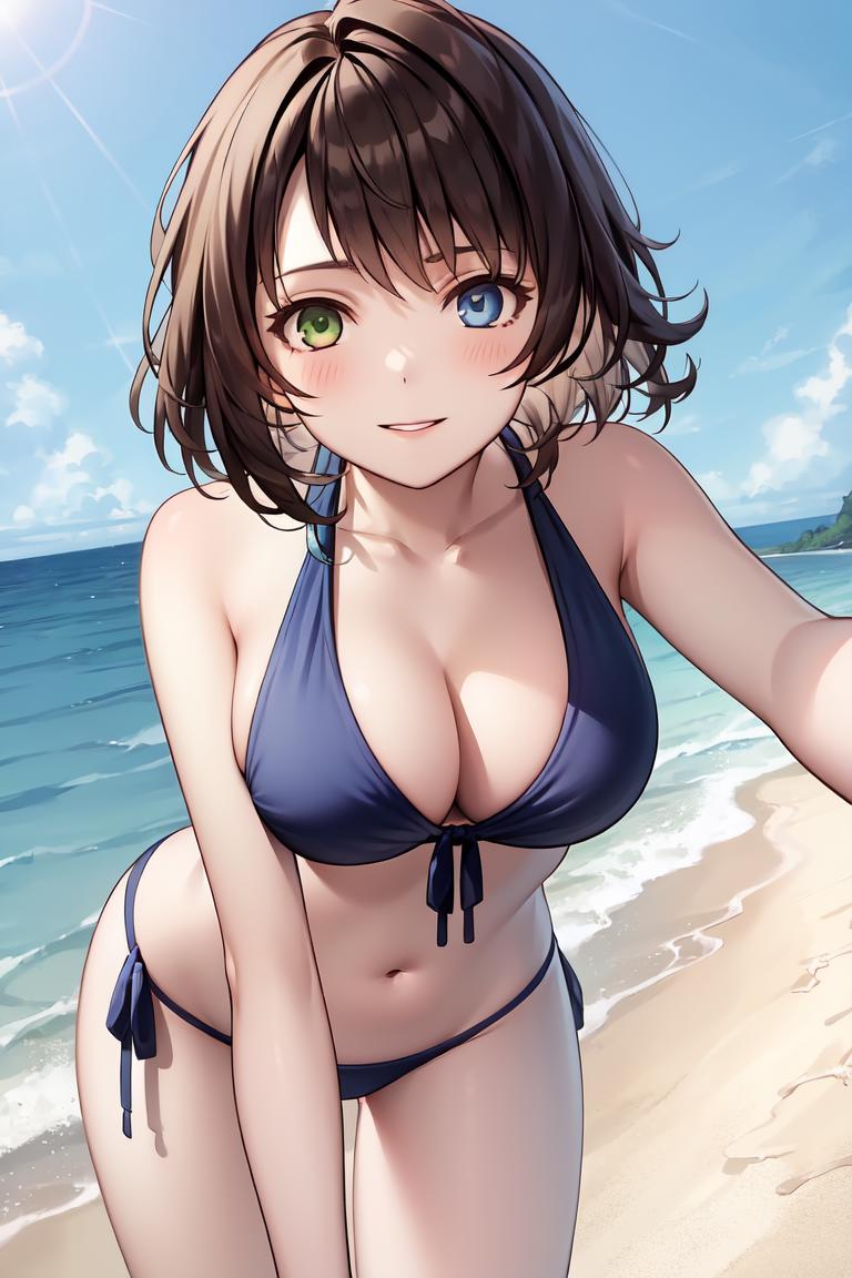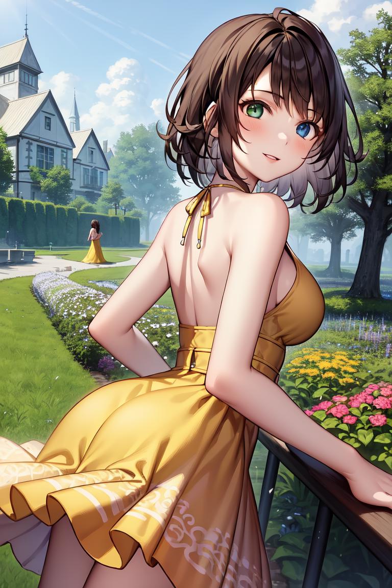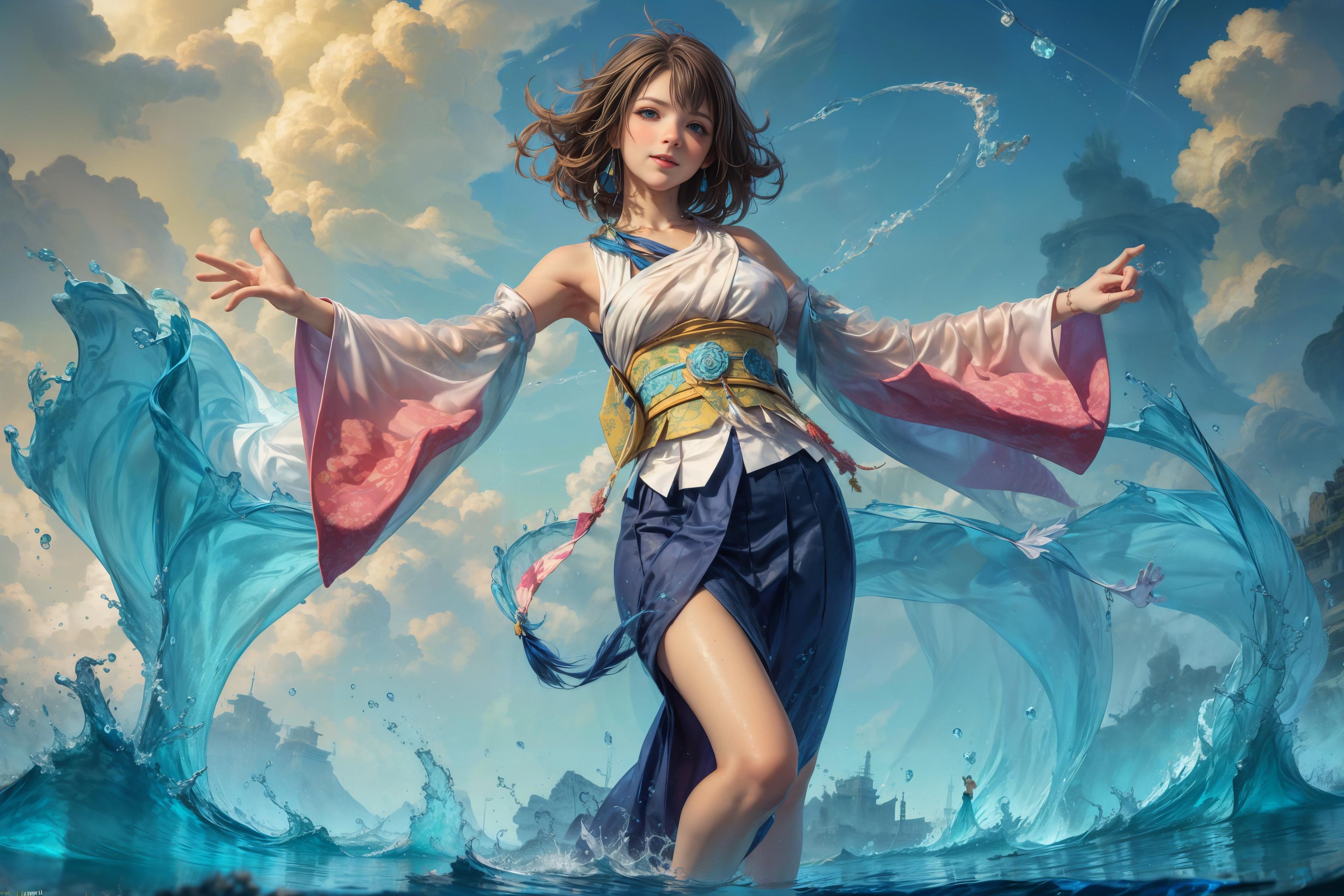 "YunaFFX, heterochromia, short hair, YunaOutfit, hair ornament, detached sleeves, hakama, sash, hakama skirt, long skirt"