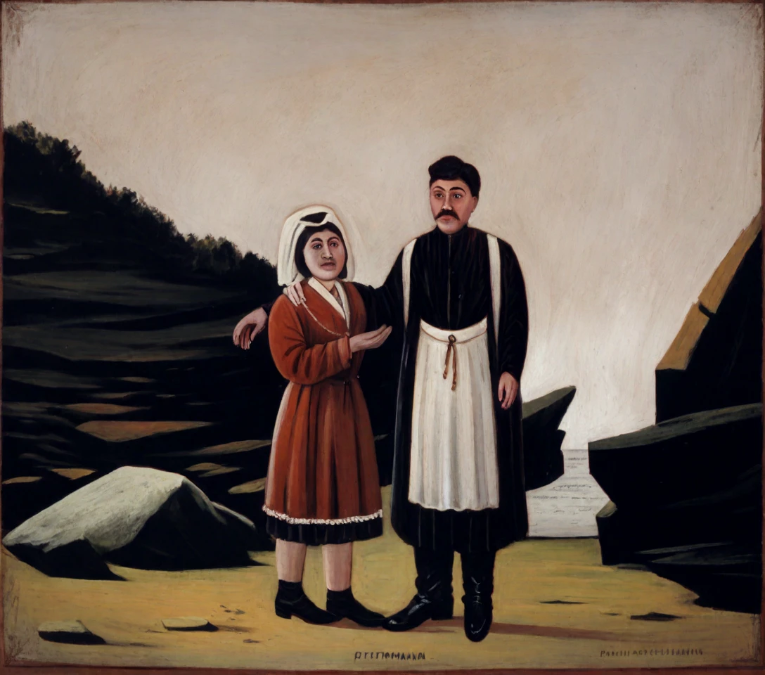 ' <name of painting> ' by pirosmani niko in <year>, naïve art \(primitivism\) \(style\), <genre(s)>, <tags>