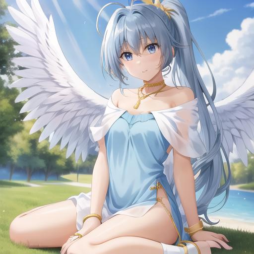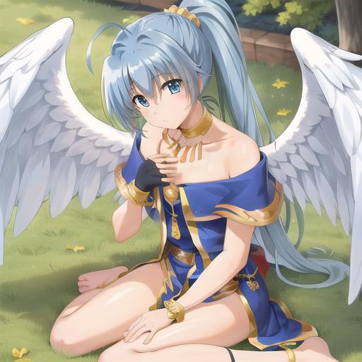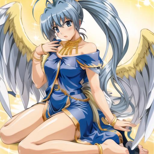 Belldandy's outfit: necklace, gold necklace, bracelets, gold bracelets, gloves, blue gloves, fingerless gloves, goddess dress, socks, fingerless socks, blue socks, anklets, gold anklets, angel, wings, angel wings, white wings