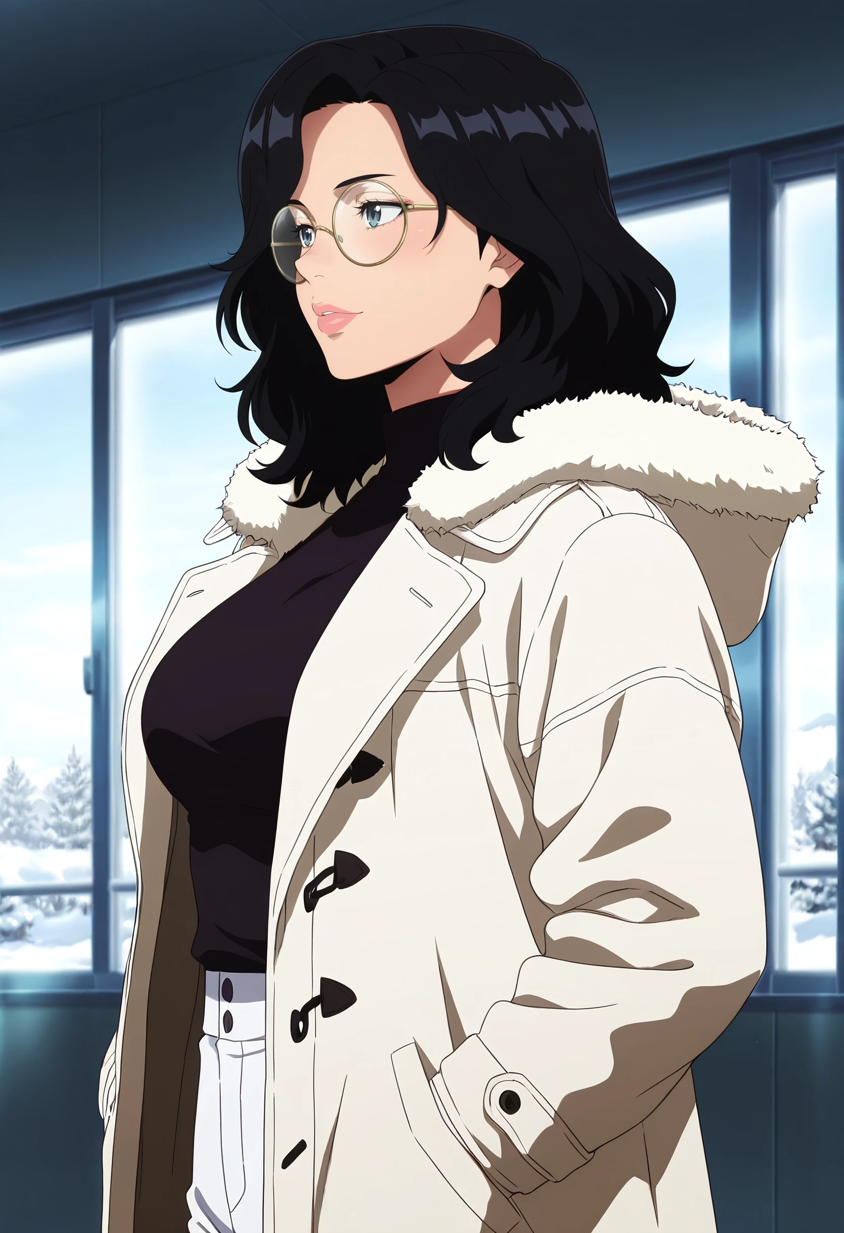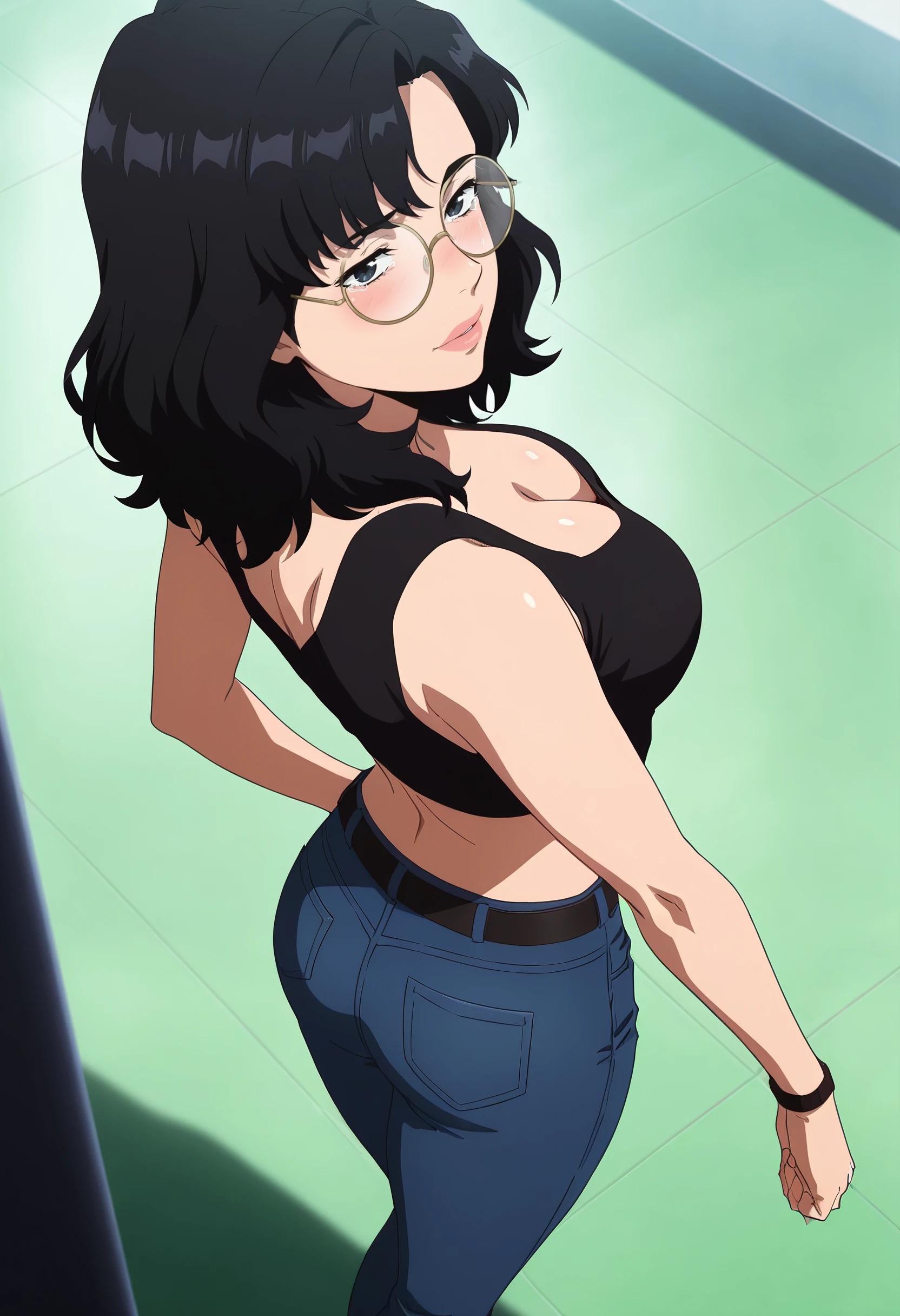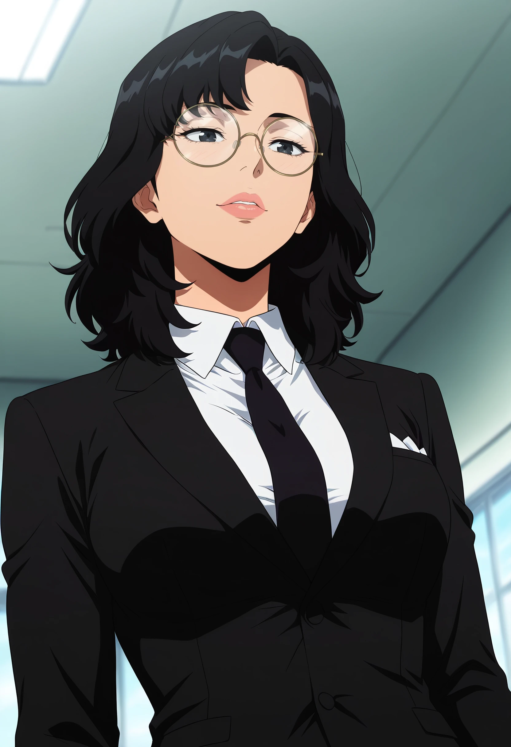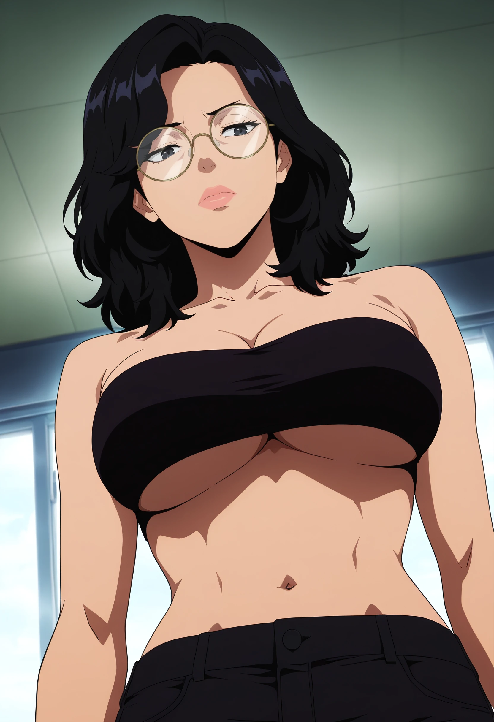 SCDMilena, black eyes, black hair, medium hair, short hair, bangs, long hair, glasses, round eyewear, lips,