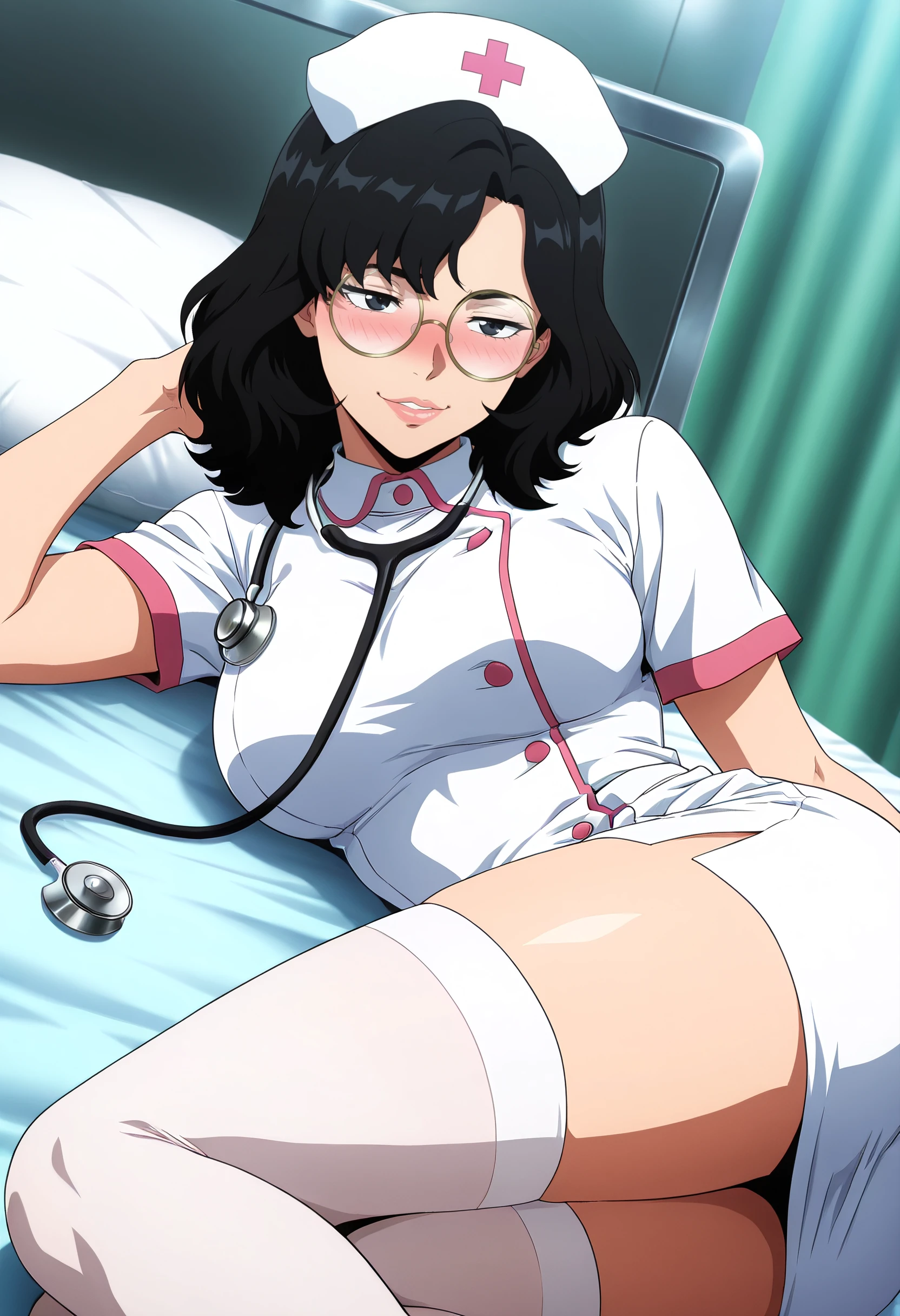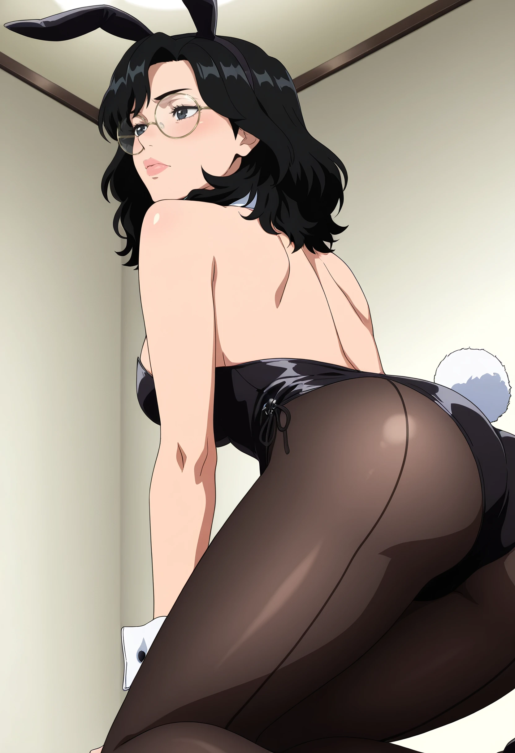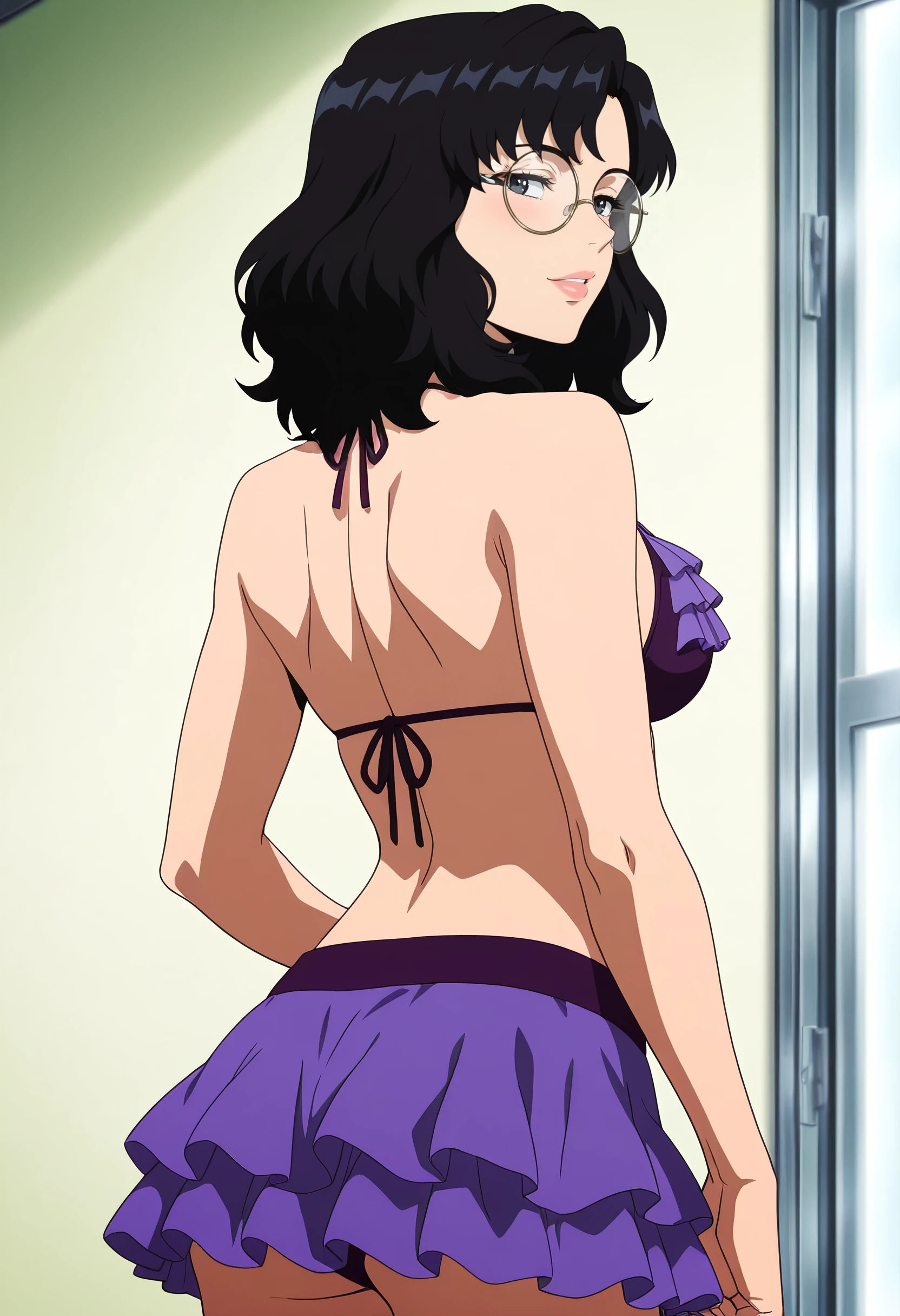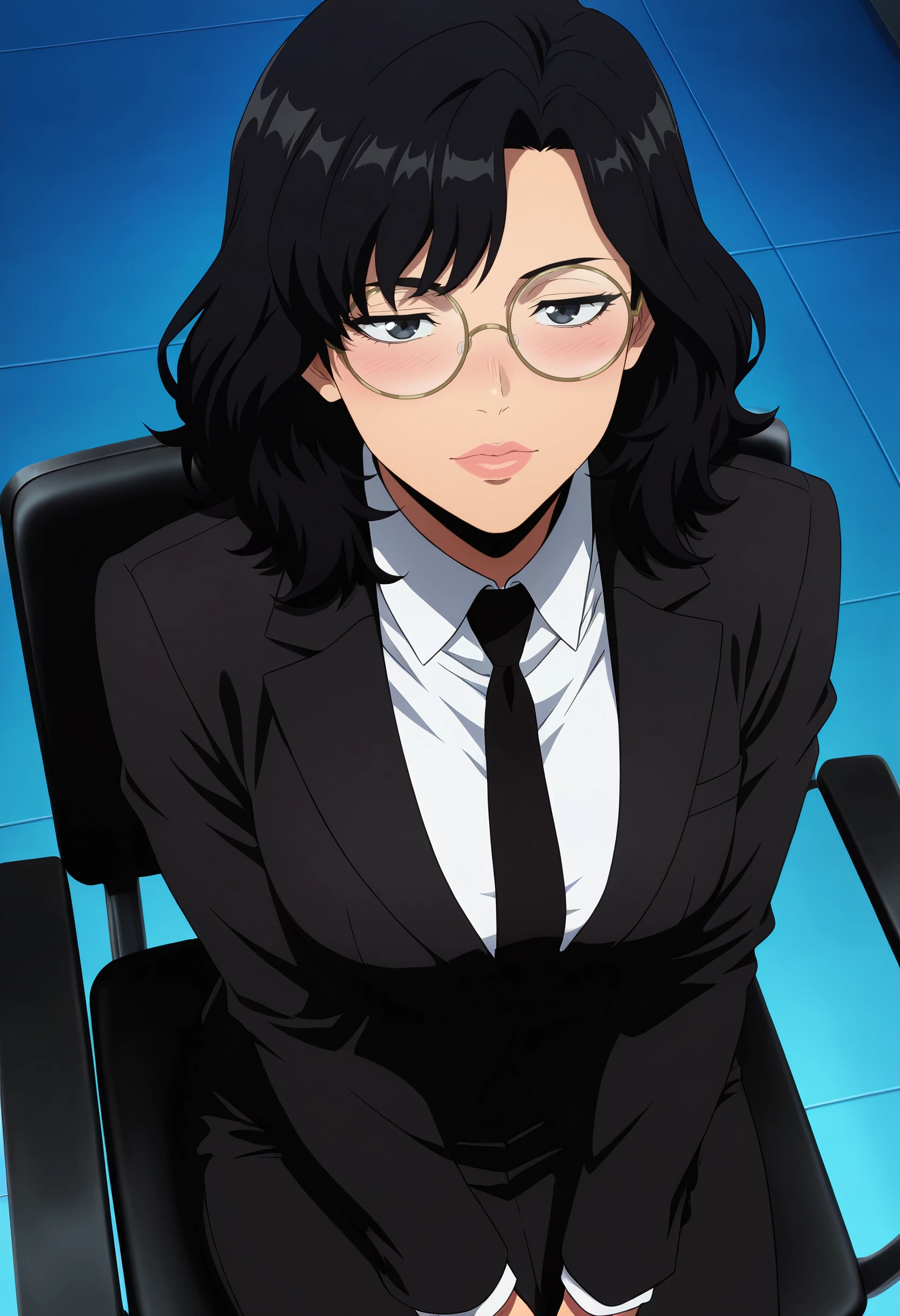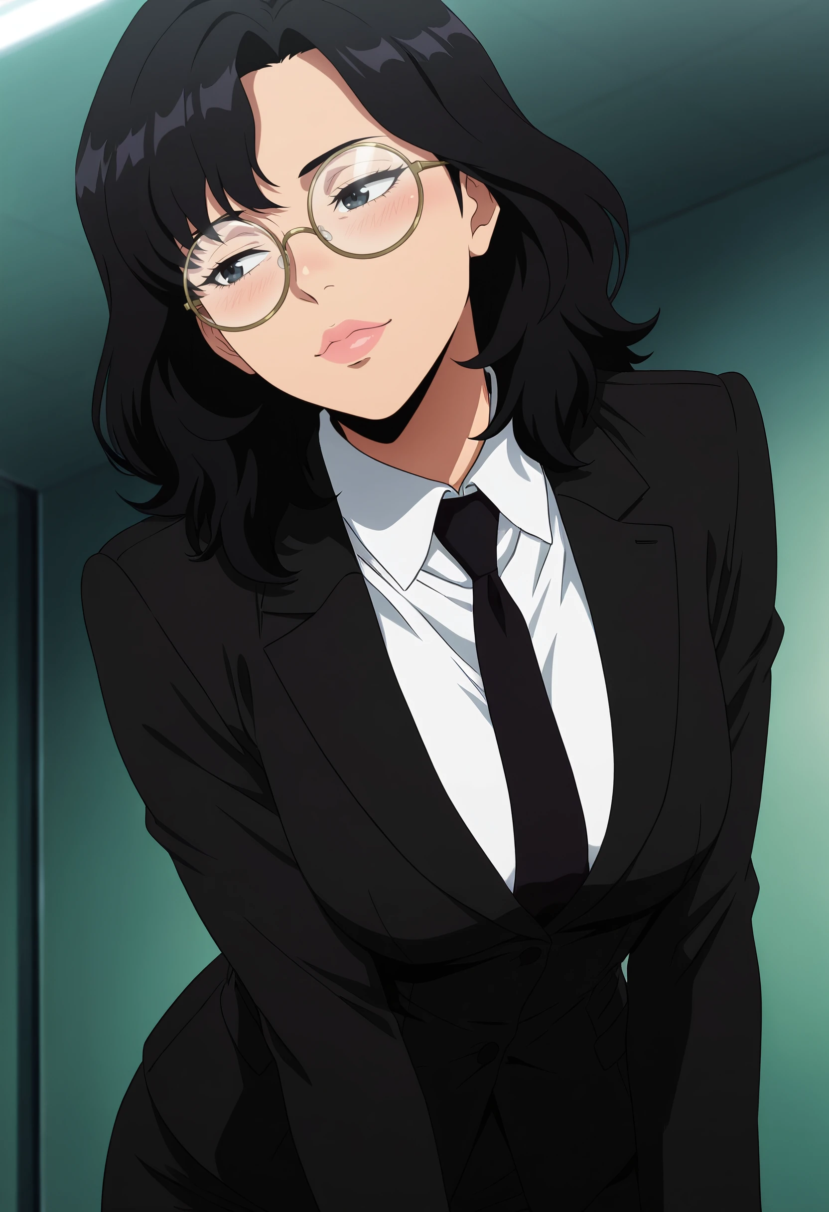 SCDMilena, black eyes, black hair, medium hair, short hair, bangs, long hair, glasses, round eyewear, lips,