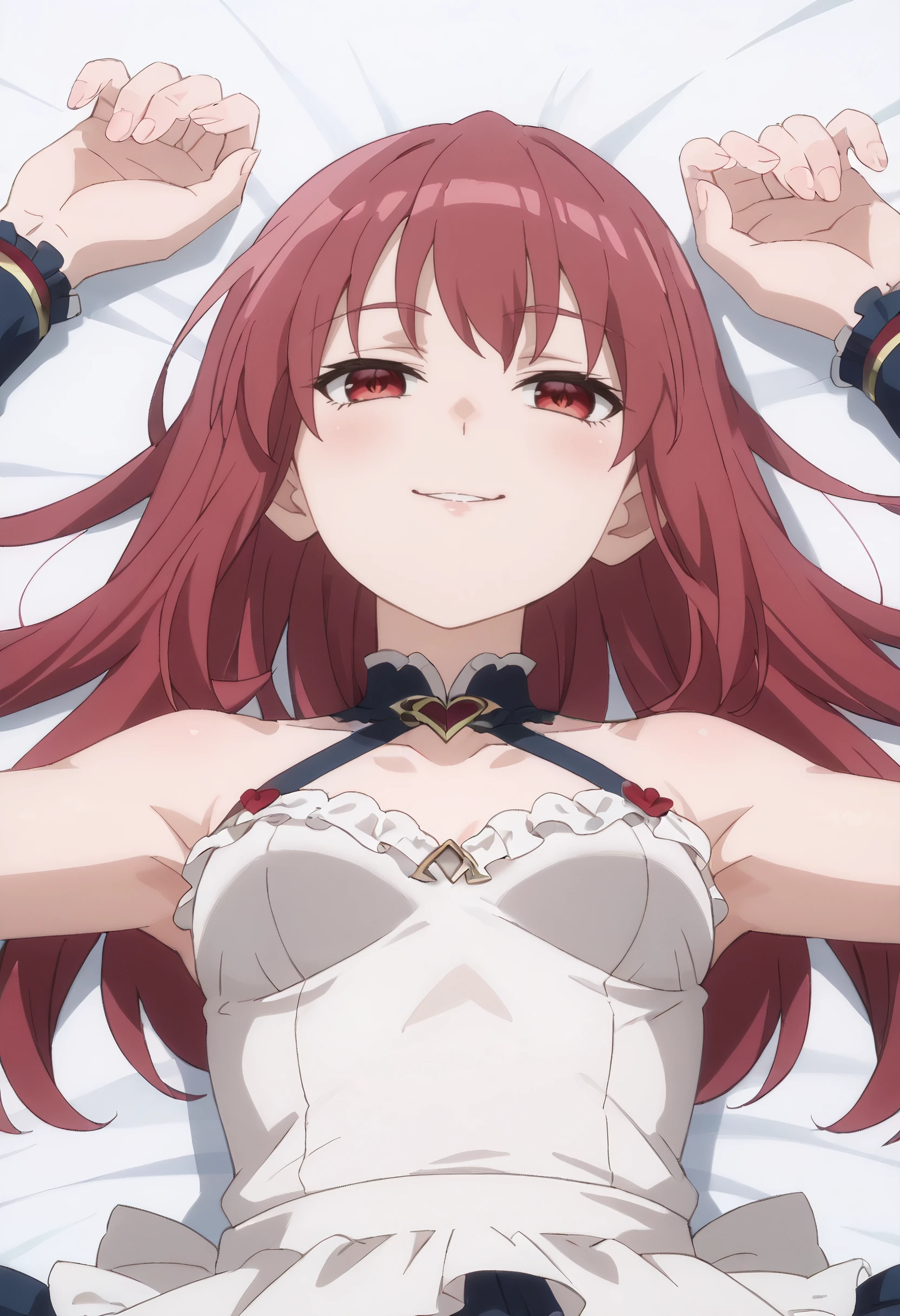 AMGRedGirl, red hair, long hair, bangs, eyebrows visible through hair, red eyes, hair between eyes,