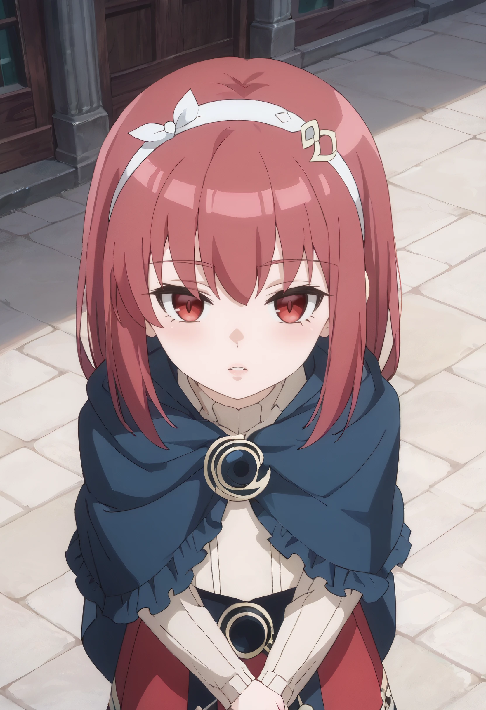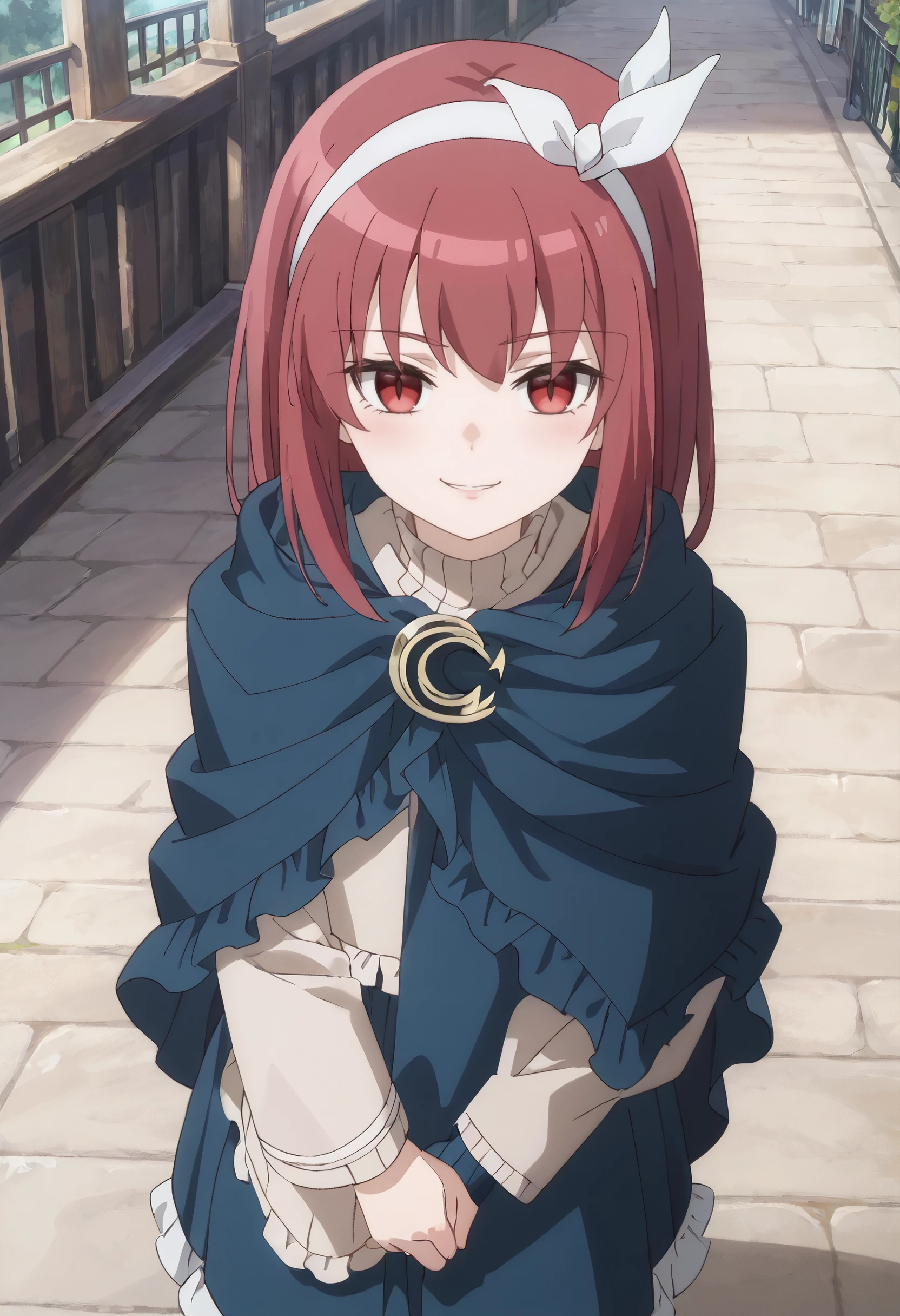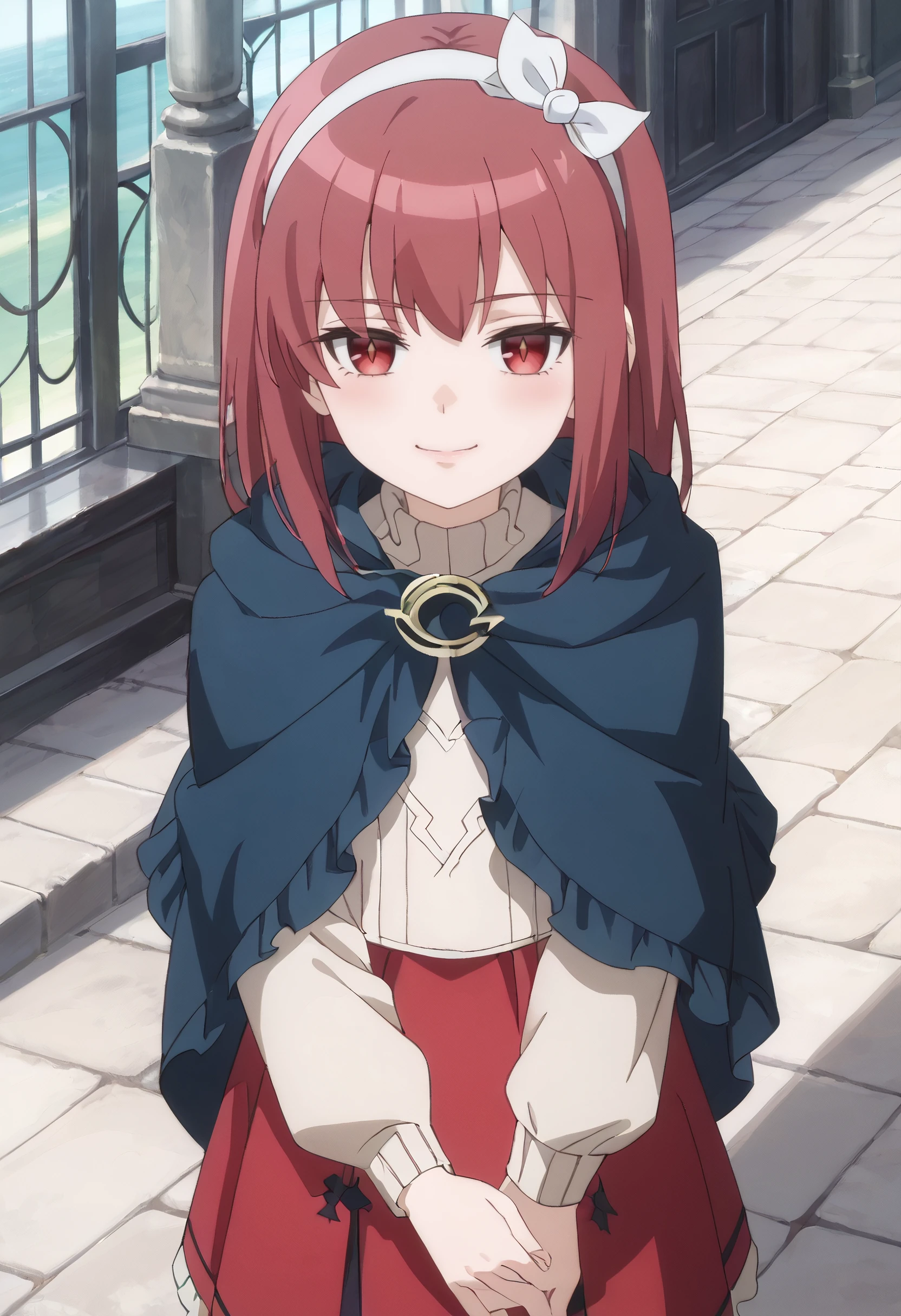cape, hairband, capelet, dress, skirt, hood, hood down, long sleeves, white hairband, red skirt, black cape, sweater, white sweater,