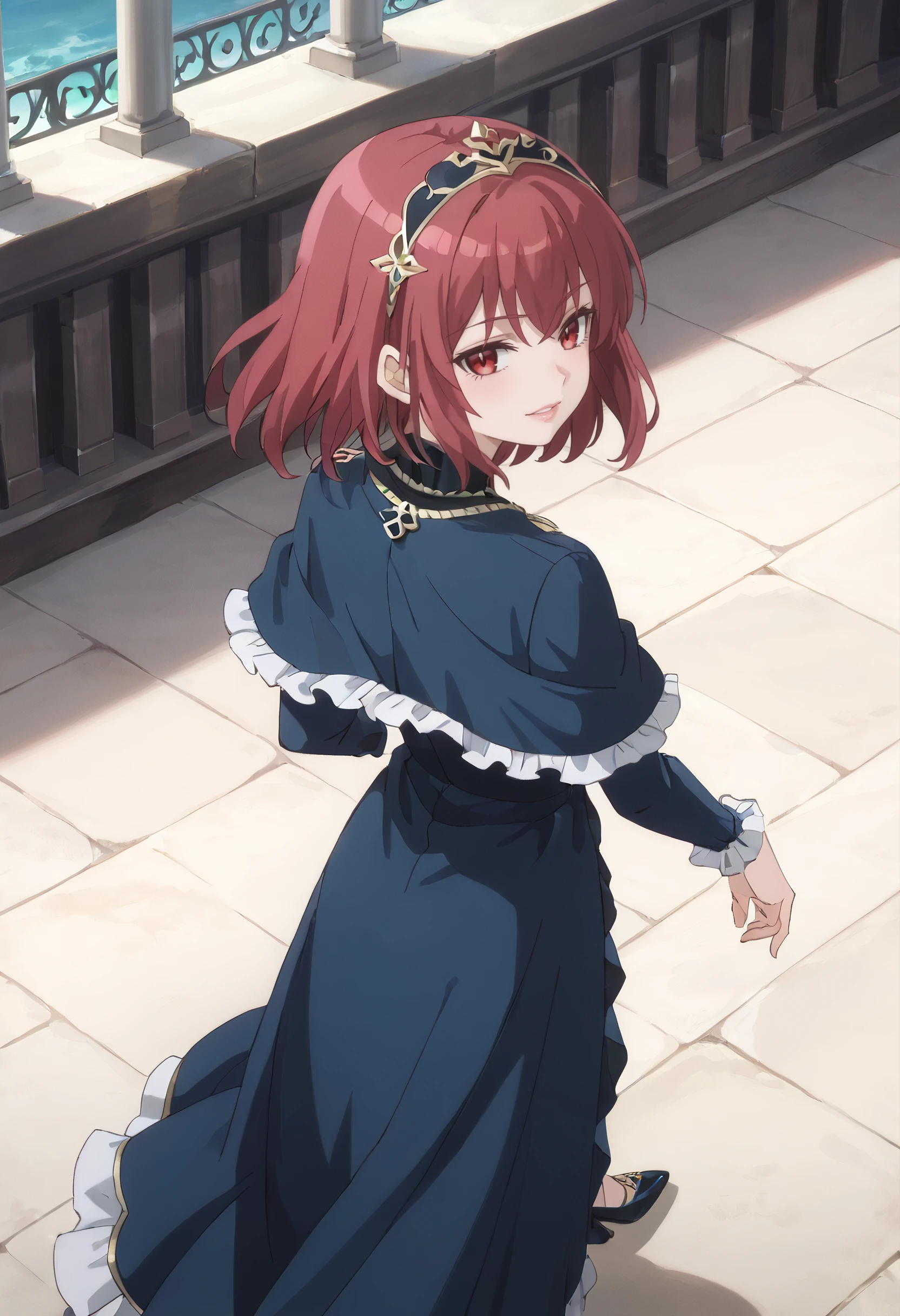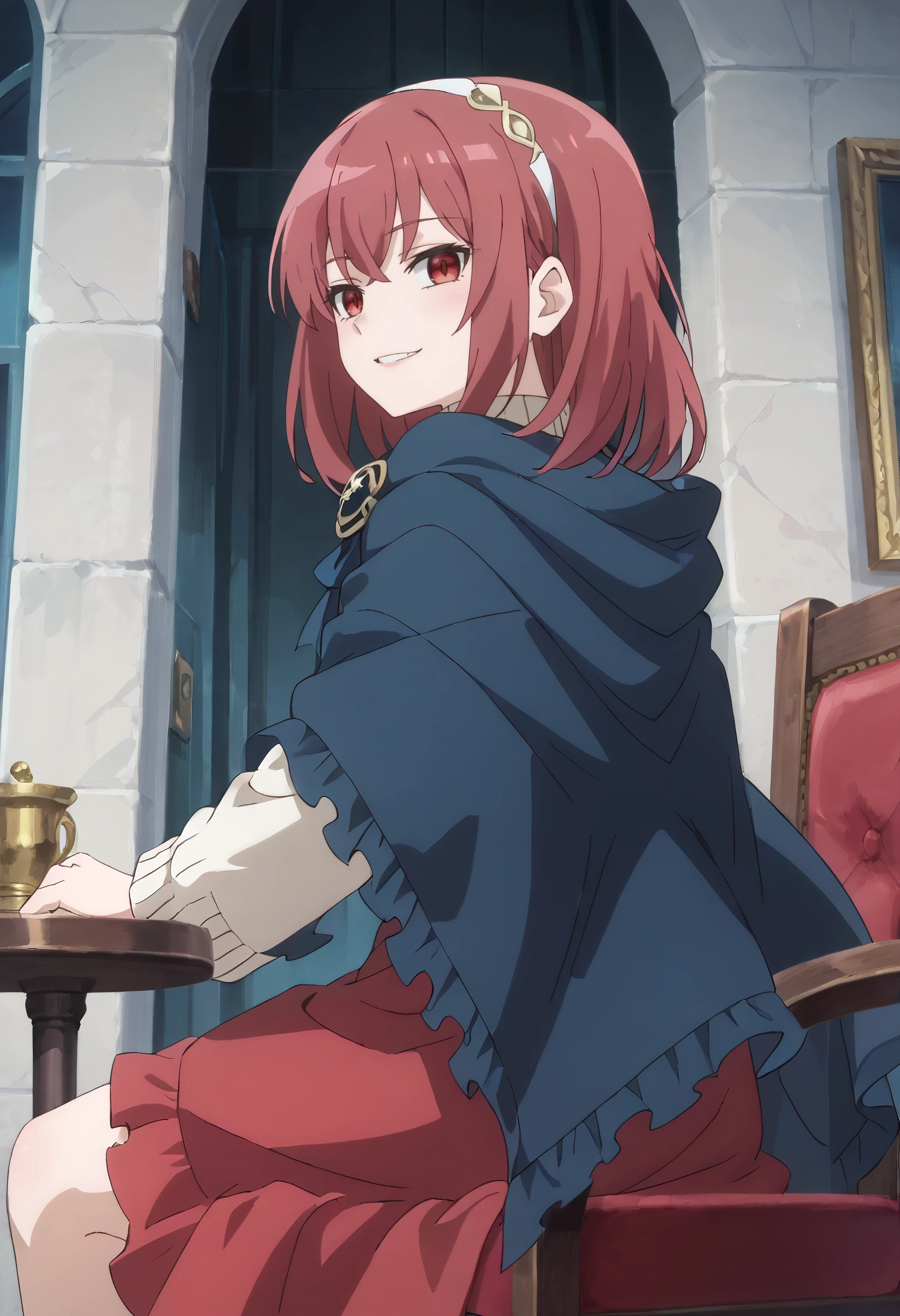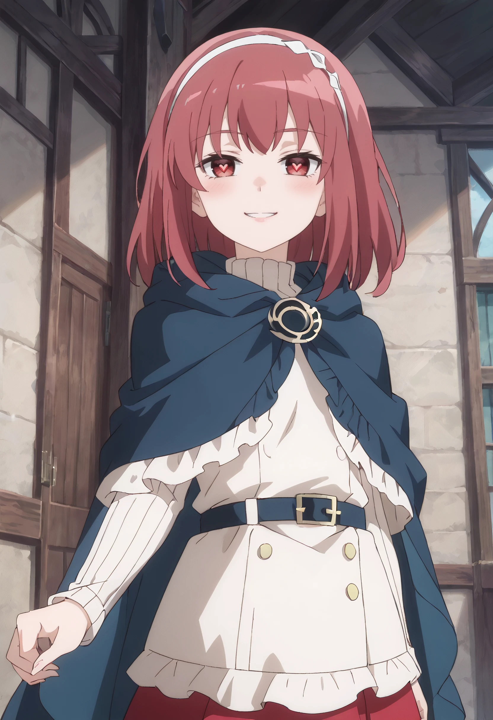cape, hairband, capelet, dress, skirt, hood, hood down, long sleeves, white hairband, red skirt, black cape, sweater, white sweater,