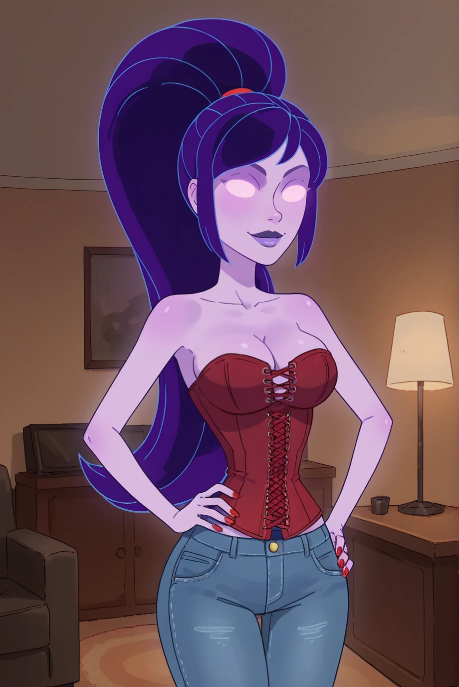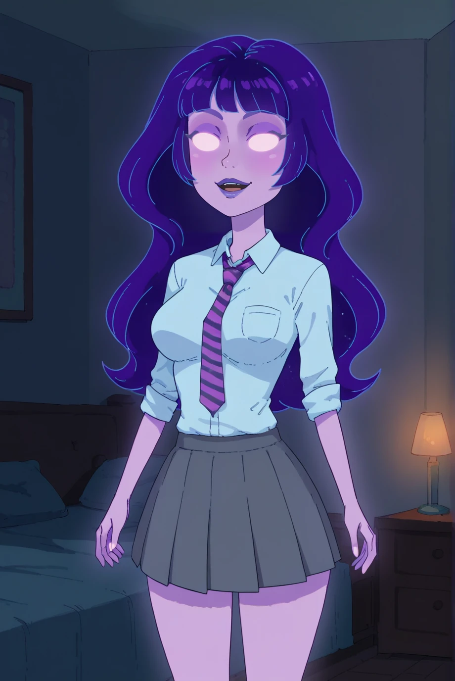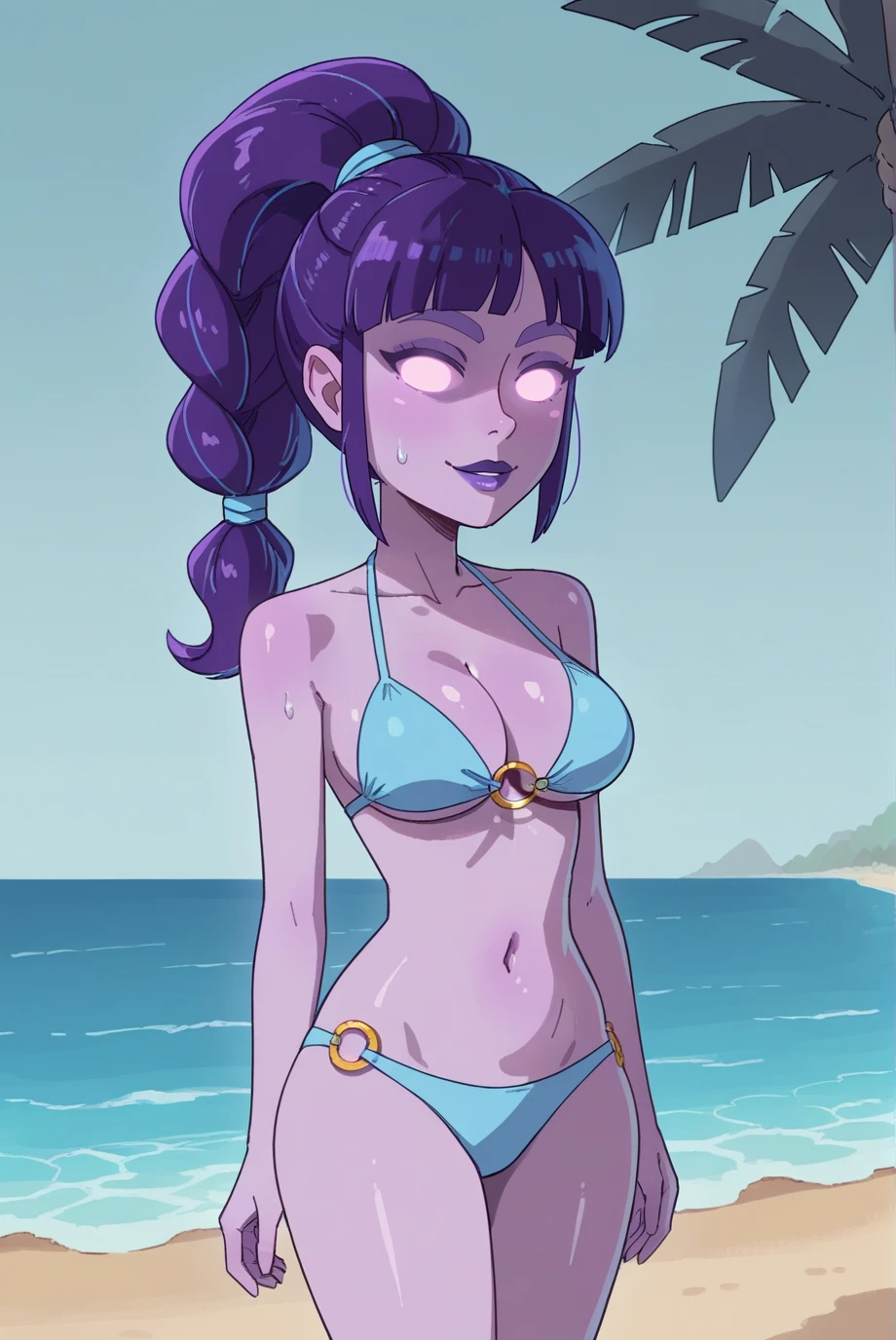 <lora:SupernovaXL-v2-07:0.7>, ChopioSupernova, purple hair, glowing, purple skin, glowing eyes, no pupils, purple lips, balls, looking at viewer,Outfit 1 (Default Outfit):