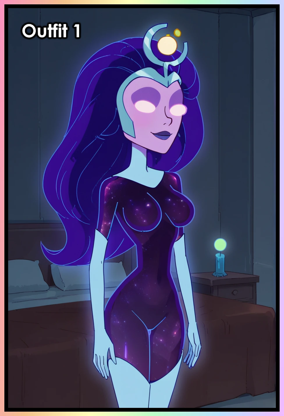 tiara, purple bodysuit, skin tight, detached collar, blue elbow gloves, thigh boots, blue footwear,Description