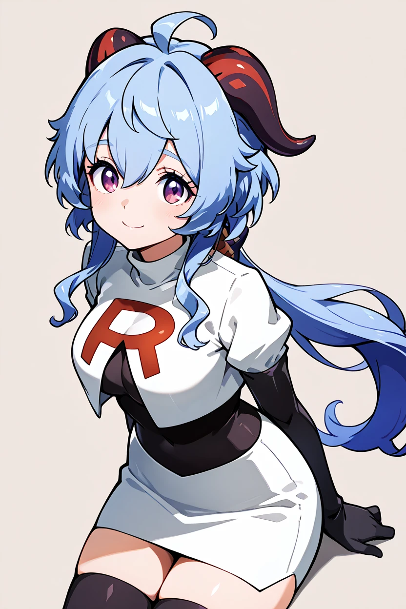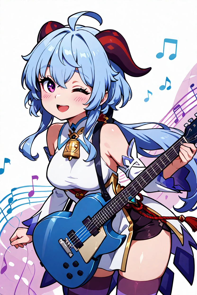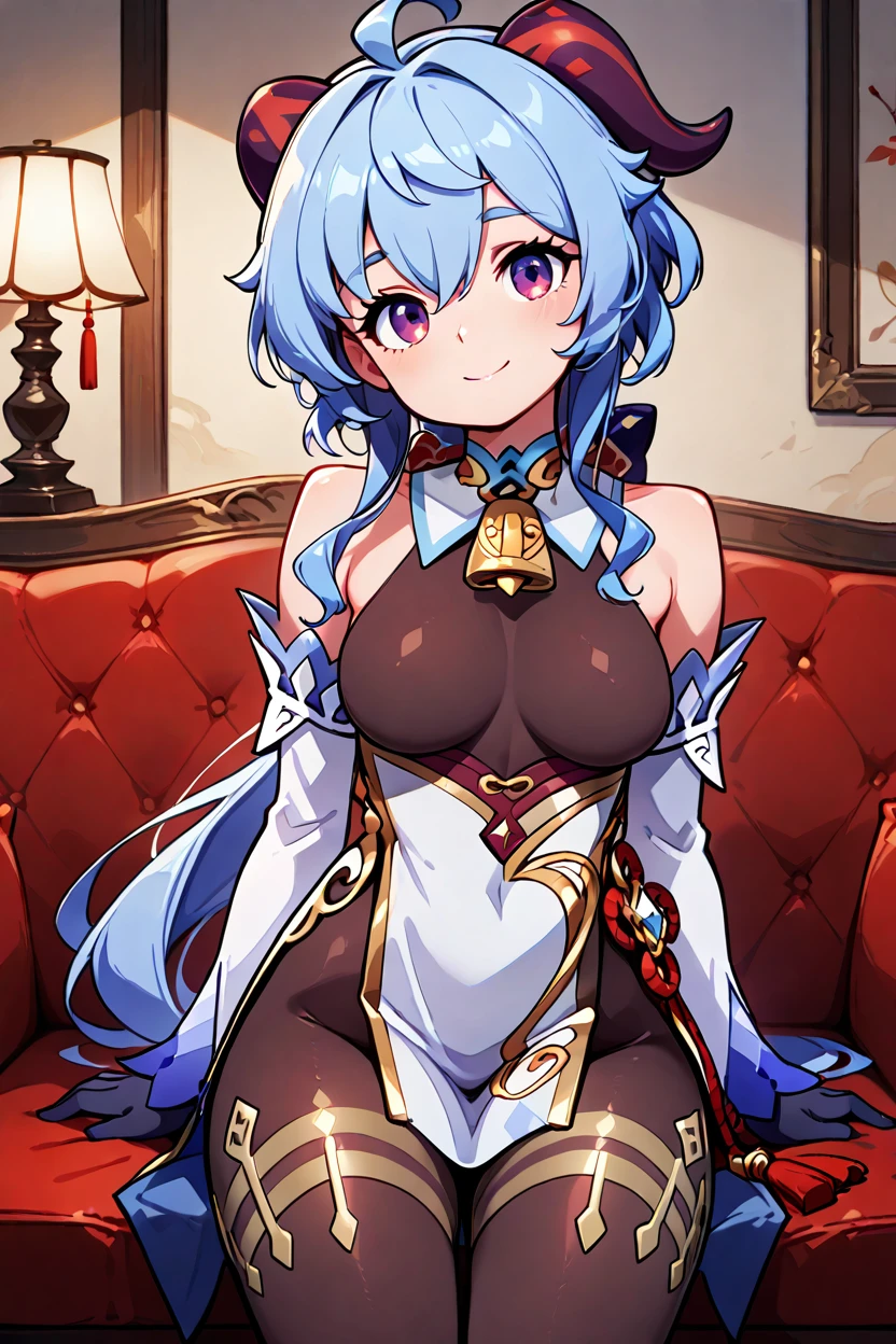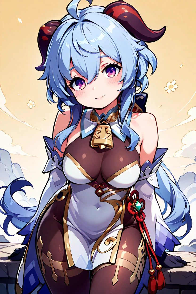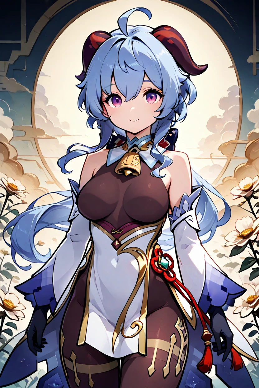 zzGanyu, hair between eyes, purple eyes, ahoge, blue hair, goat horns, horns, long hair, low ponytail, bare shoulders, neck bell, bodystocking, white dress, gold trim, flower knot, detached sleeves, black gloves, pelvic curtain, thighlet, pantyhose,