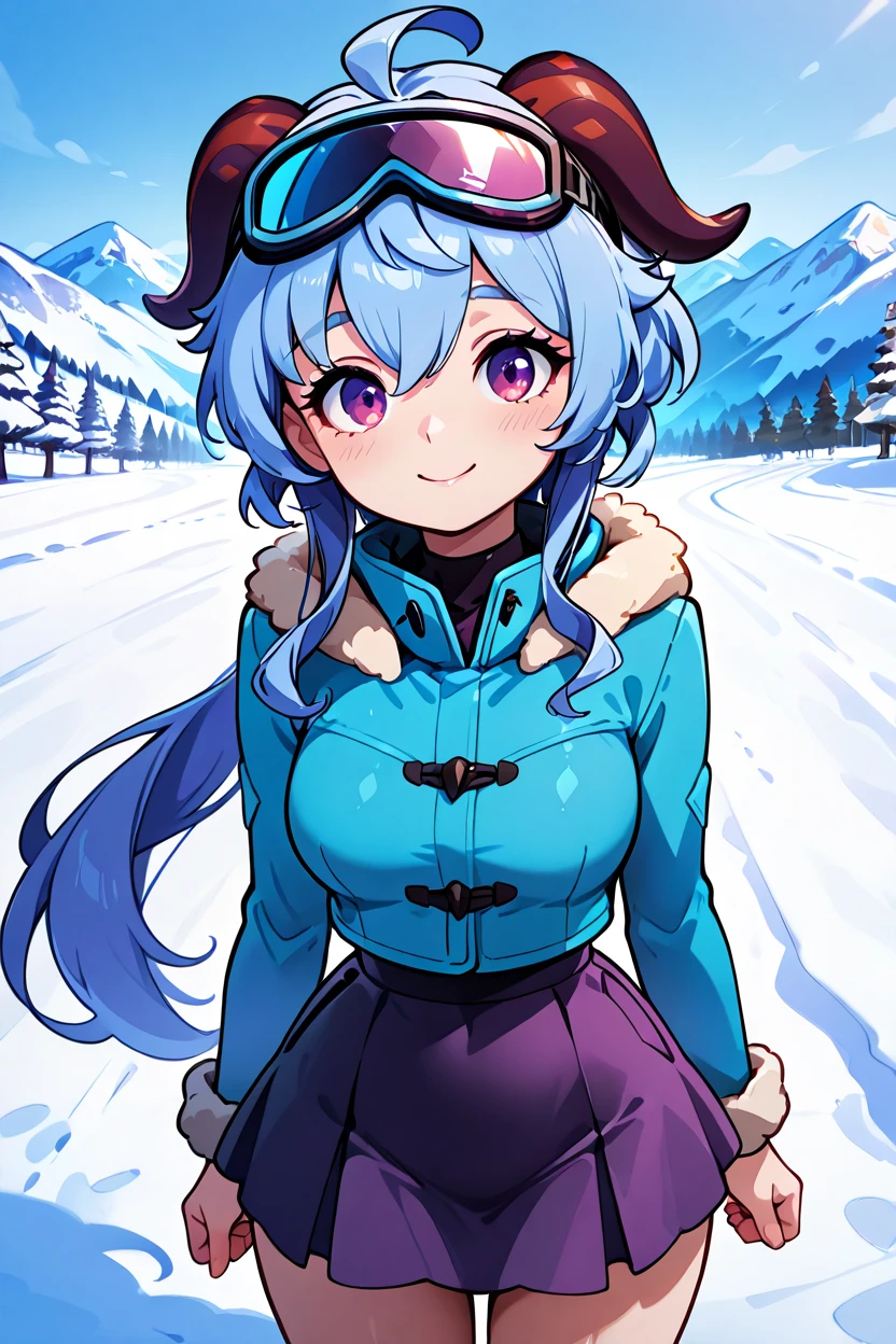zzGanyu, hair between eyes, purple eyes, ahoge, blue hair, goat horns, horns, long hair, low ponytail,