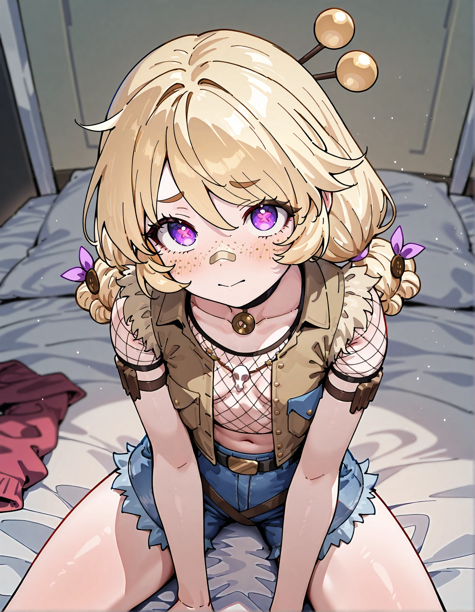 1girl, immybisou, blonde hair, brown vest, x-shaped pupils, blue shorts, fishnets, highleg, stomach tattoo, bandaid on nose, frecklesDescription
