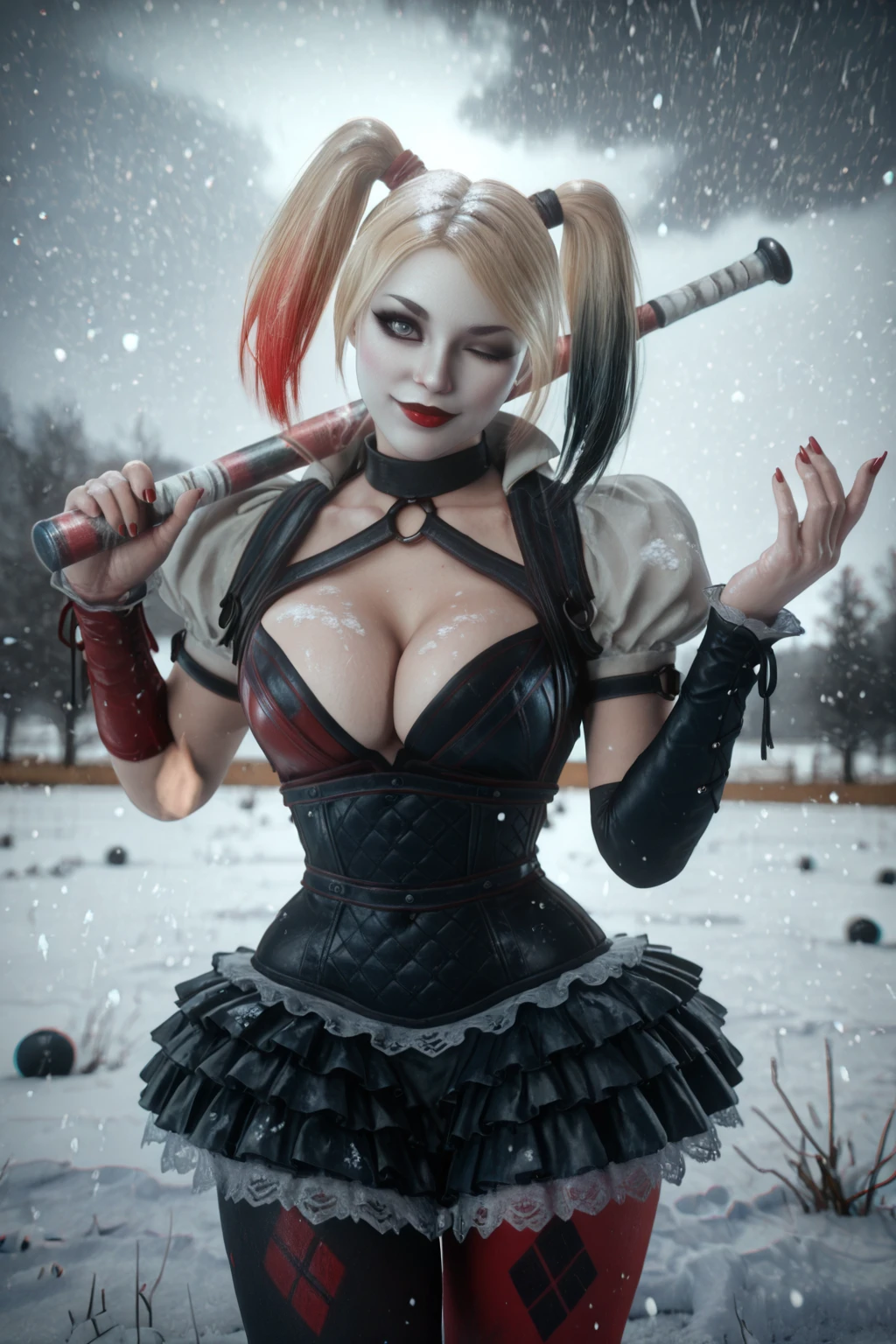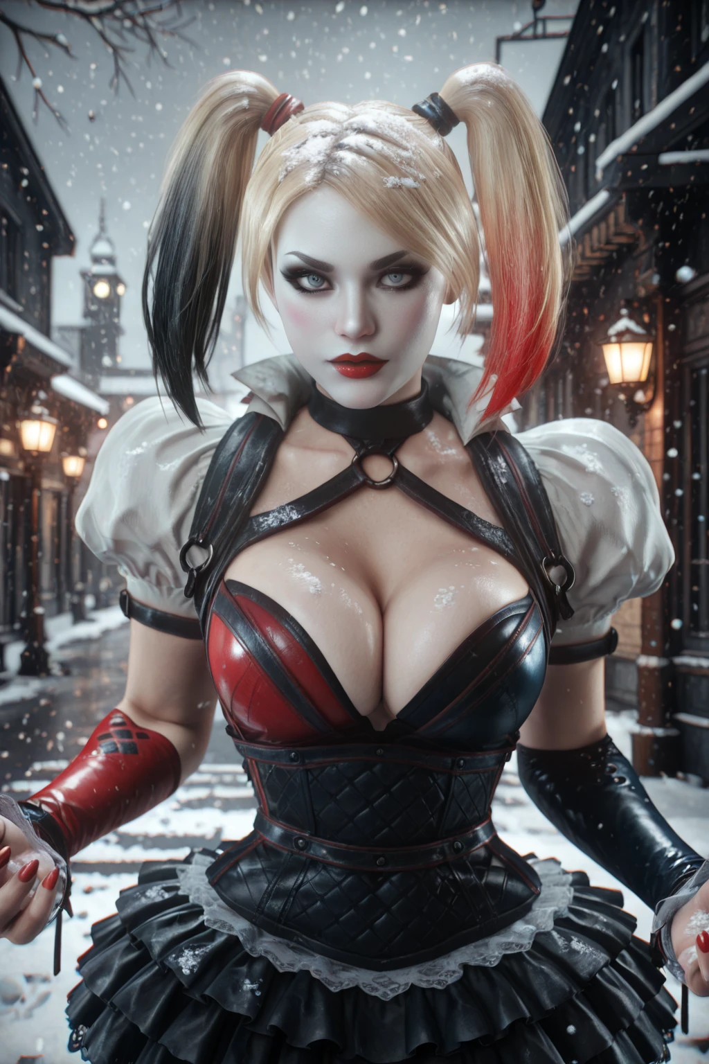 Harley Quinn, long hair, blue eyes, blonde hair, twintails, pale skin, eyeshadow, eyeliner, red lips, large breasts, multicolored hair, dress, cleavage, detached sleeves, choker, puffy short sleeves, frilled skirt, corset, lace, criss-cross halter, lace-trimmed skirt, rhombus ornament, corset outfit, white makeup, black and red leggins, black and red elbow gloves, multicolored clothes, black skirt, pantyhose, ankle boots