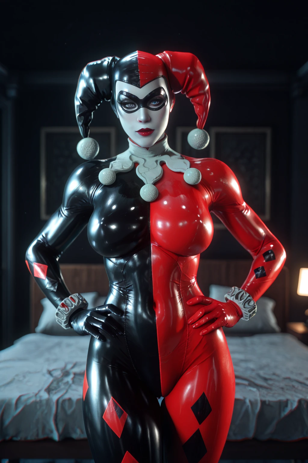 Harley Quinn, blue eyes, jester cap, large breasts, skin tight, pale skin, domino gloves, mask, multicolored bodysuit, two-tone bodysuit, jester, jester bodysuit, multicolored bodysuit, red and black bodysuit, white makeup, rhombus ornament, makeup