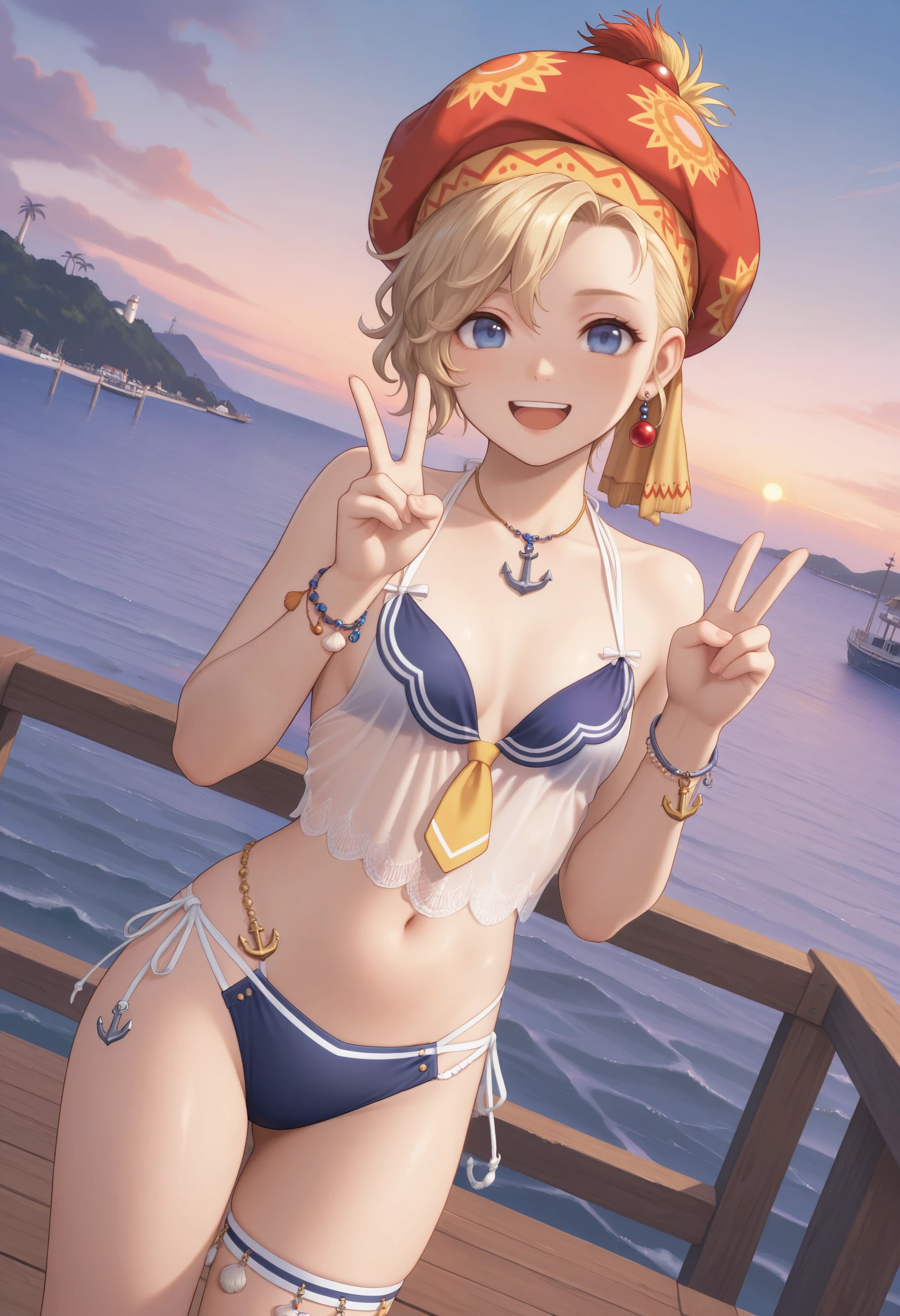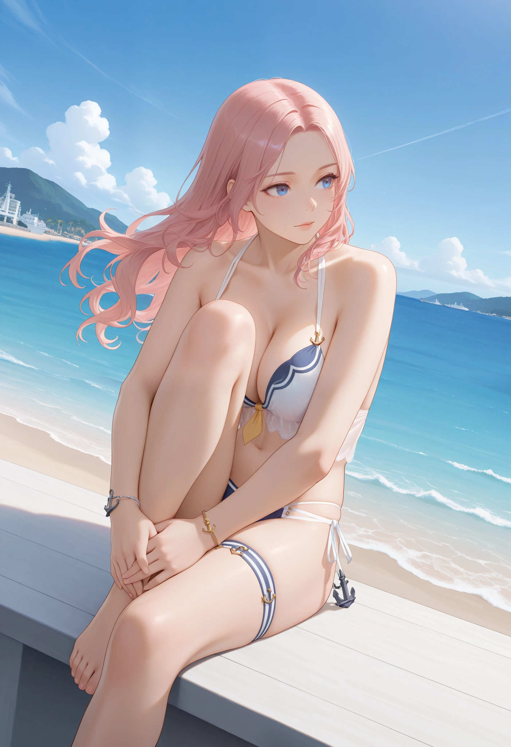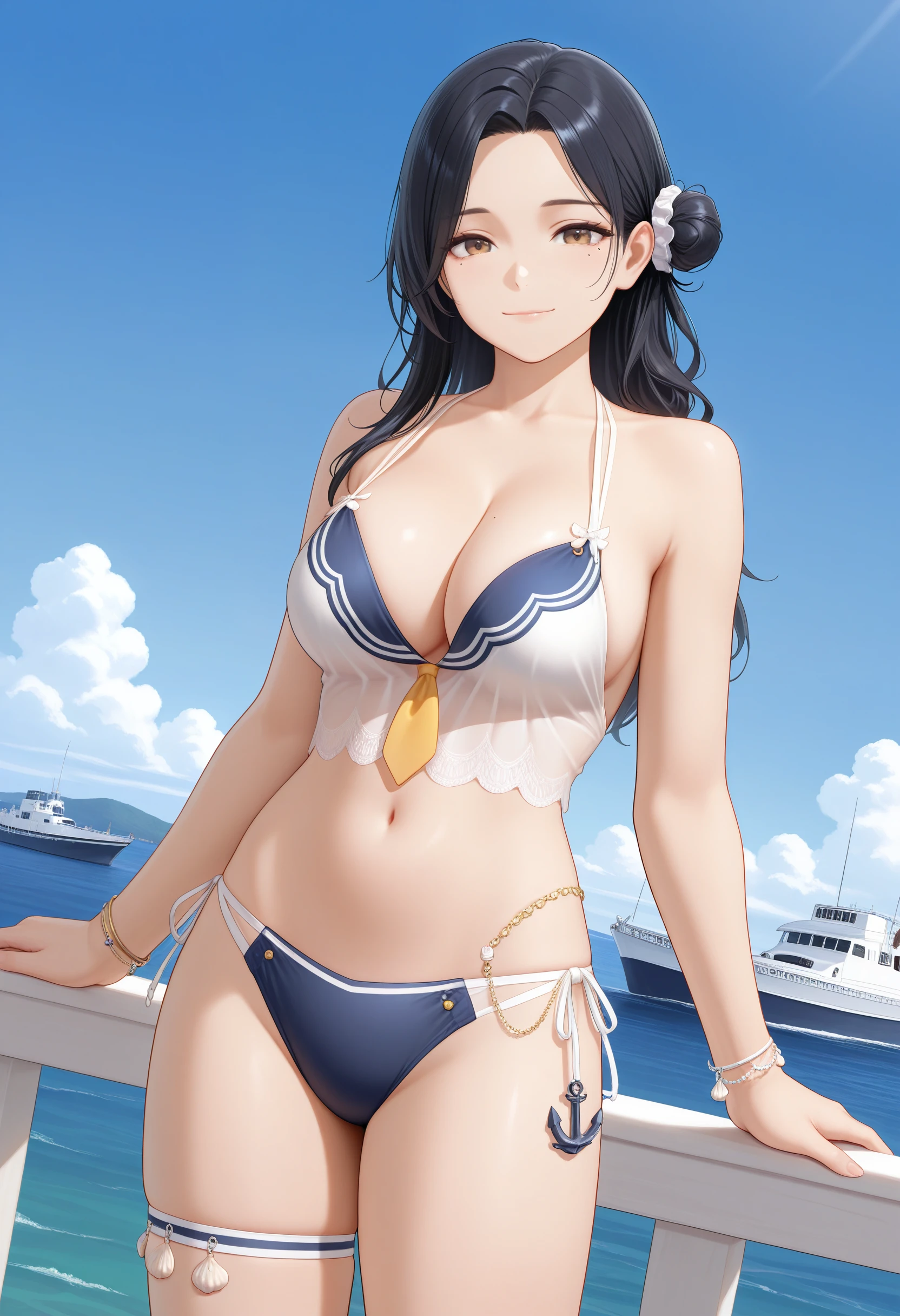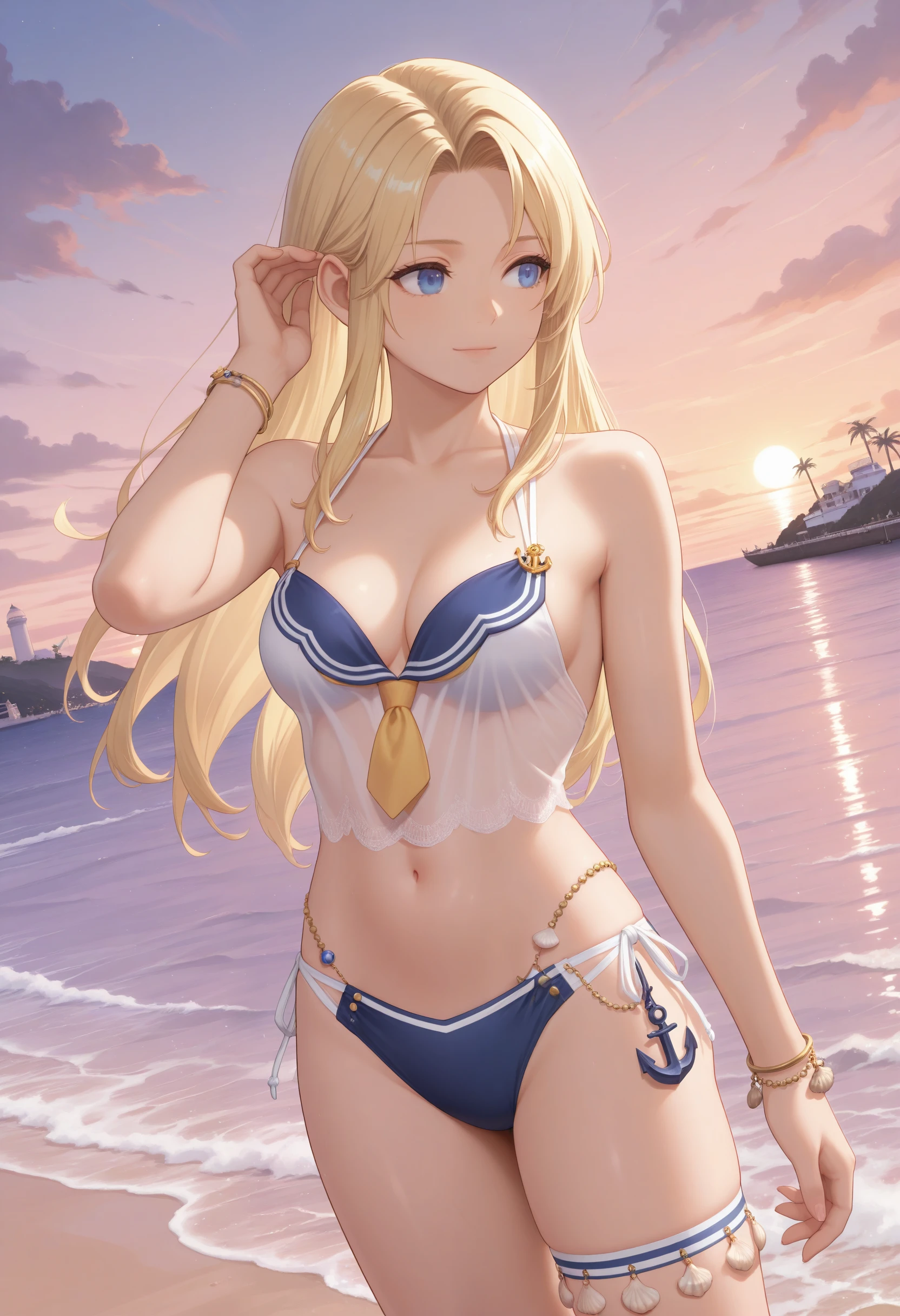 基本プロンプト:"navy and white bikini top,bracelet,yellow tie,anchor bracelet,navy side-tie bikini bottom,thigh strap,shell chain strap"