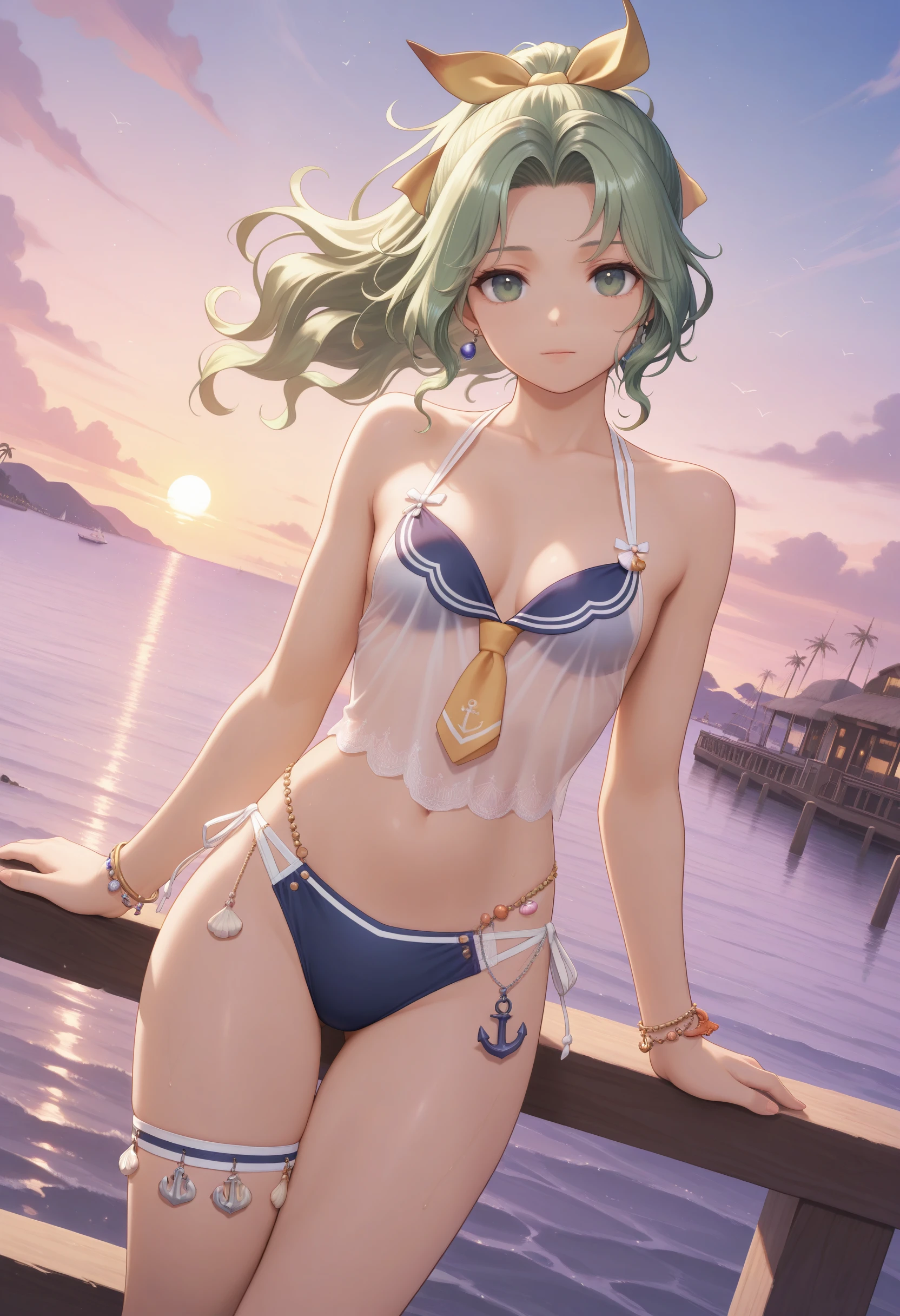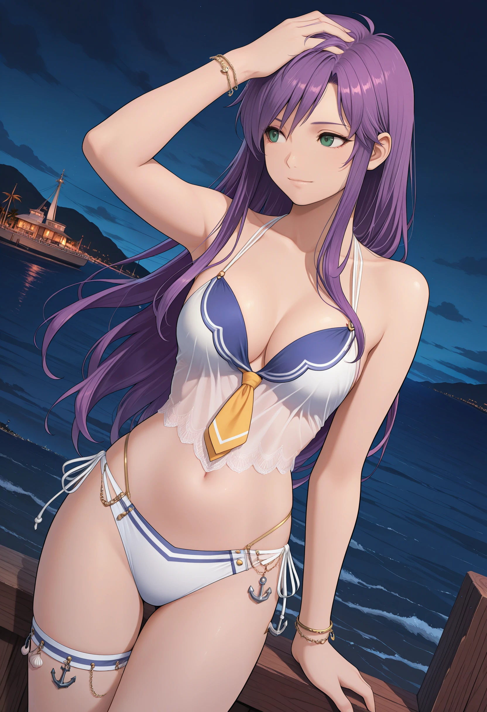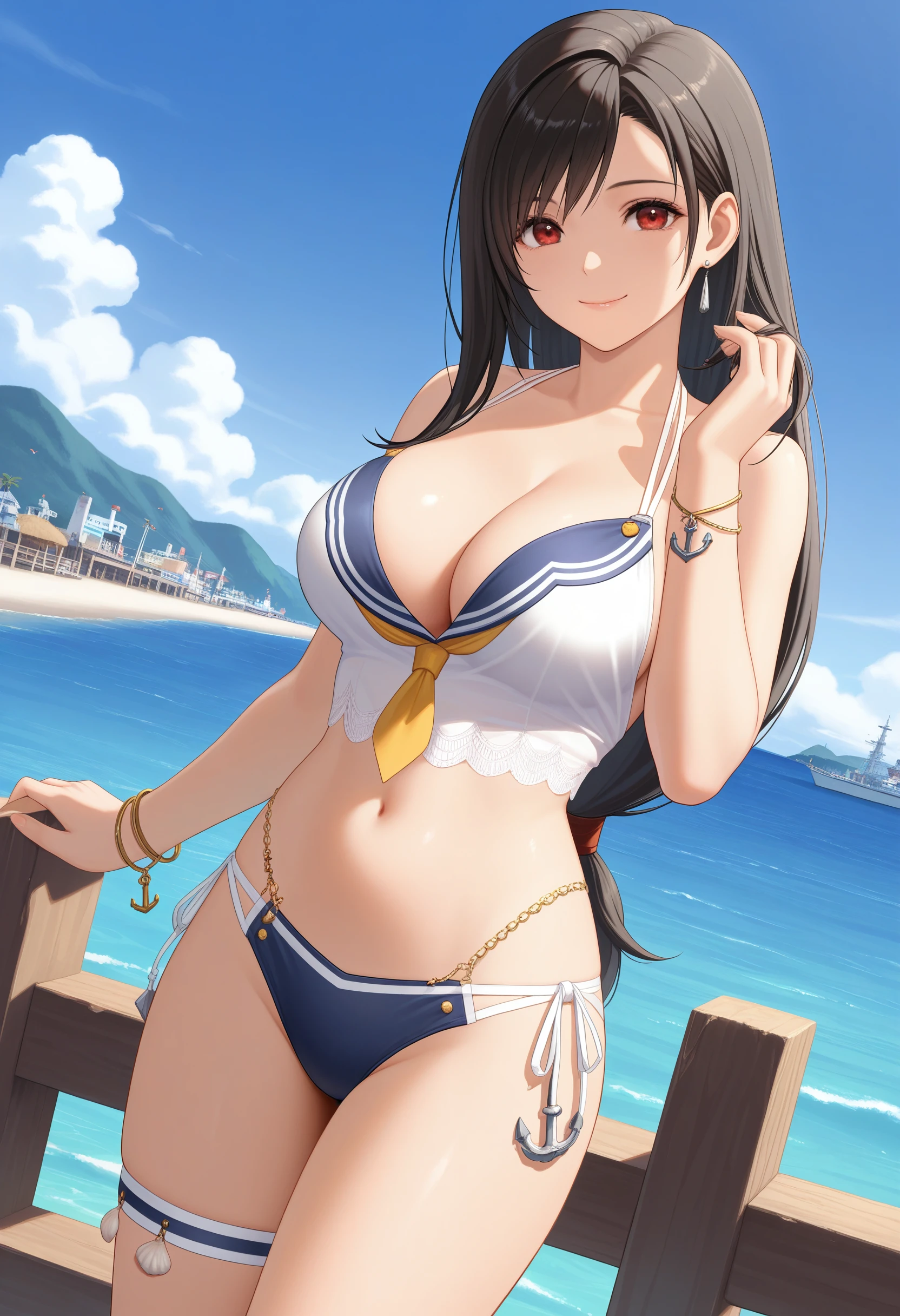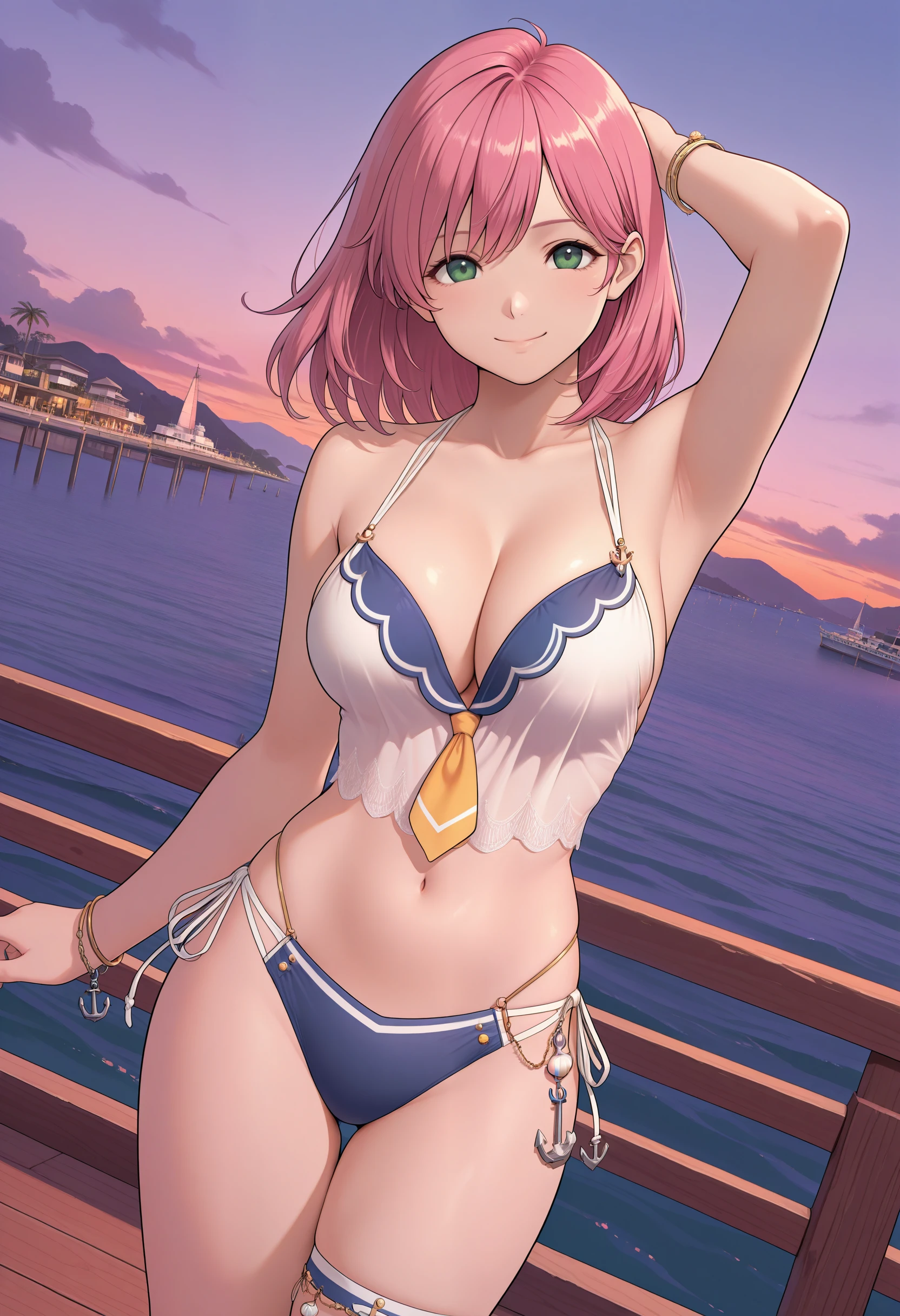 基本プロンプト:"navy and white bikini top,bracelet,yellow tie,anchor bracelet,navy side-tie bikini bottom,thigh strap,shell chain strap"